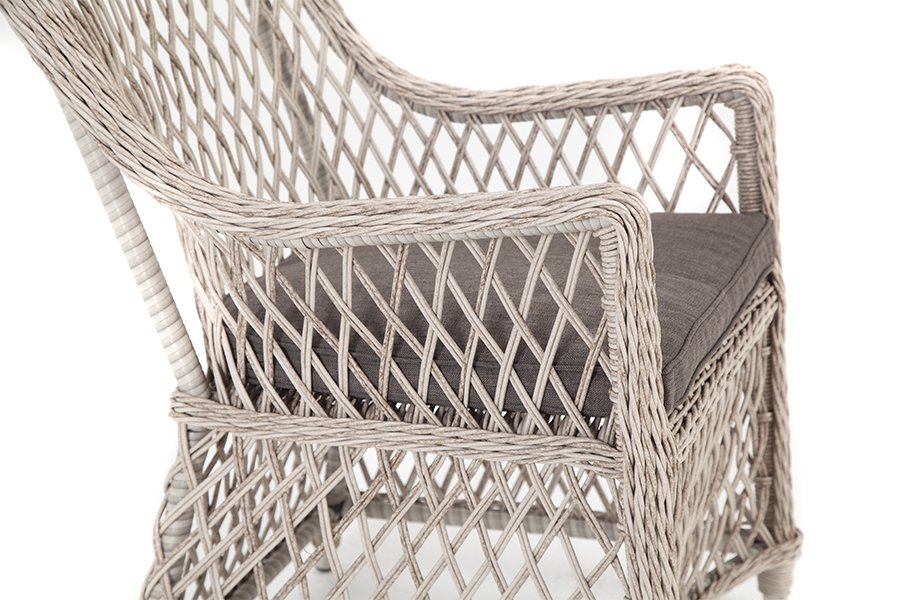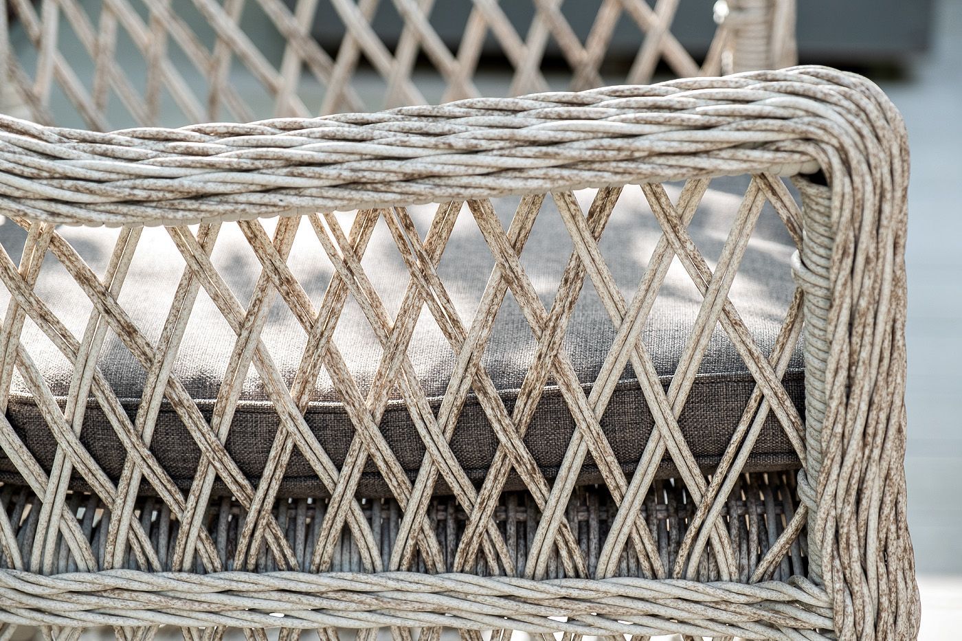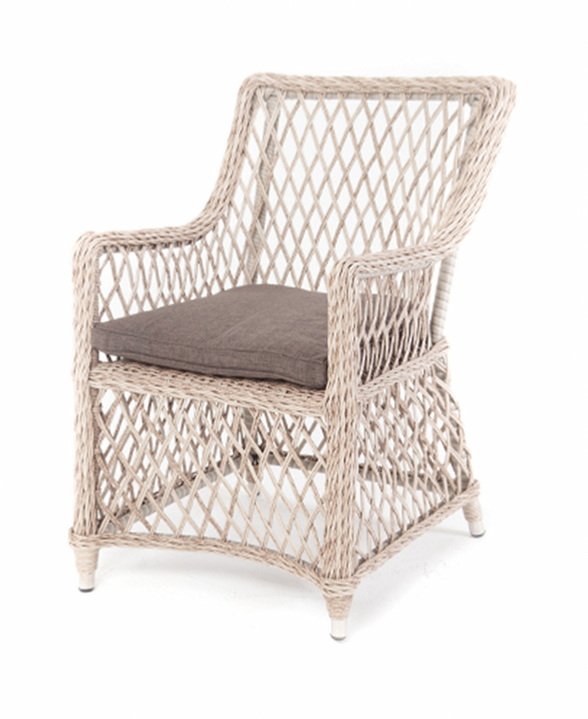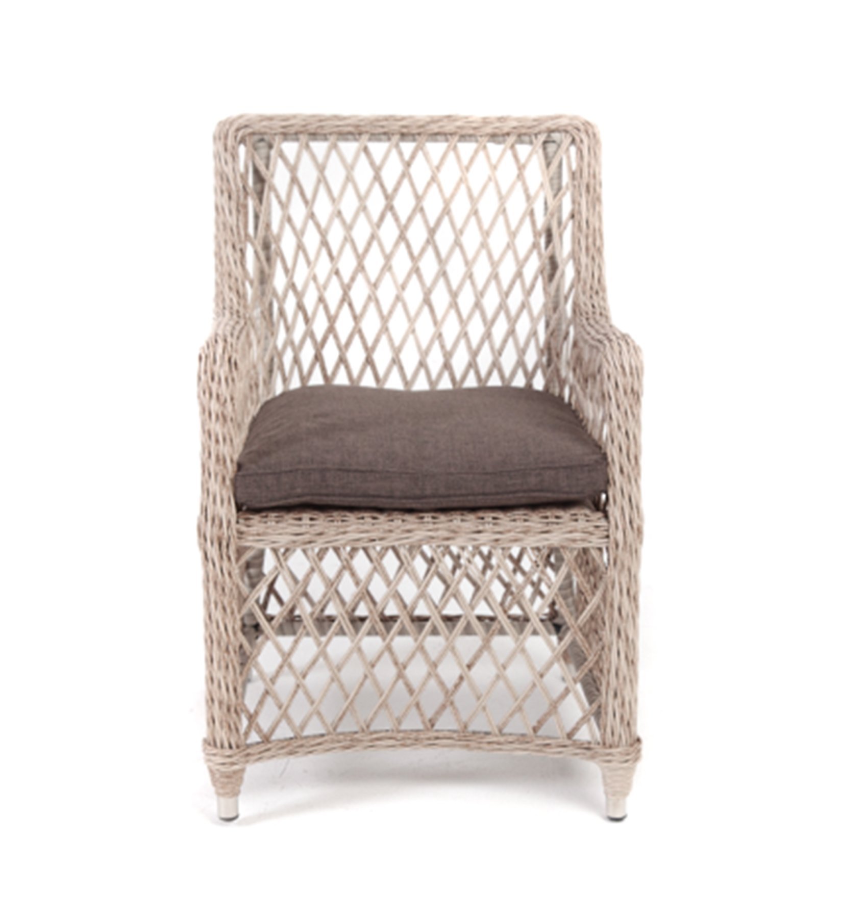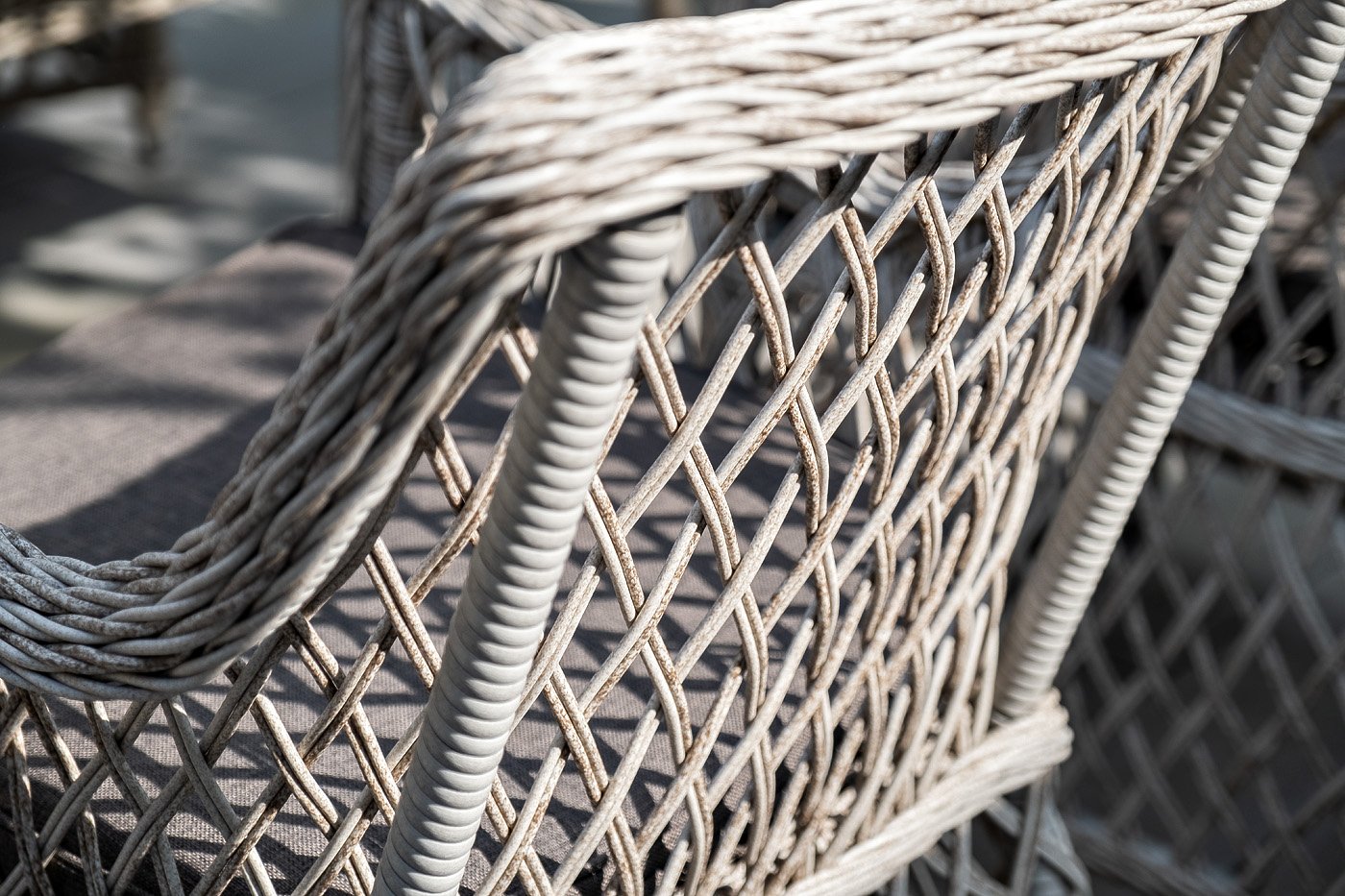 Каркас сделан из прочного алюминия. Сверху конструкции - ручное плетение из круглого искусственного ротанга. Стул бежевого цвета.