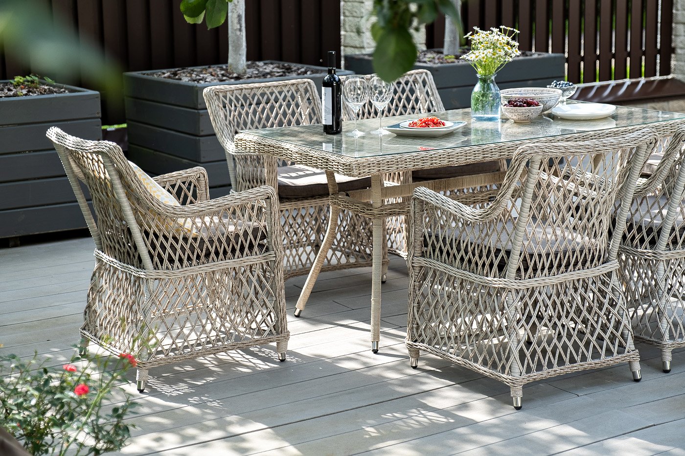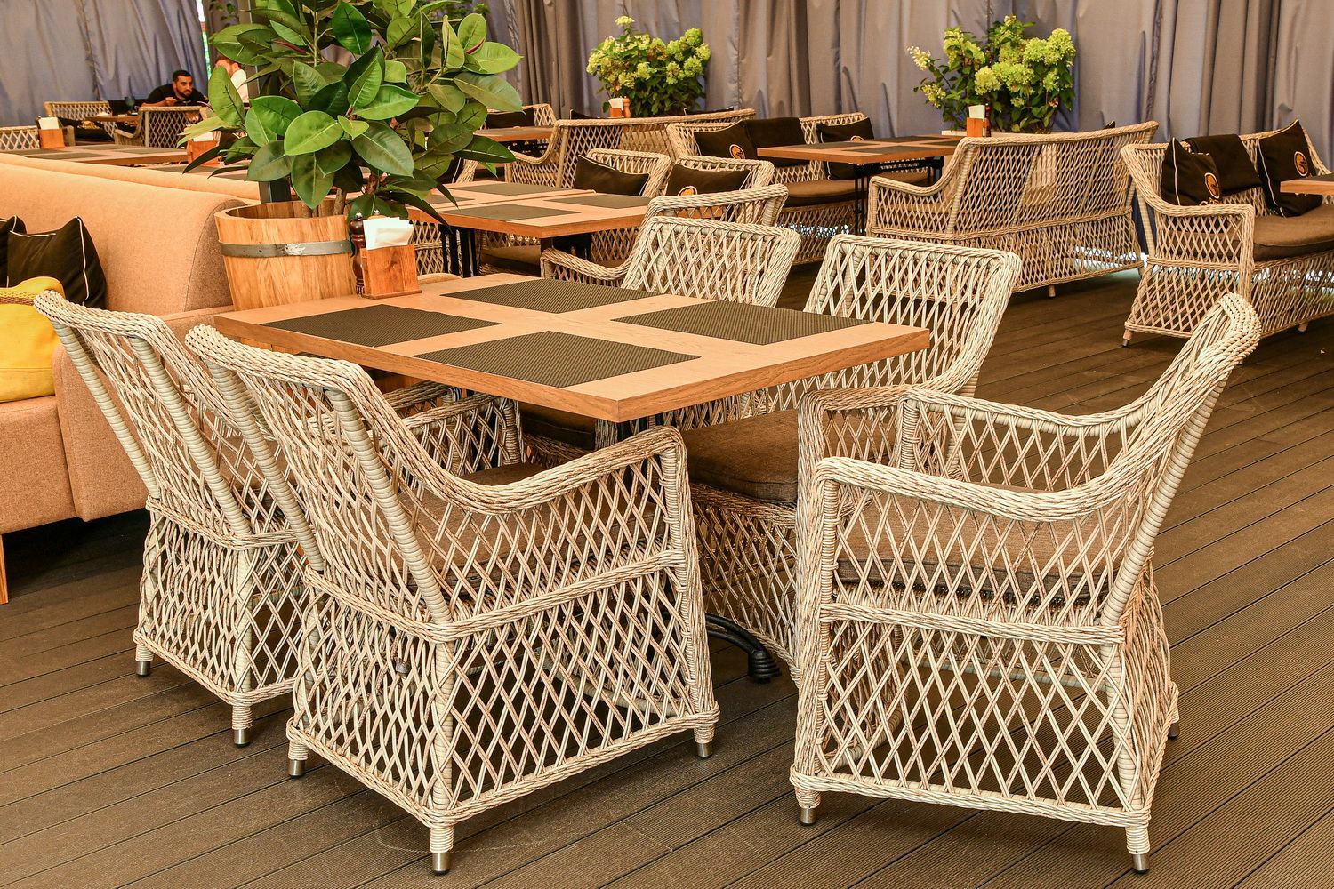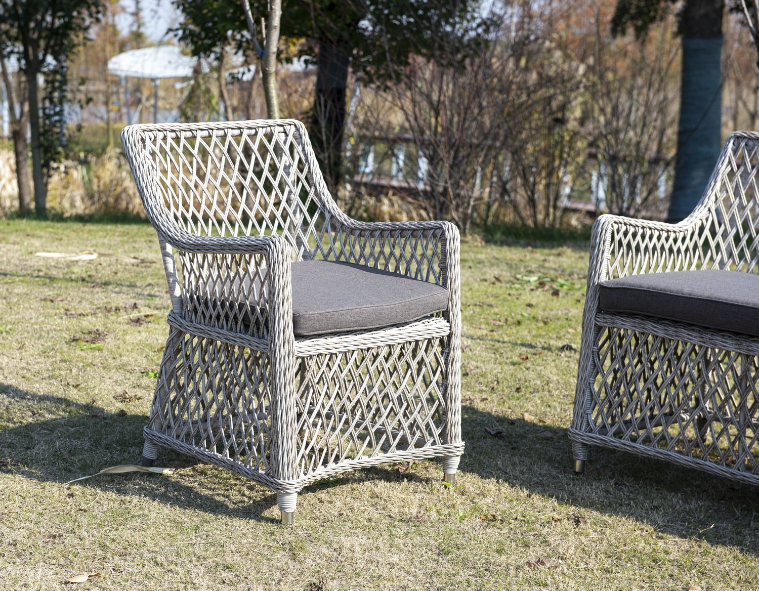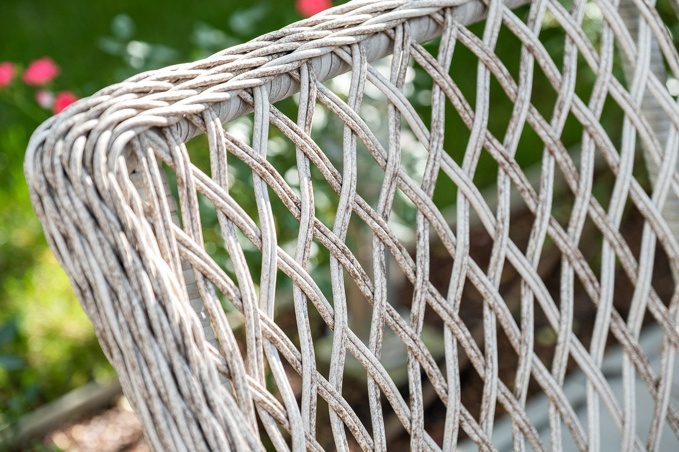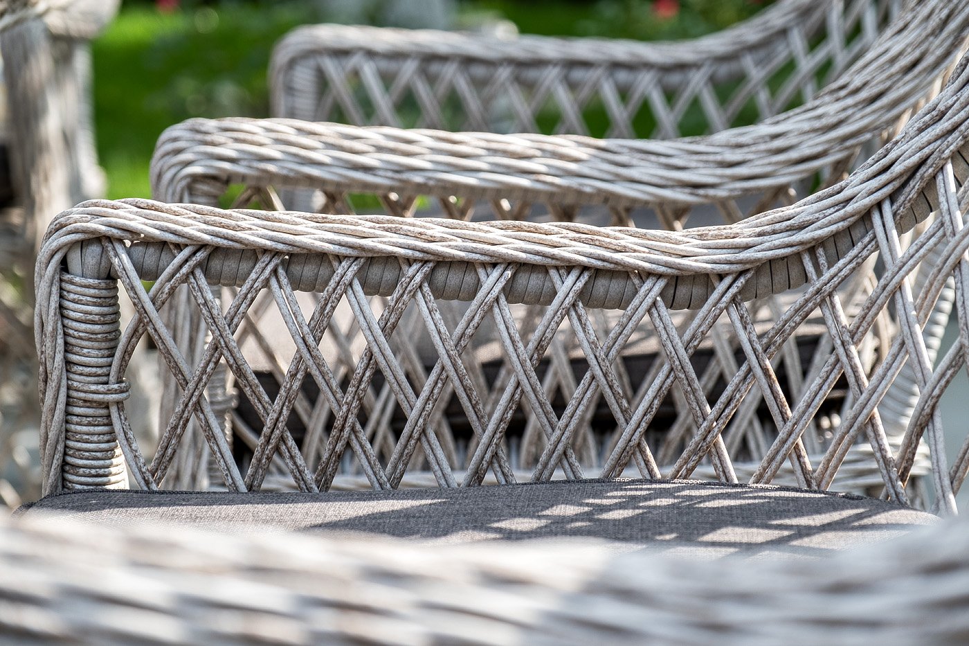 Каркас сделан из прочного алюминия. Сверху конструкции - ручное плетение из круглого искусственного ротанга. Стул бежевого цвета.