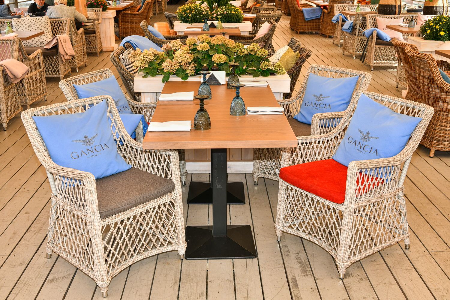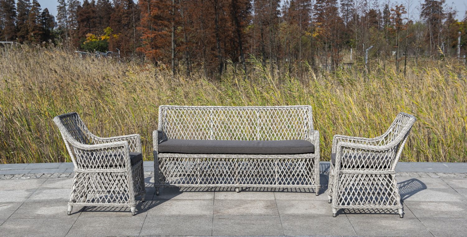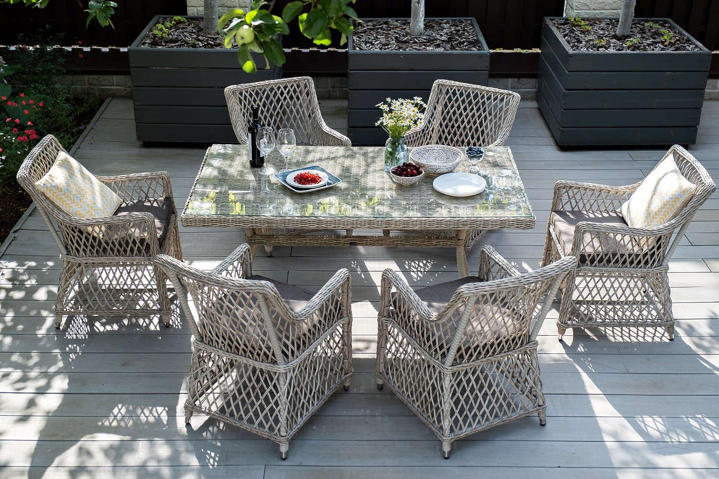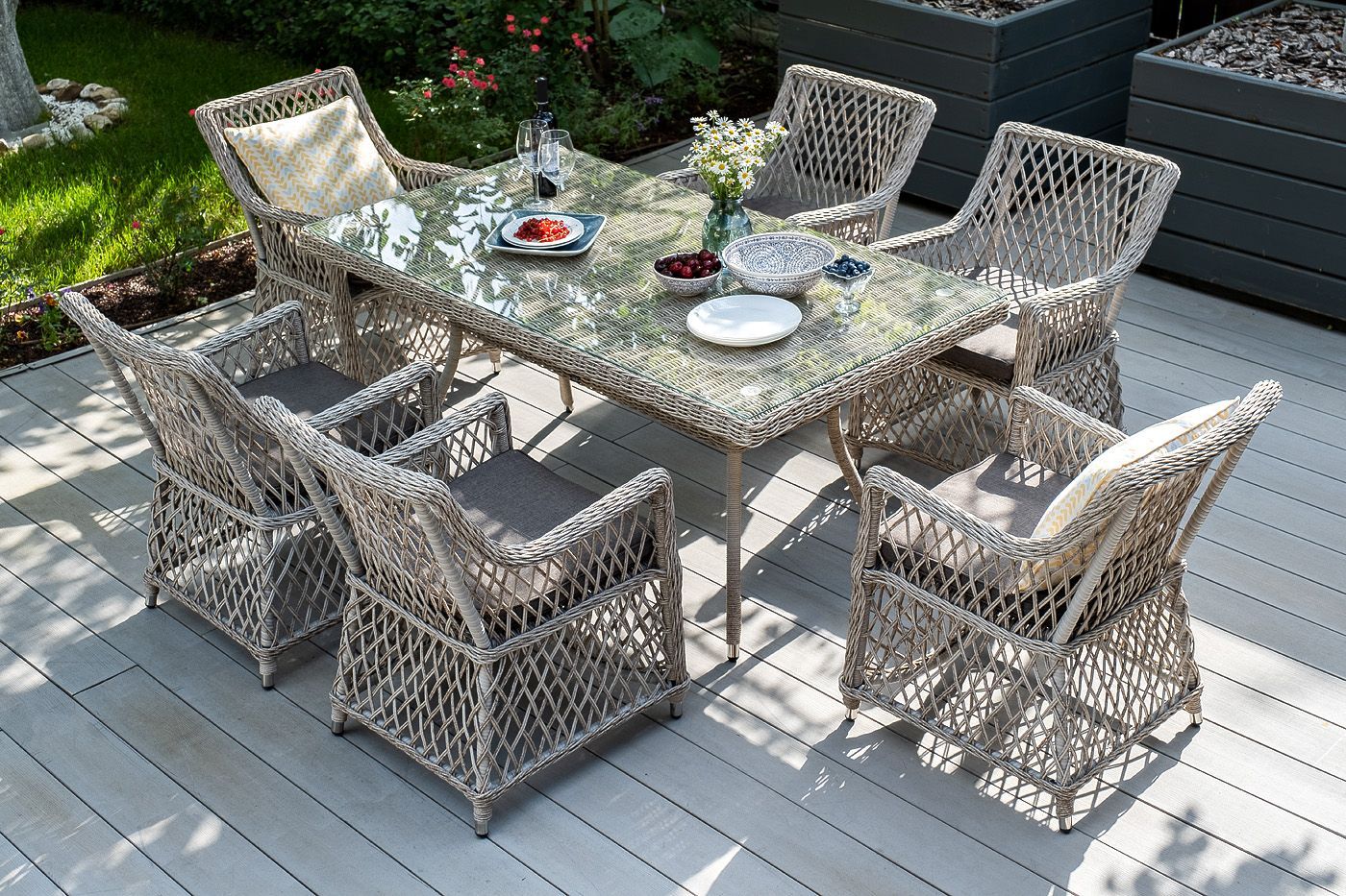 Каркас сделан из прочного алюминия. Сверху конструкции - ручное плетение из круглого искусственного ротанга. Стул бежевого цвета.