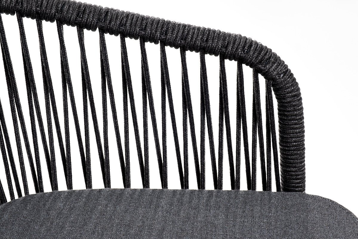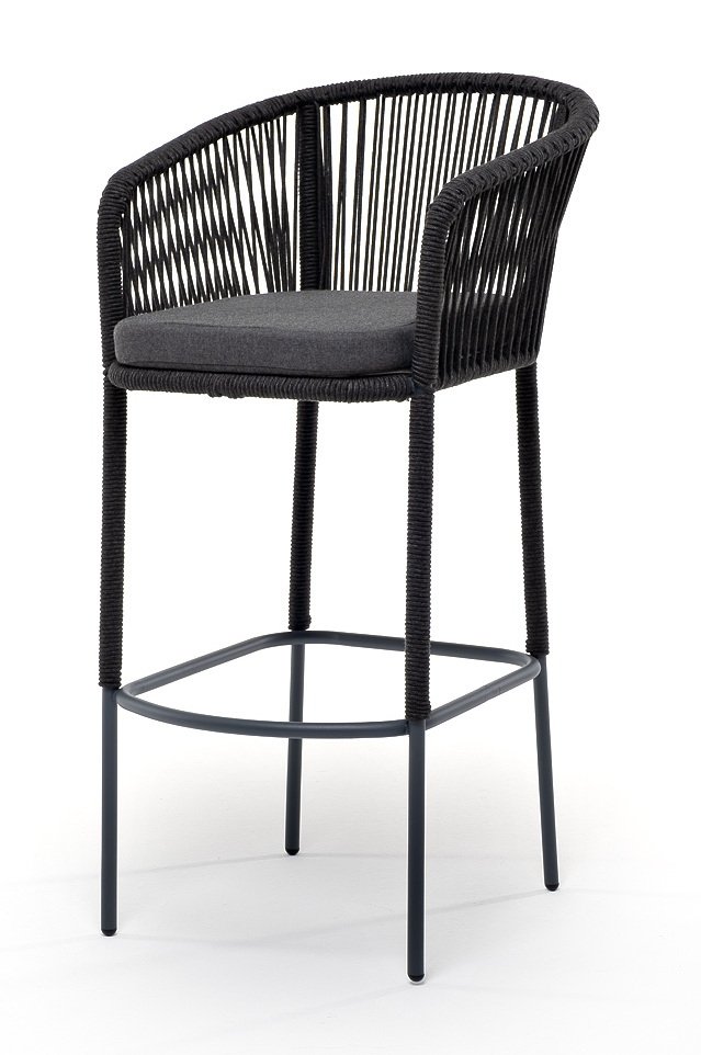 Барный стул «Марсель» представлен в стальном каркасе темно-серого (RAL7024) цвета, оплетен вручную эластичными синтетическими лентами из высокопрочных полиэфирных волокон, темно-серого оттенка, размер стула: 590×705×1070 мм. Высота сидения без подушки – 730 мм.
