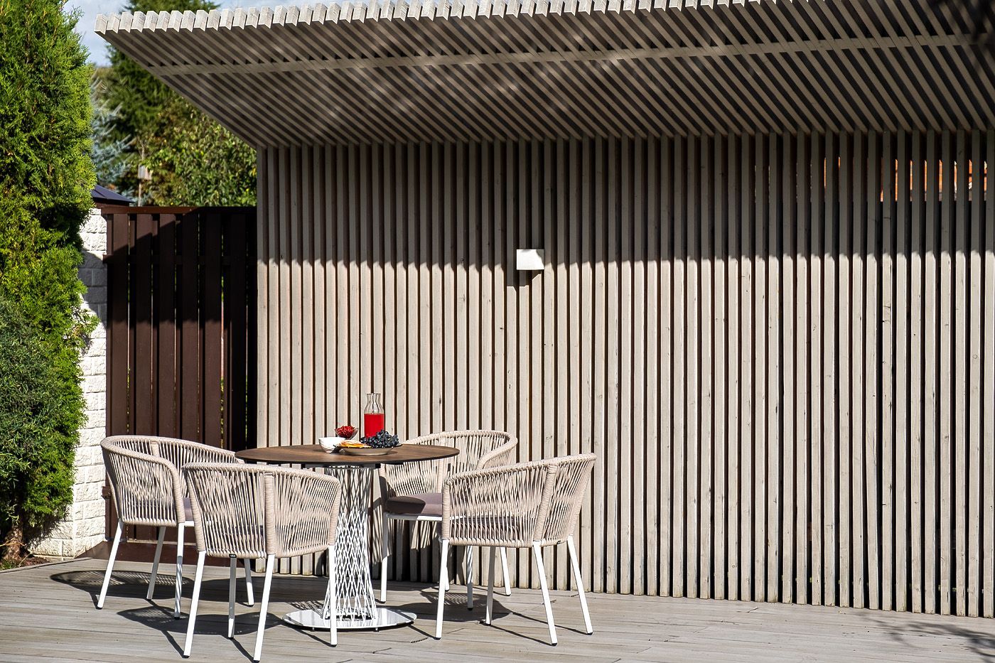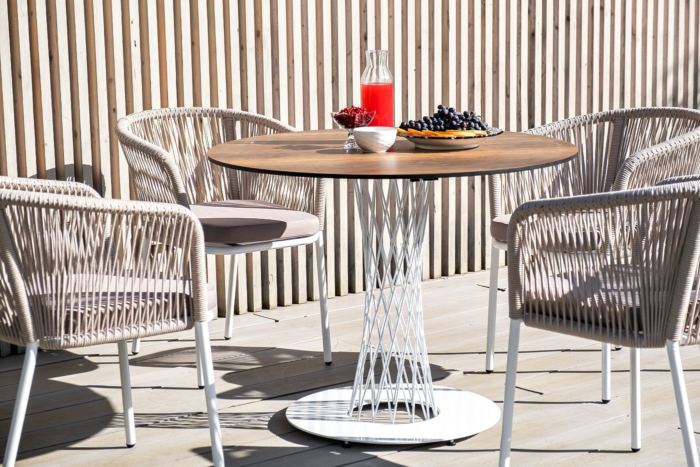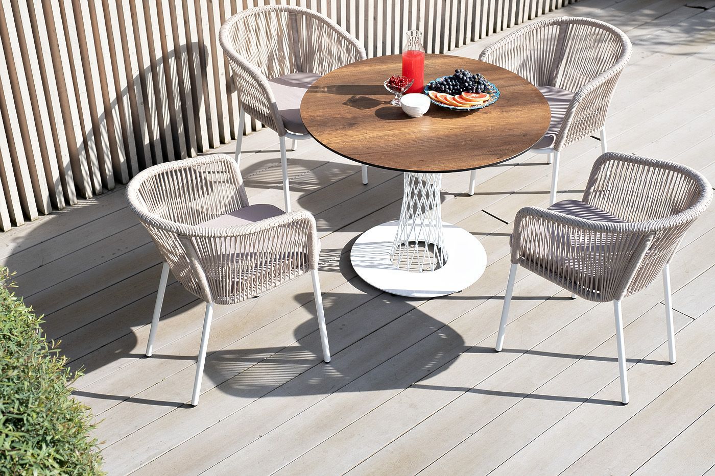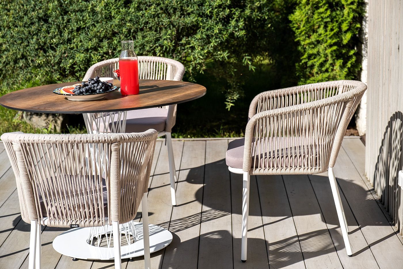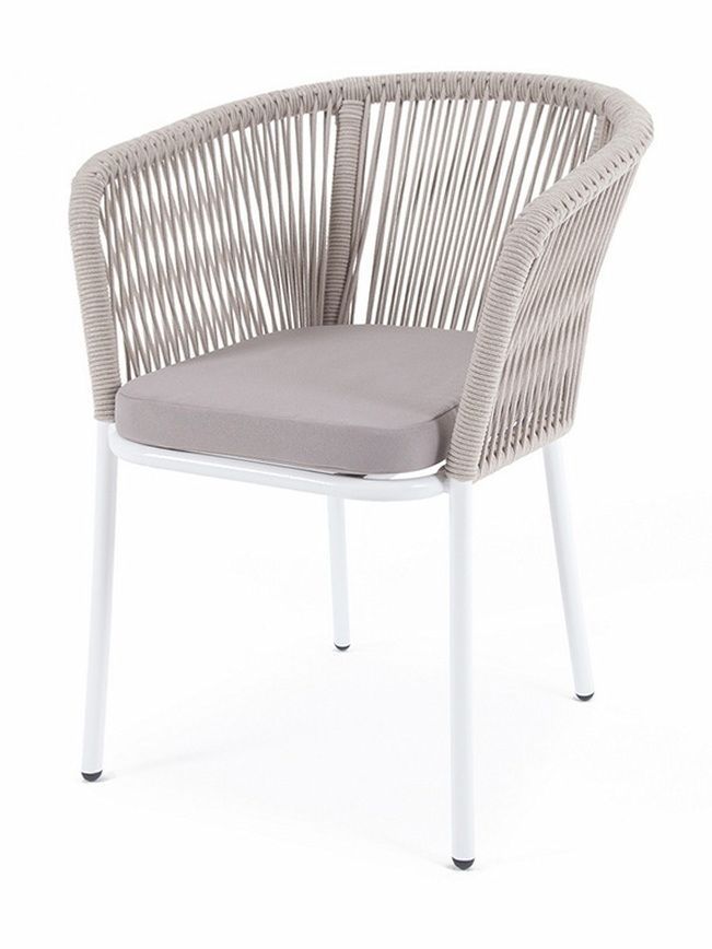 Плетеный стул из коллекции «Марсель» представен в светлых тонах. Каркас из прочного алюминия окрашен порошковой краской в белый цвет, ручная оплетка - роуп бежевого оттенка.