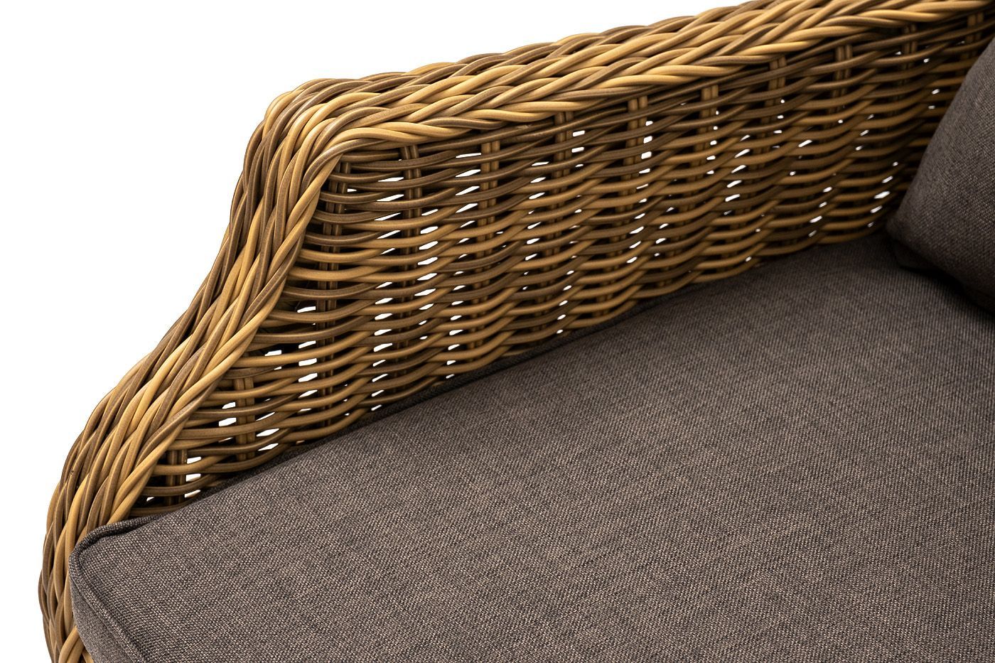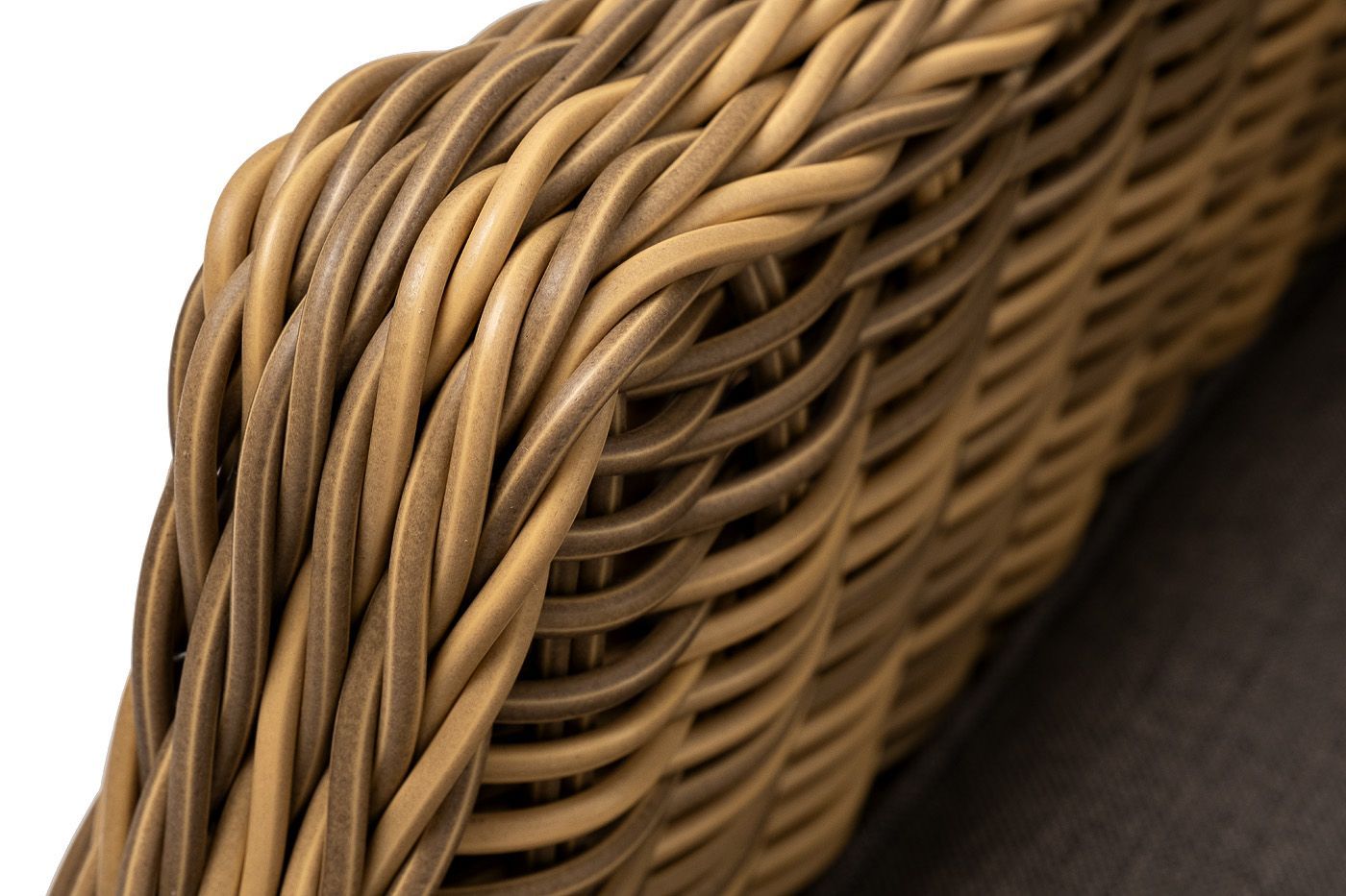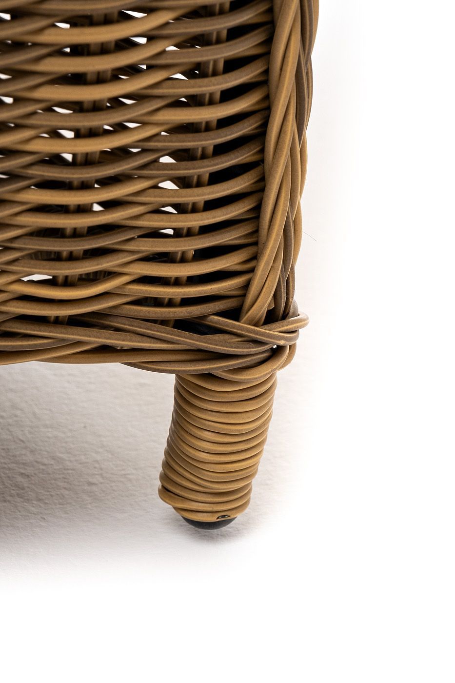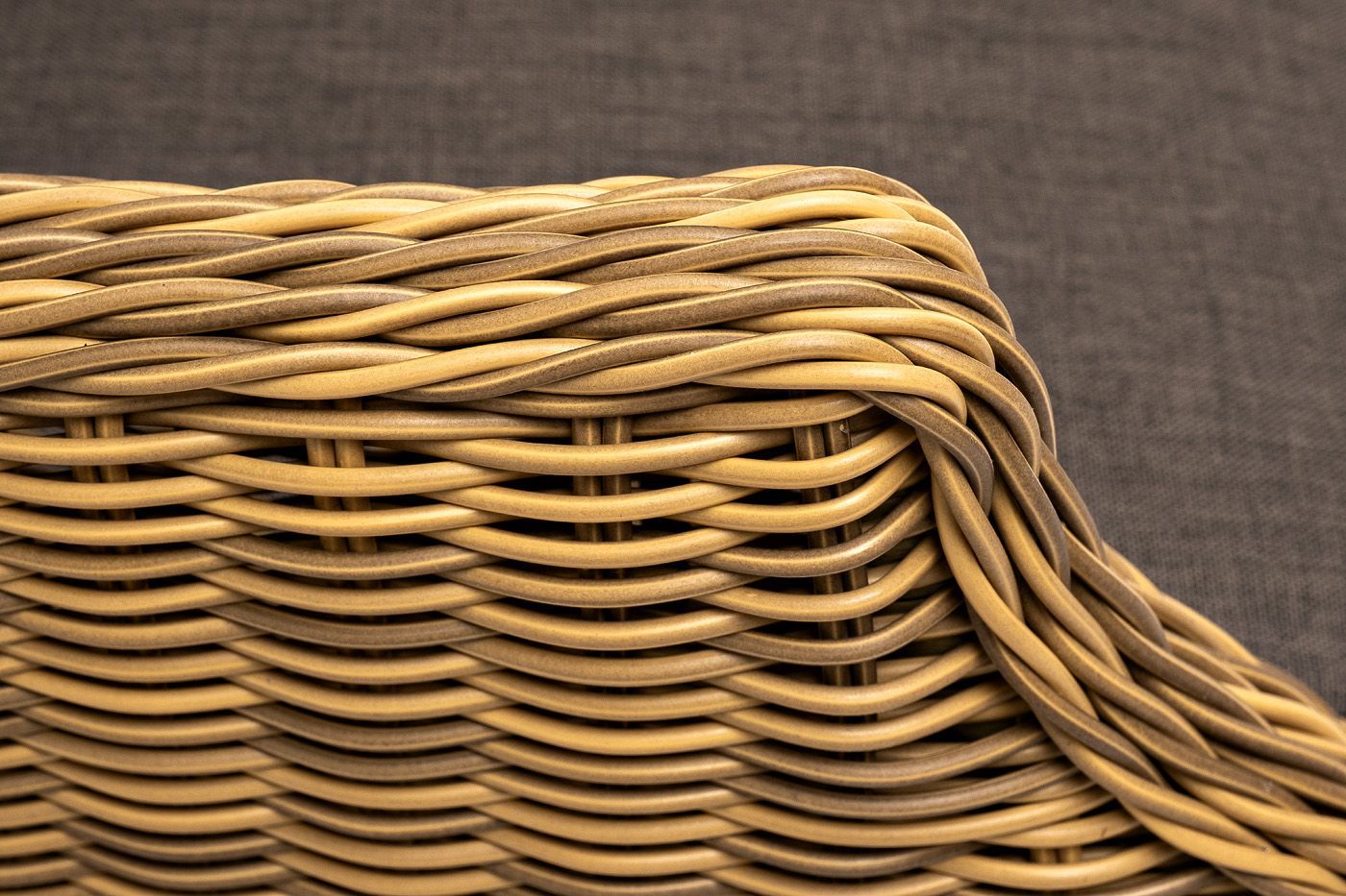Спинка и подлокотники имеют планые линии, благодаря своим закругленным формам. Каркас мебели сделан из алюминия. Присутствует ручное круглое плетение, при изготовлении которого используется искусственный ротанг. Представлено в соломенном цвете.