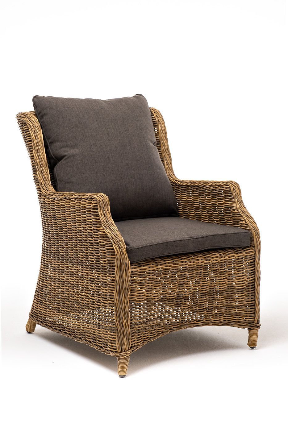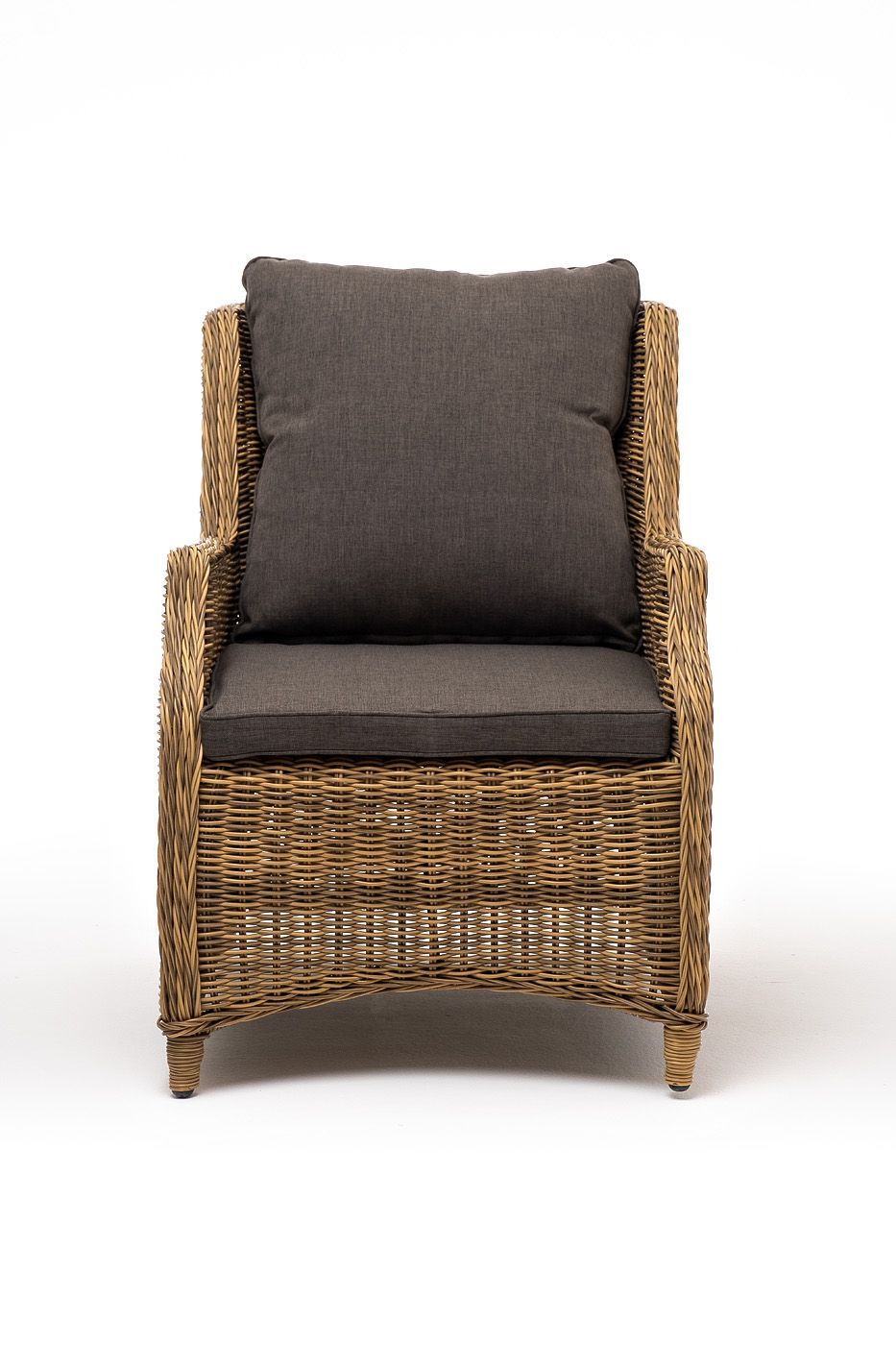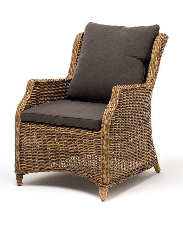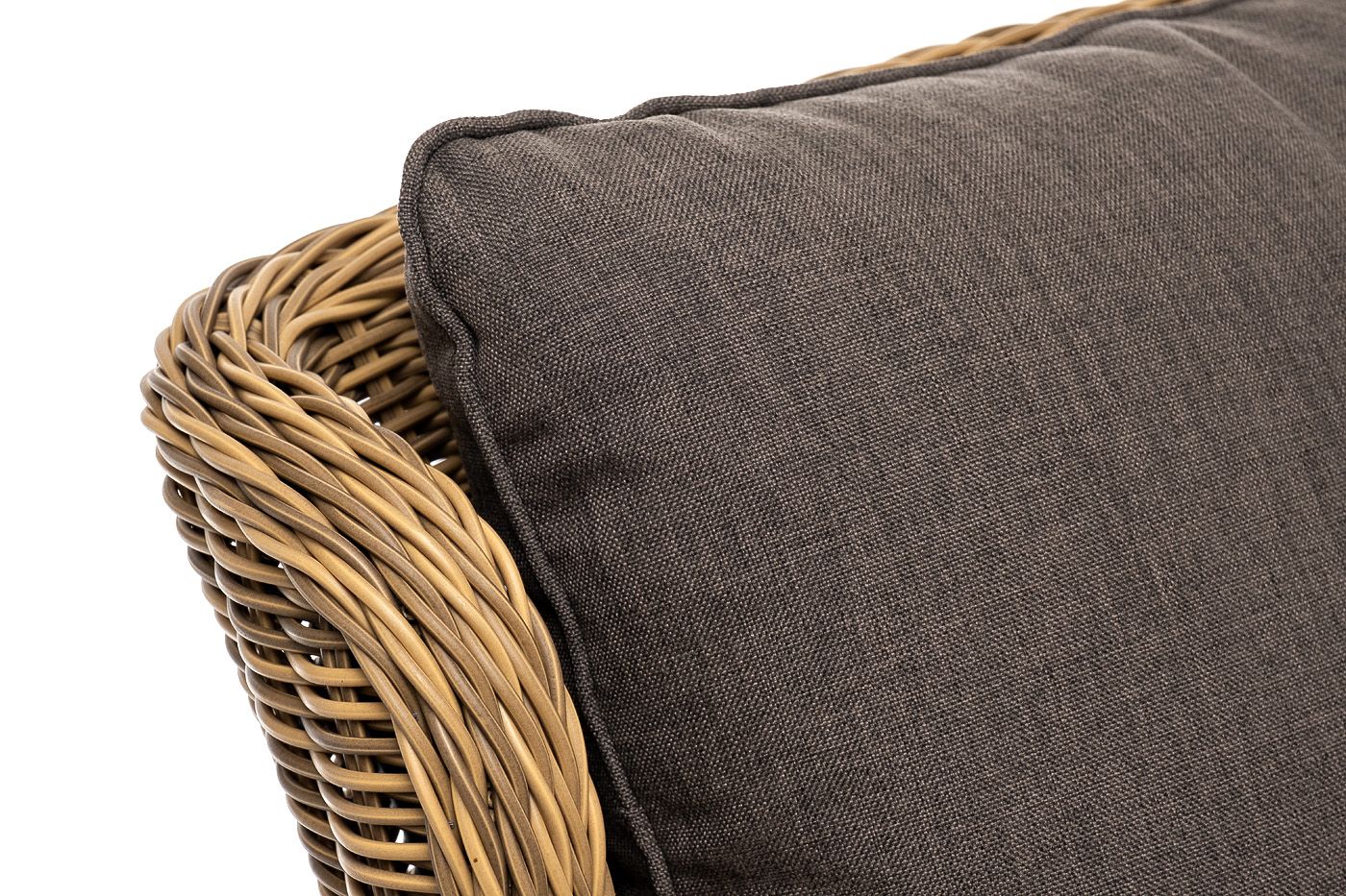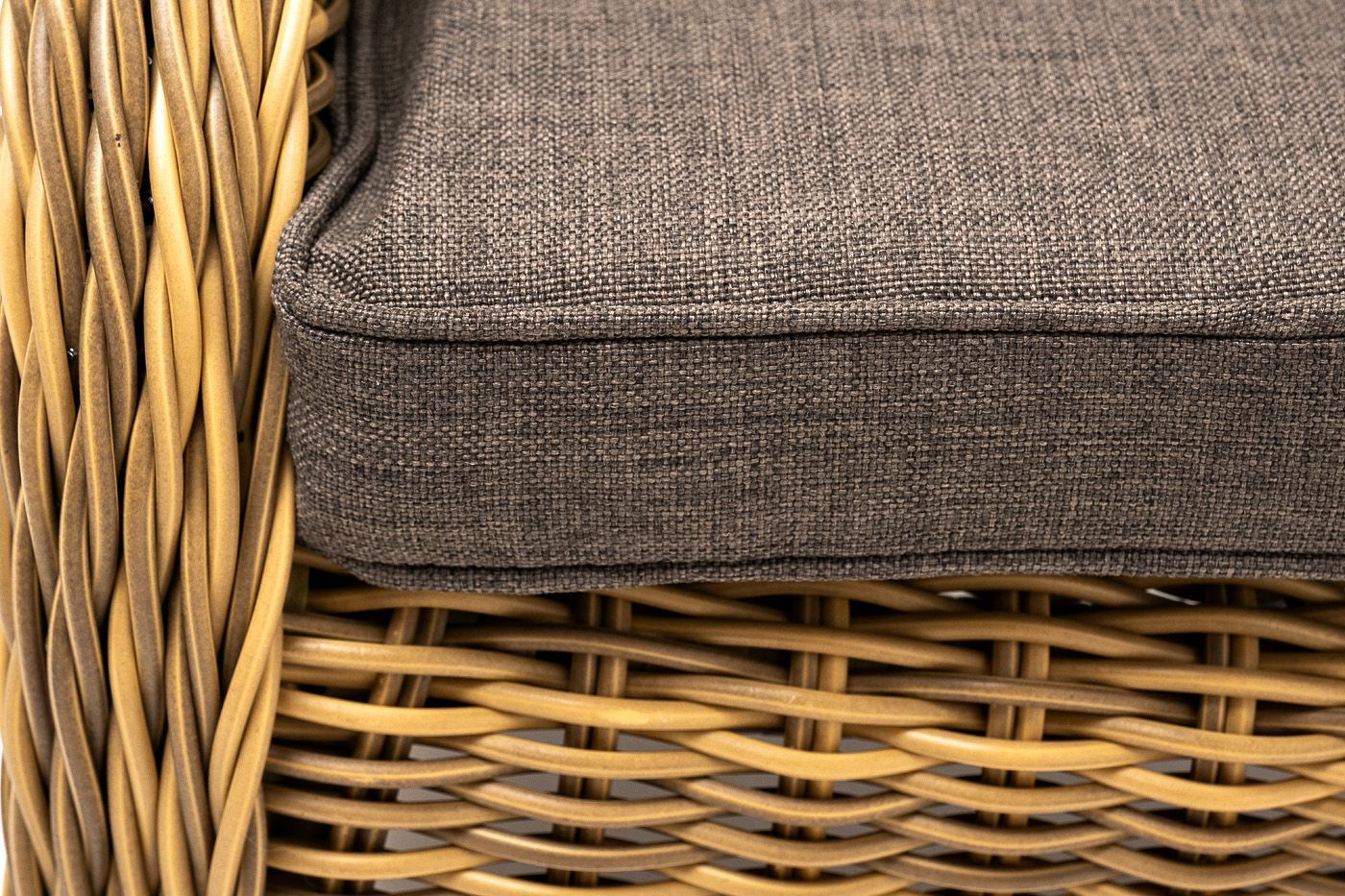 Плетенный стул дополняют мягкие подушки. Они выполнены в серо-коричневом оттенке. Пошиты изделия из плотного полиэстера 230гр/м2. Ткань предварительно обрабатывается влагоотталкивающей пропиткой.