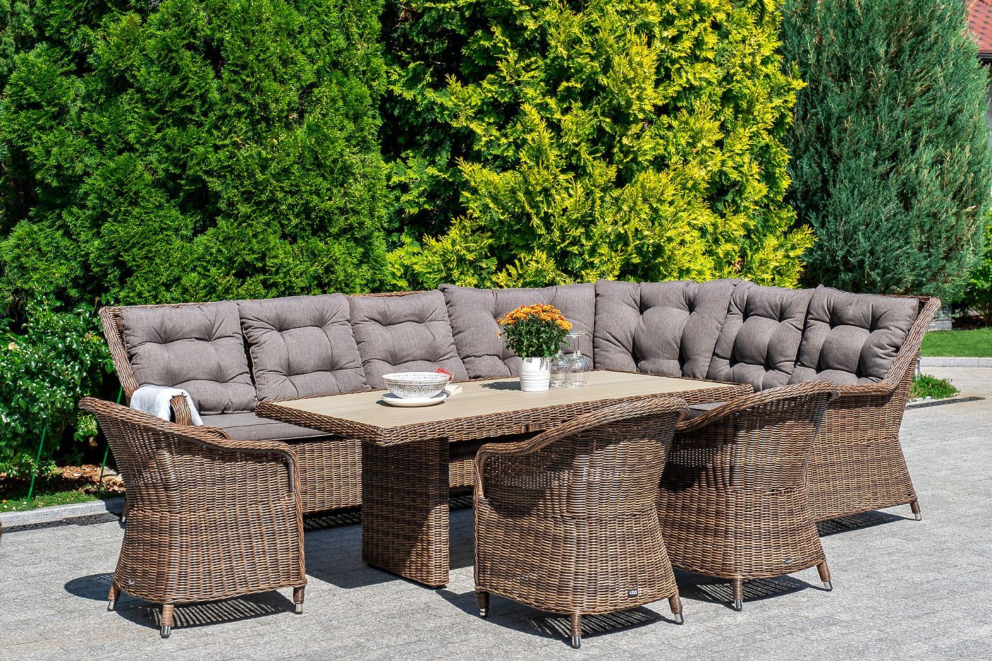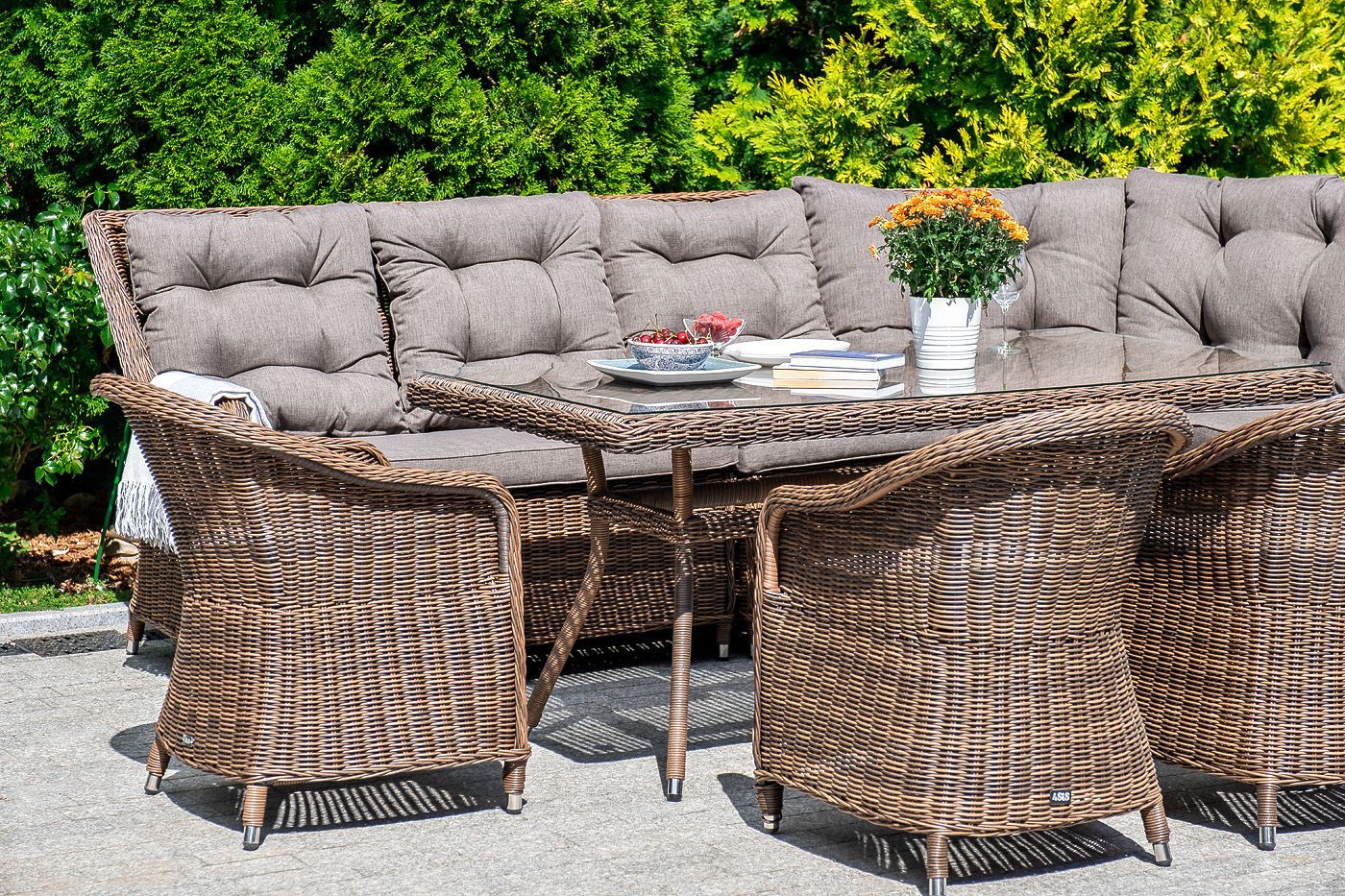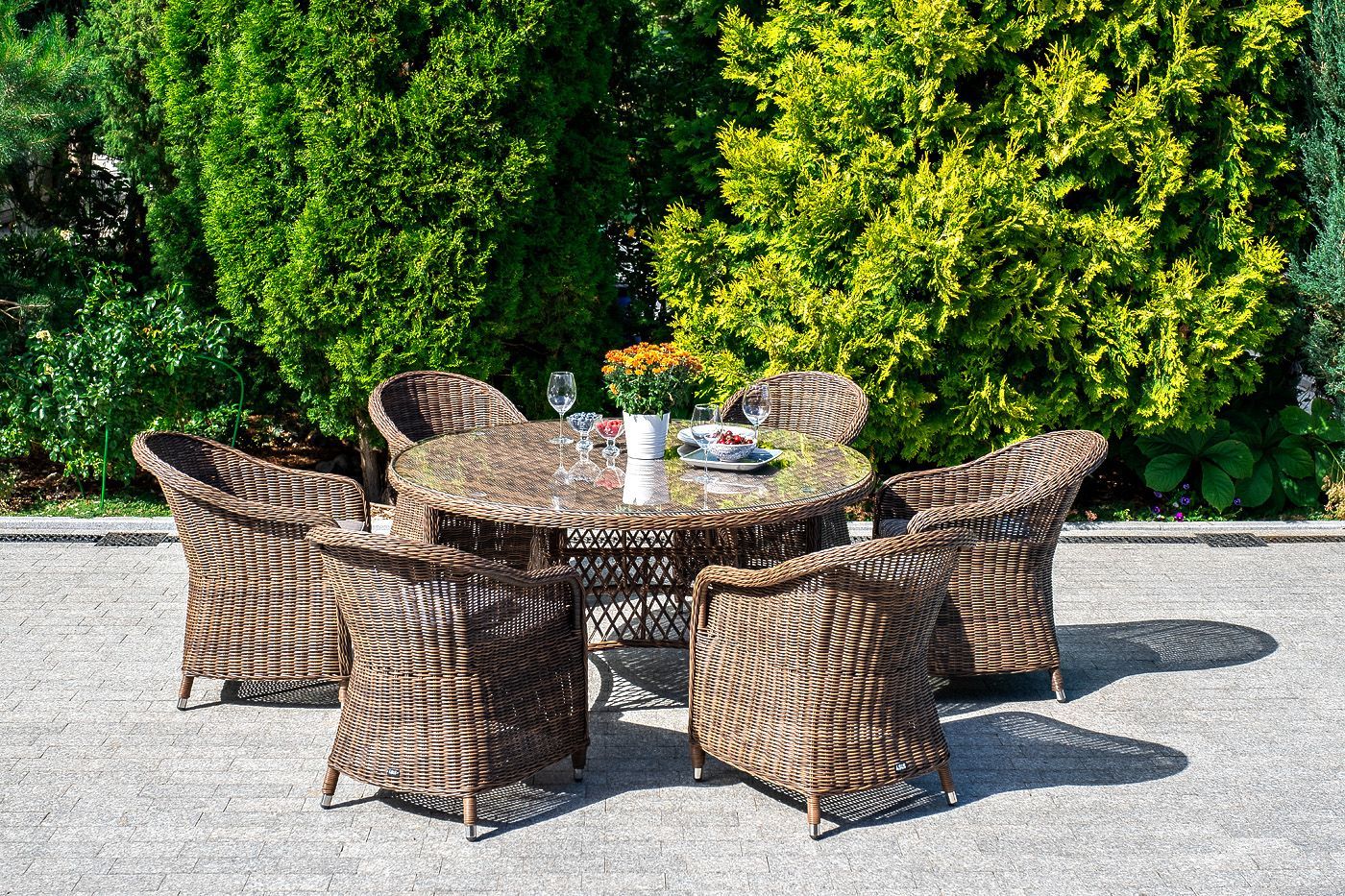 Кресло изготовлено посредством ручного плетения из искусственного ротанга коричневого цвета. Для укрепления конструкции использован алюминиевый каркас. Благодаря ему плетеное кресло остается легким, но прочным.