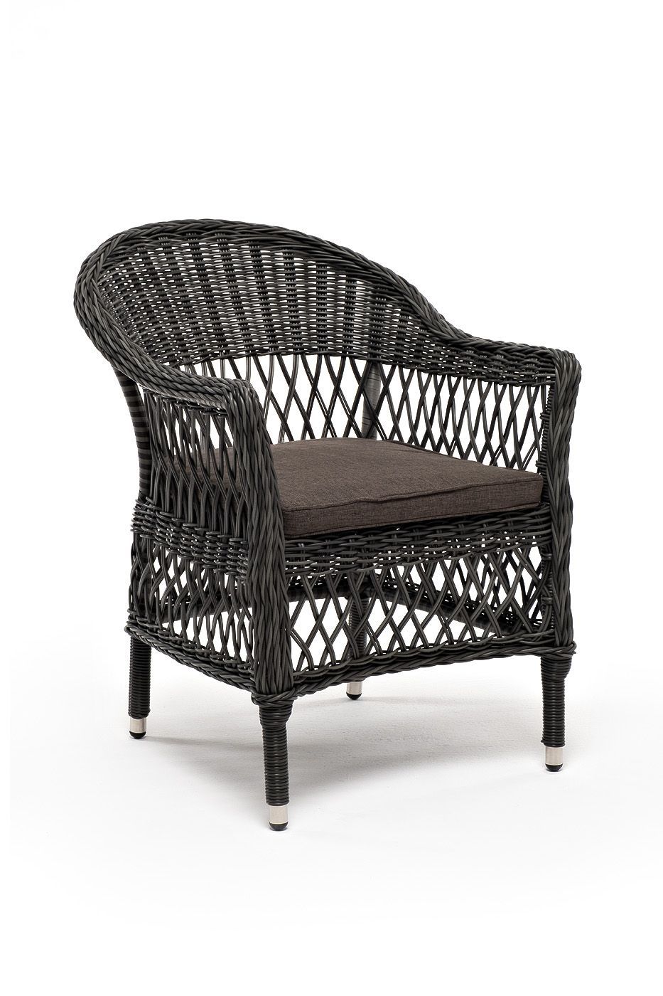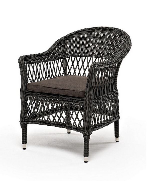 Стул оплетен вручную круглым искусственным ротангом графитового оттенка. В комплекте представлена мягкая подушка-сиденье серо-коричневого цвета. Подушка имеет съемный чехол из полиэстера (100%), плотностью 230гр/м2, с влагоотталкивающей пропиткой.