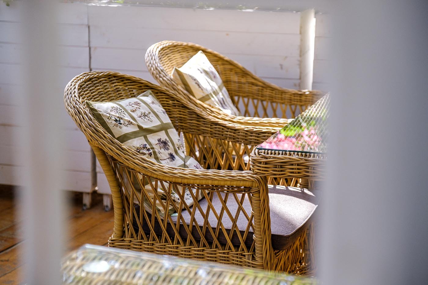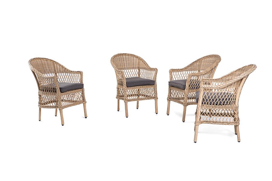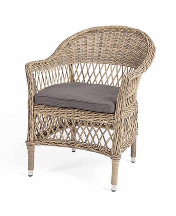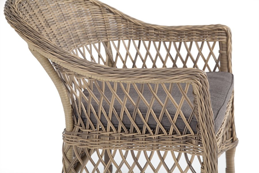 Стул оплетен вручную круглым искусственным ротангом соломенного оттенка. В комплекте представлена мягкая подушка-сиденье серо-коричневого цвета. Подушка имеет съемный чехол из полиэстера (100%), плотностью 230гр/м2, с влагоотталкивающей пропиткой.