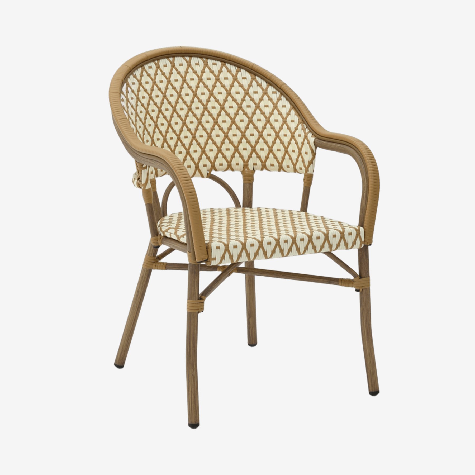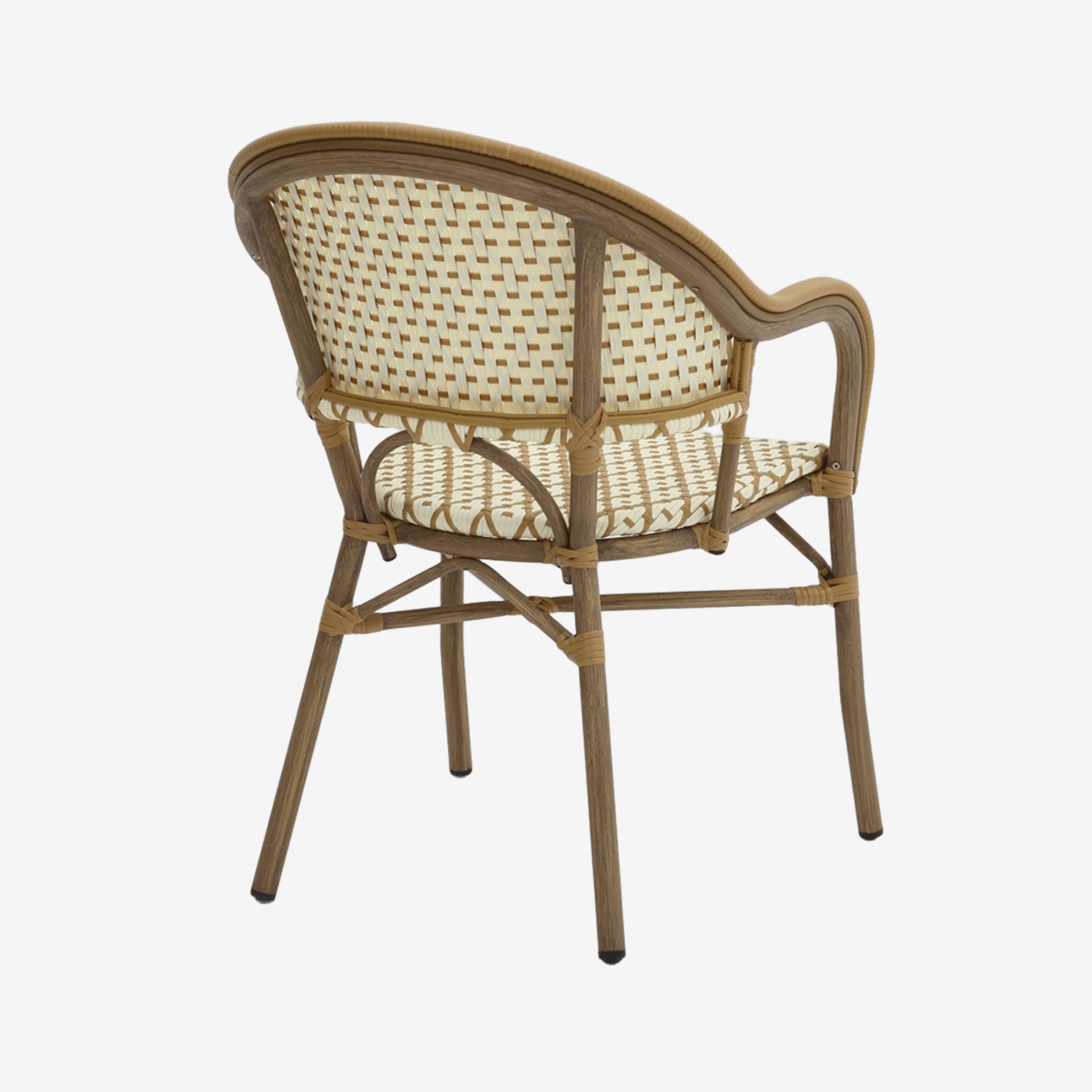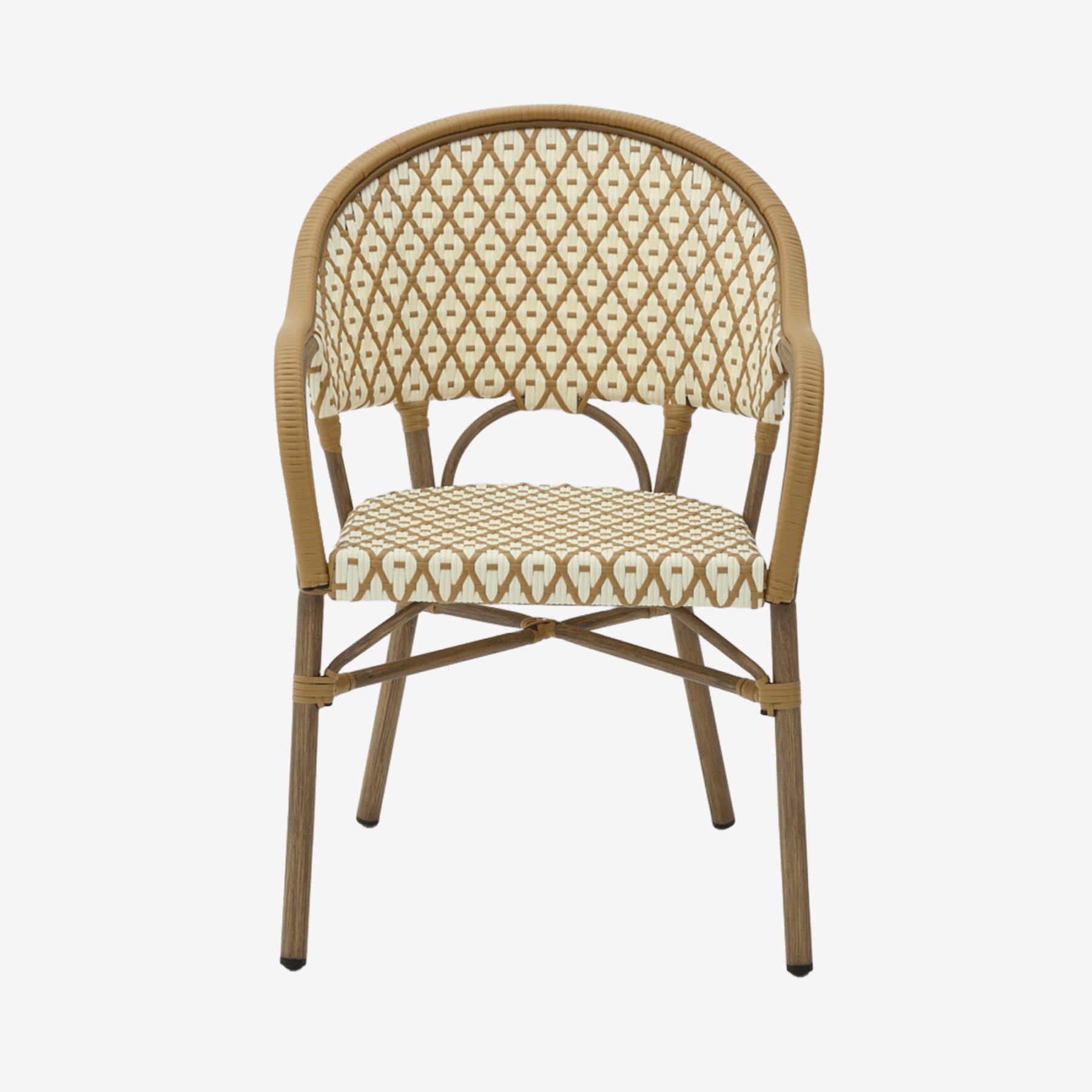 - Стул Фрежюс с подлокотниками плетеный искусственный ротанг бежево-желтый ножки металл коричневые