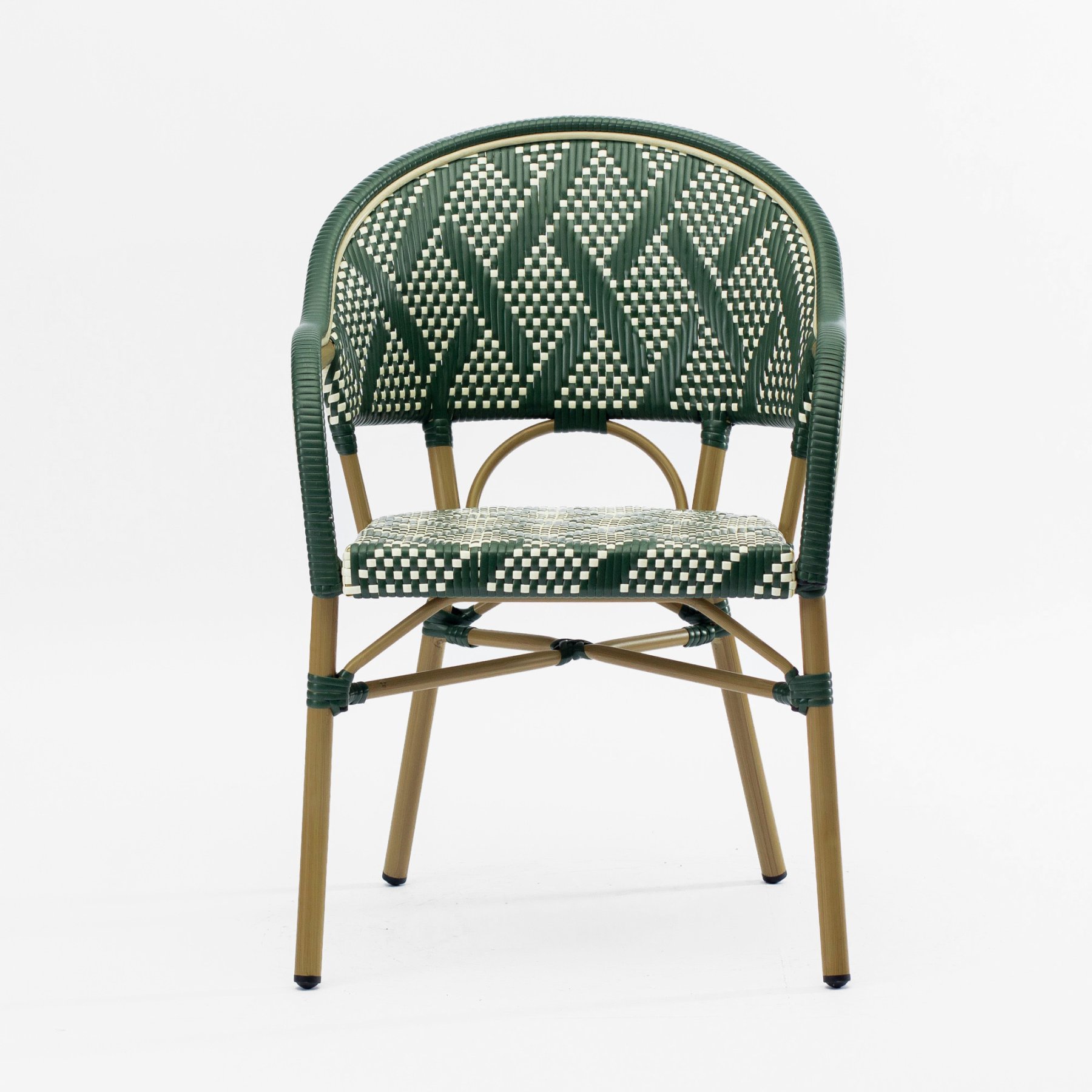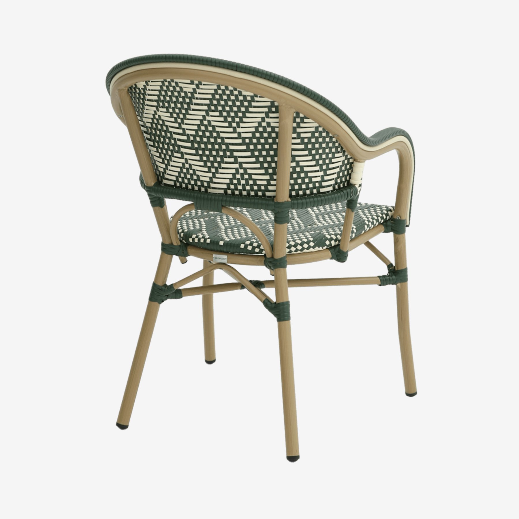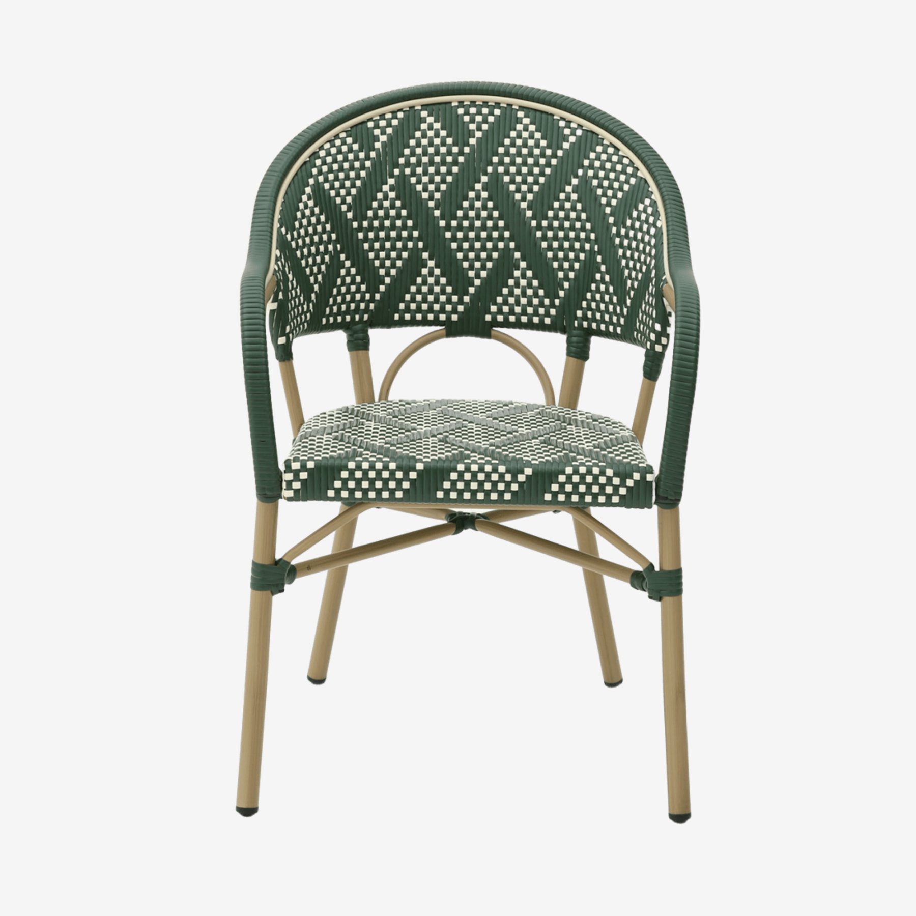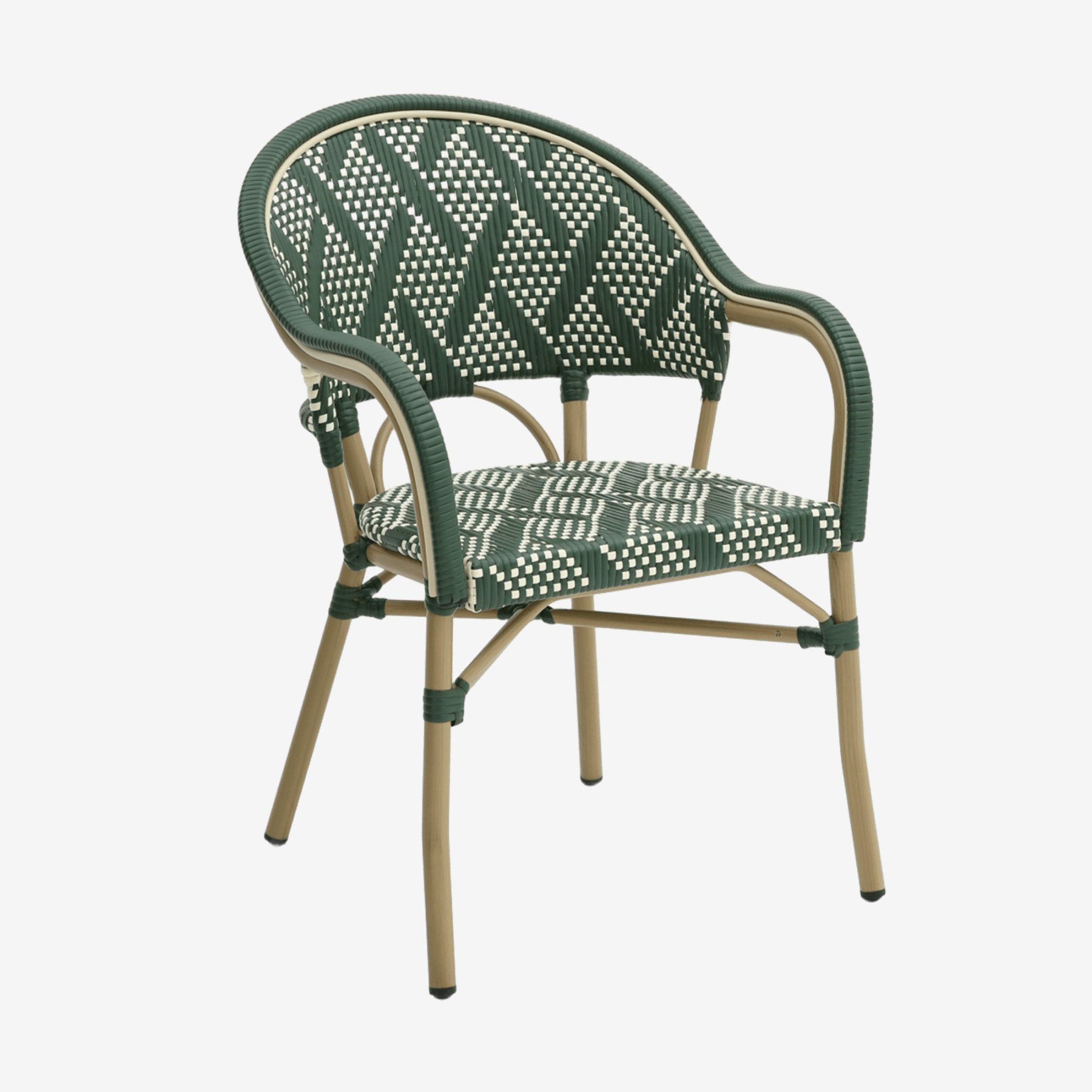 - Стул Фрежюс с подлокотниками плетеный искусственный ротанг зелено-бежевый ножки металл коричневые