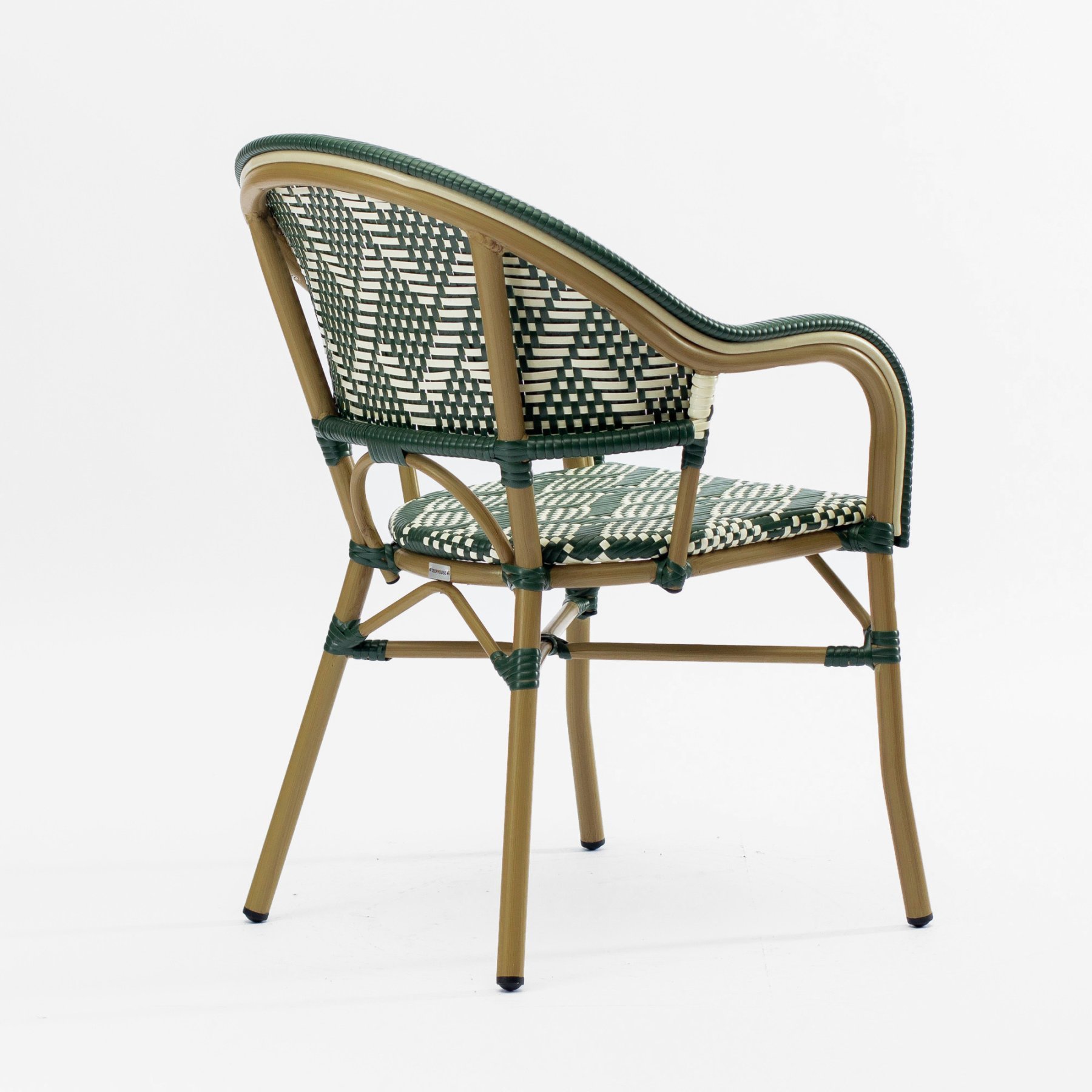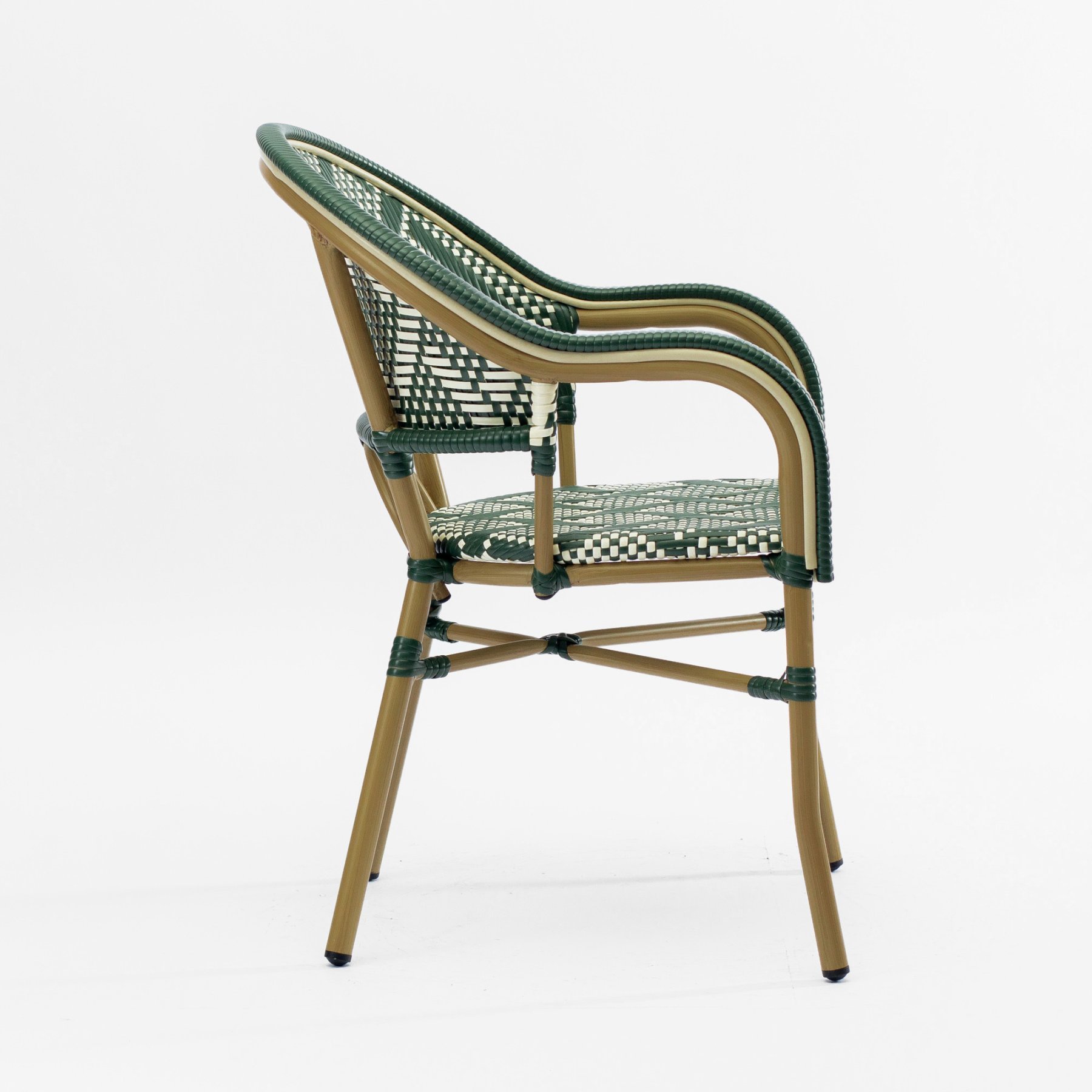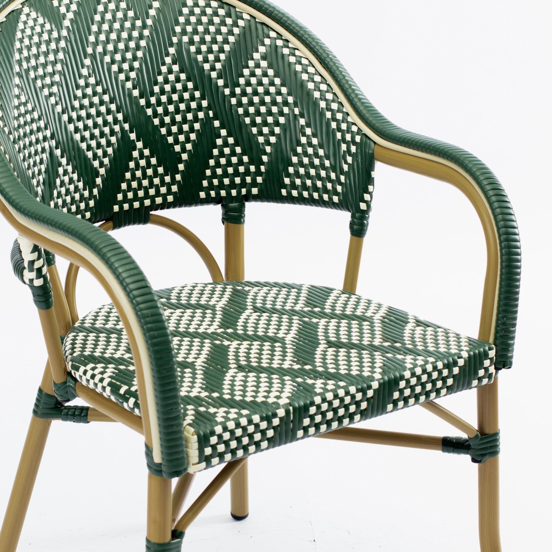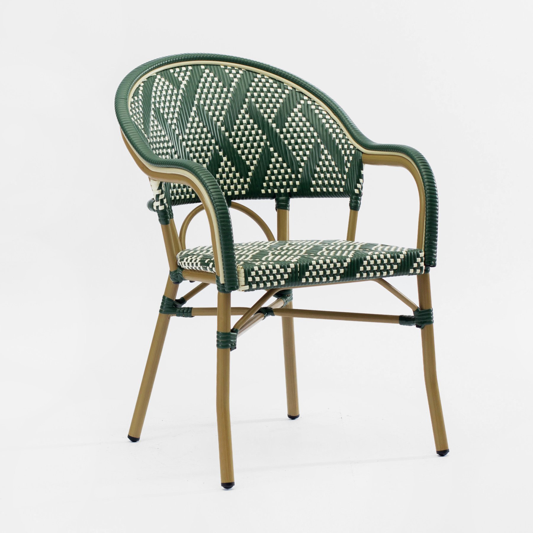 - Стул Фрежюс с подлокотниками плетеный искусственный ротанг зелено-бежевый ножки металл коричневые