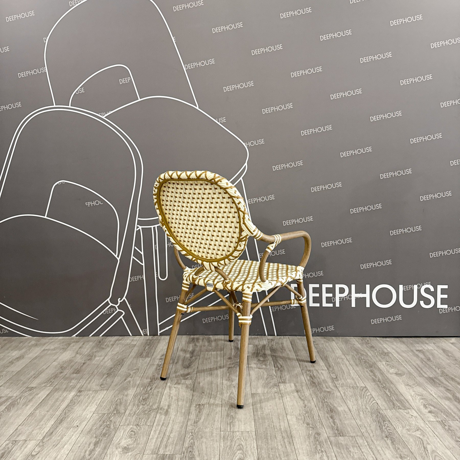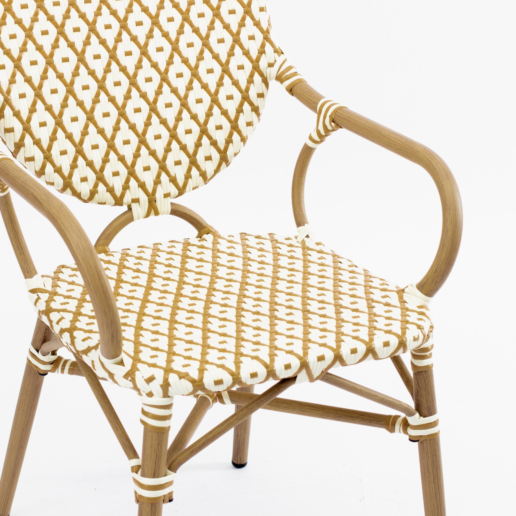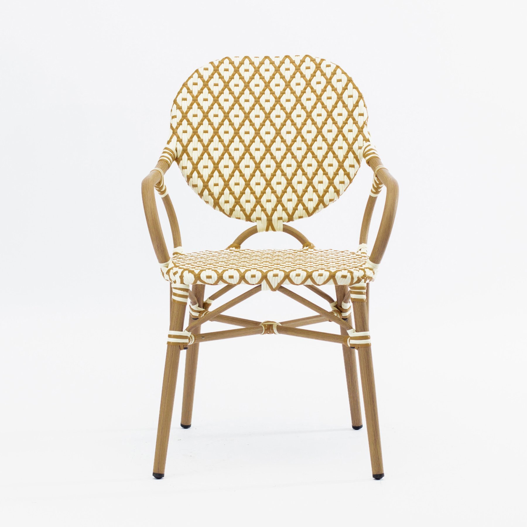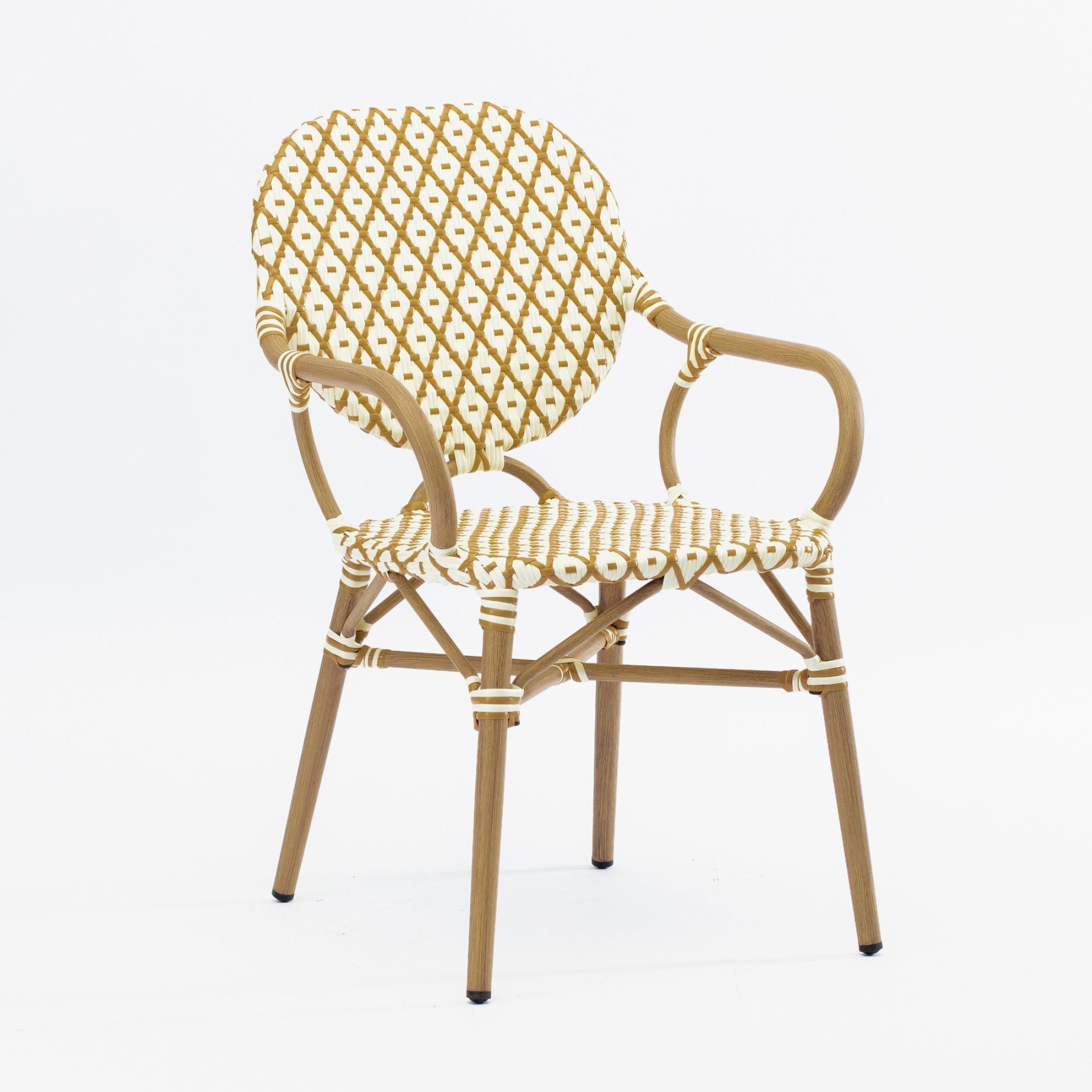 - Стул Маре с подлокотниками плетеный искусственный ротанг бежево-желтый ножки металл коричневые