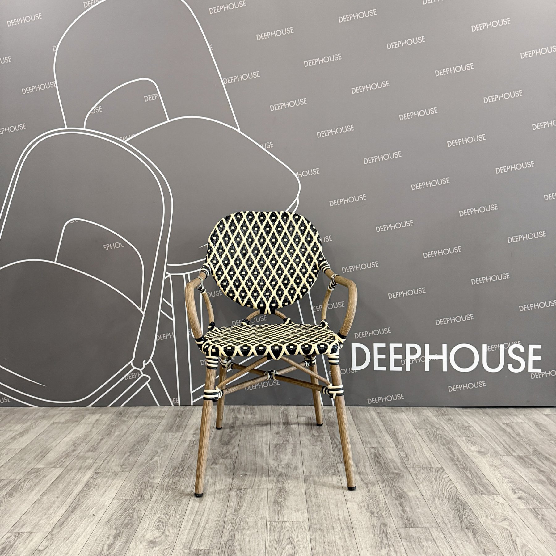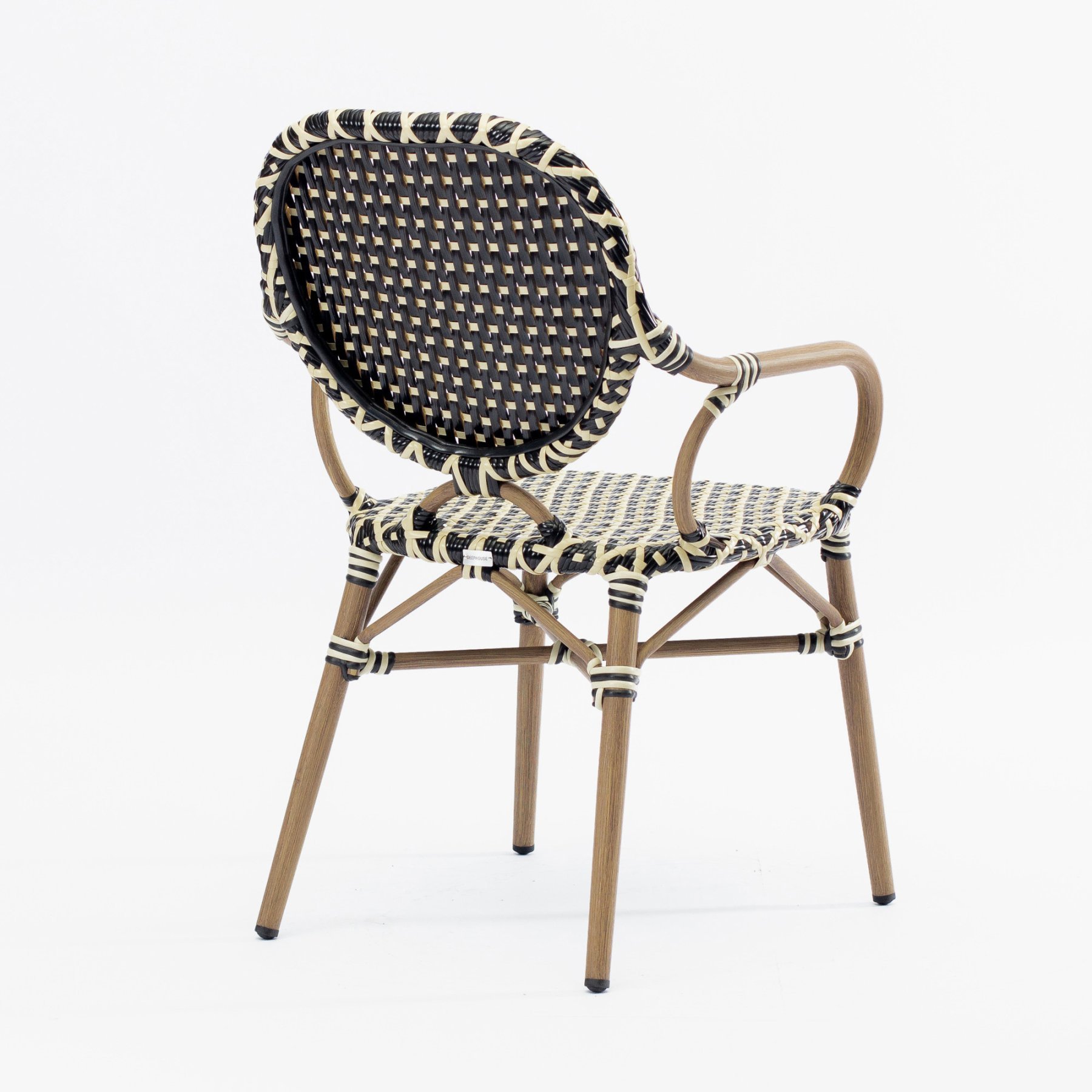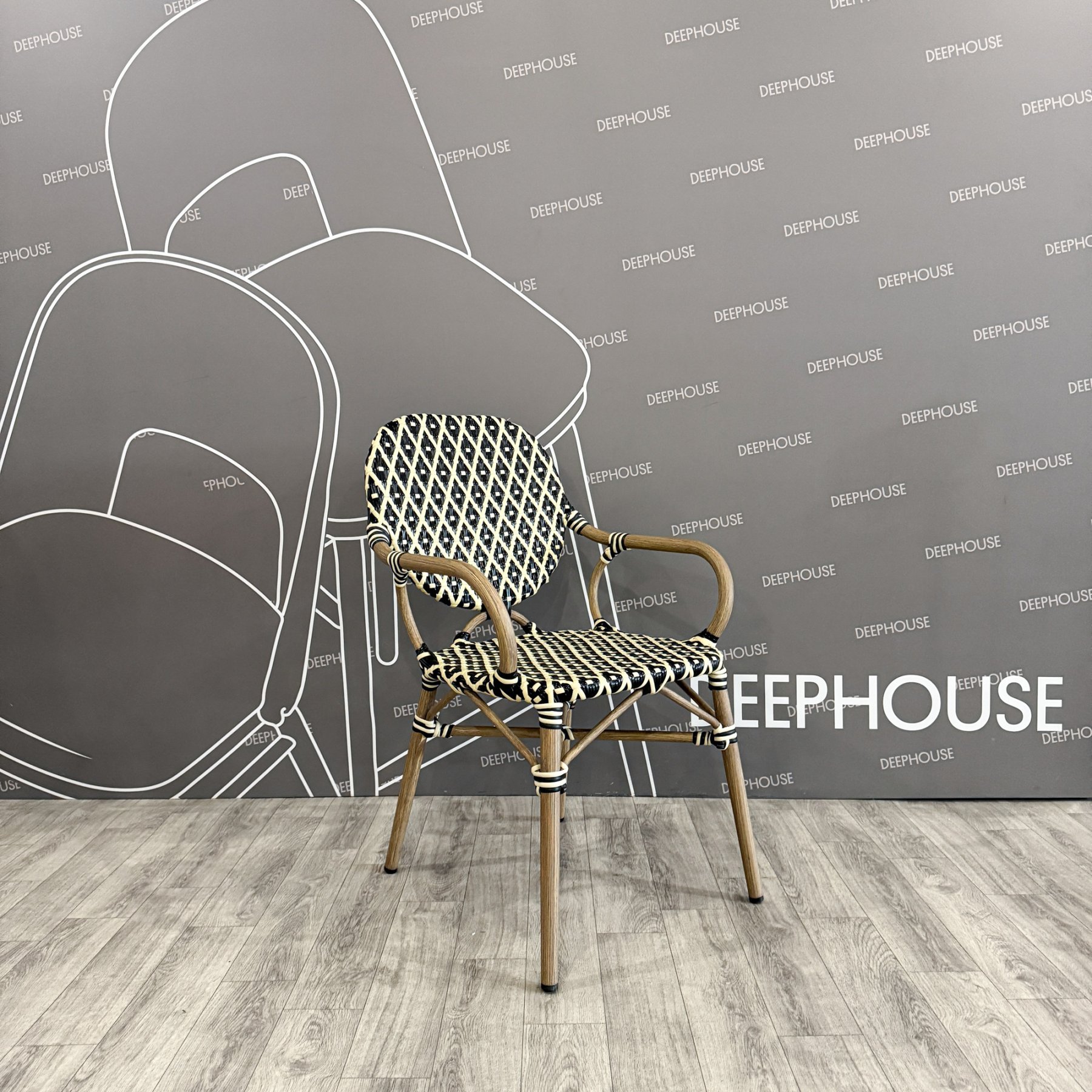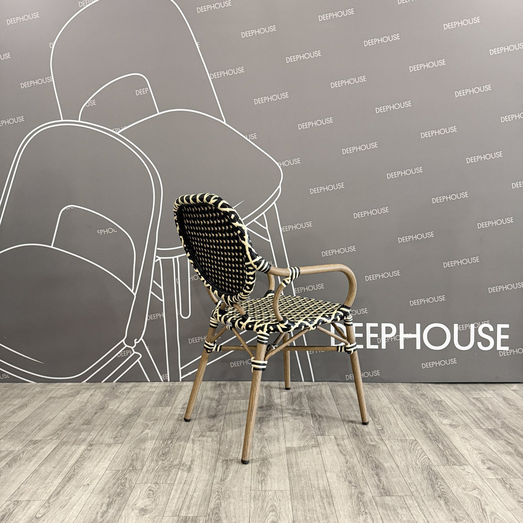 - Стул Маре с подлокотниками плетеный искусственный ротанг черно-бежевый ножки металл коричневые