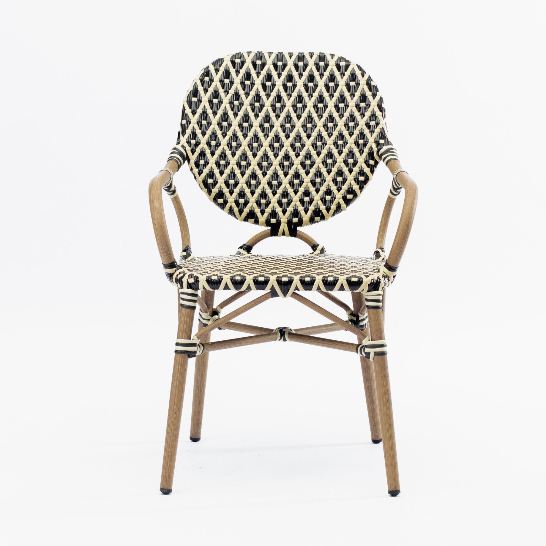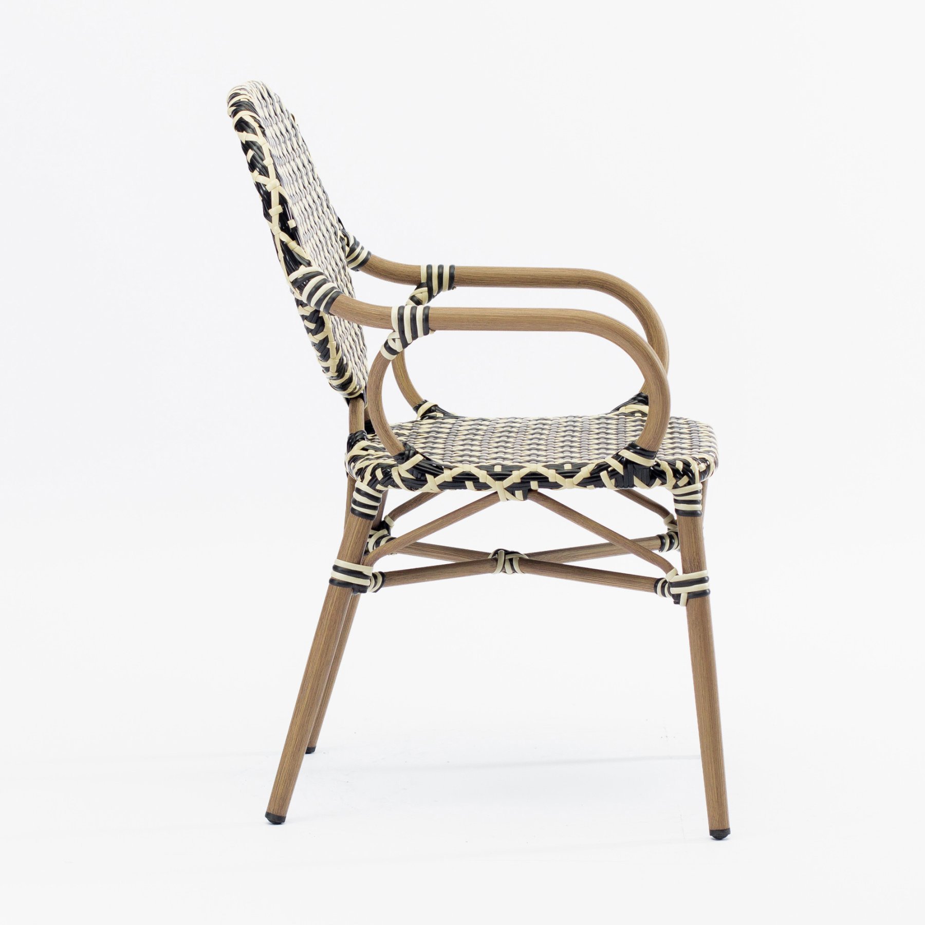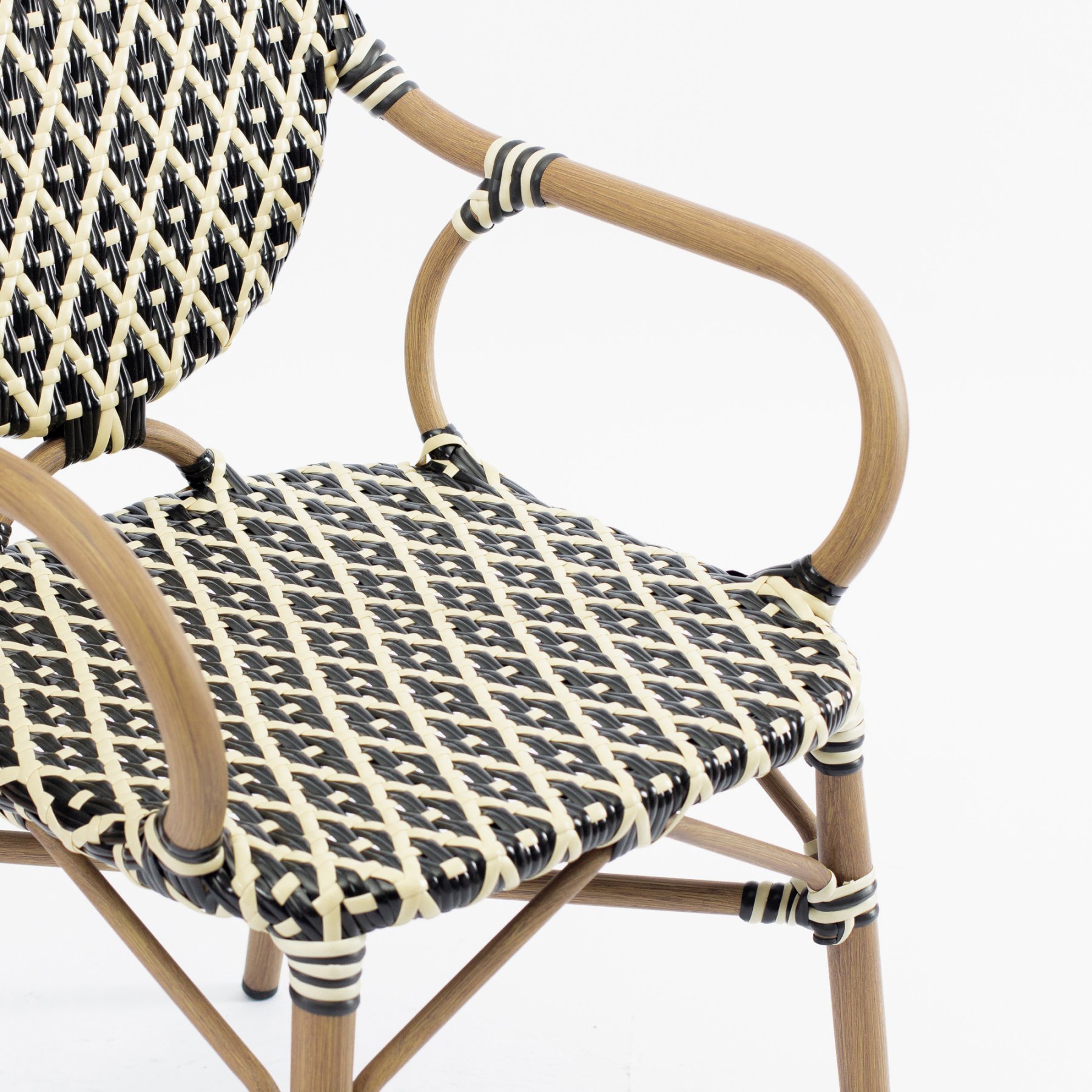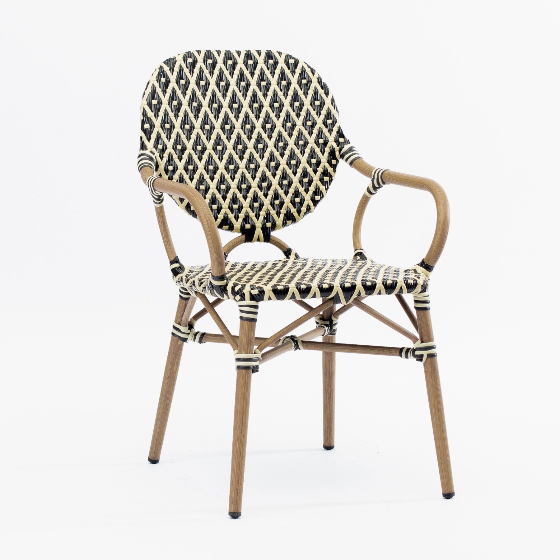 - Стул Маре с подлокотниками плетеный искусственный ротанг черно-бежевый ножки металл коричневые