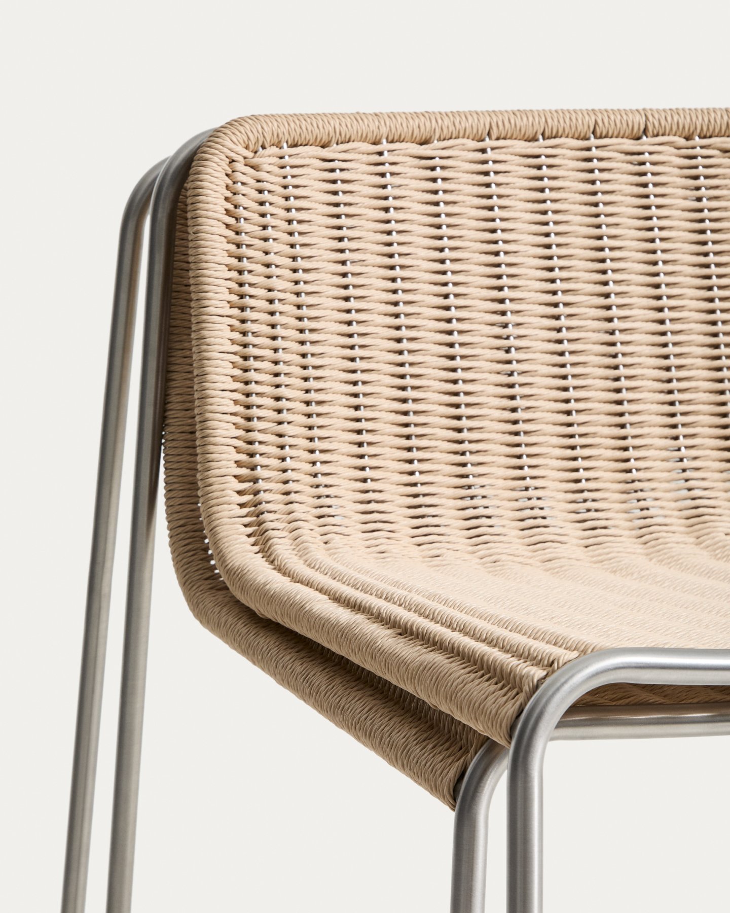 Штабелируемый табурет Tavari сочетает в себе легкость и прочность, создавая изделие, предназначенное для отдыха на открытом воздухе круглый год. Его сиденье, сплетенное вручную из бежевого синтетического шнура, добавляет текстуру и комфорт, а конструкция из нержавеющей стали с матовой отделкой обеспечивает стабильность и долговечность. Синтетический шнур выдерживает солнце, дождь и перепады температур, не теряя своей формы и цвета. Он также легко чистится, что делает его практичным выбором для открытых пространств.