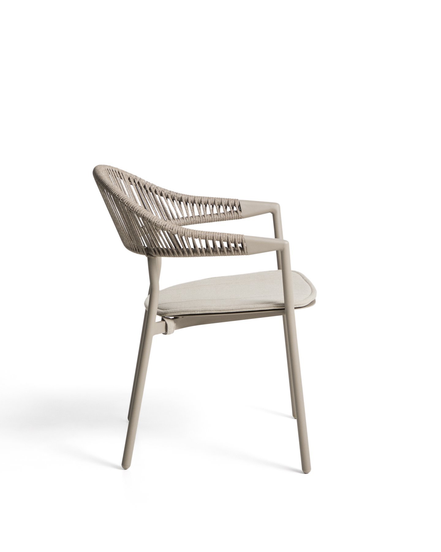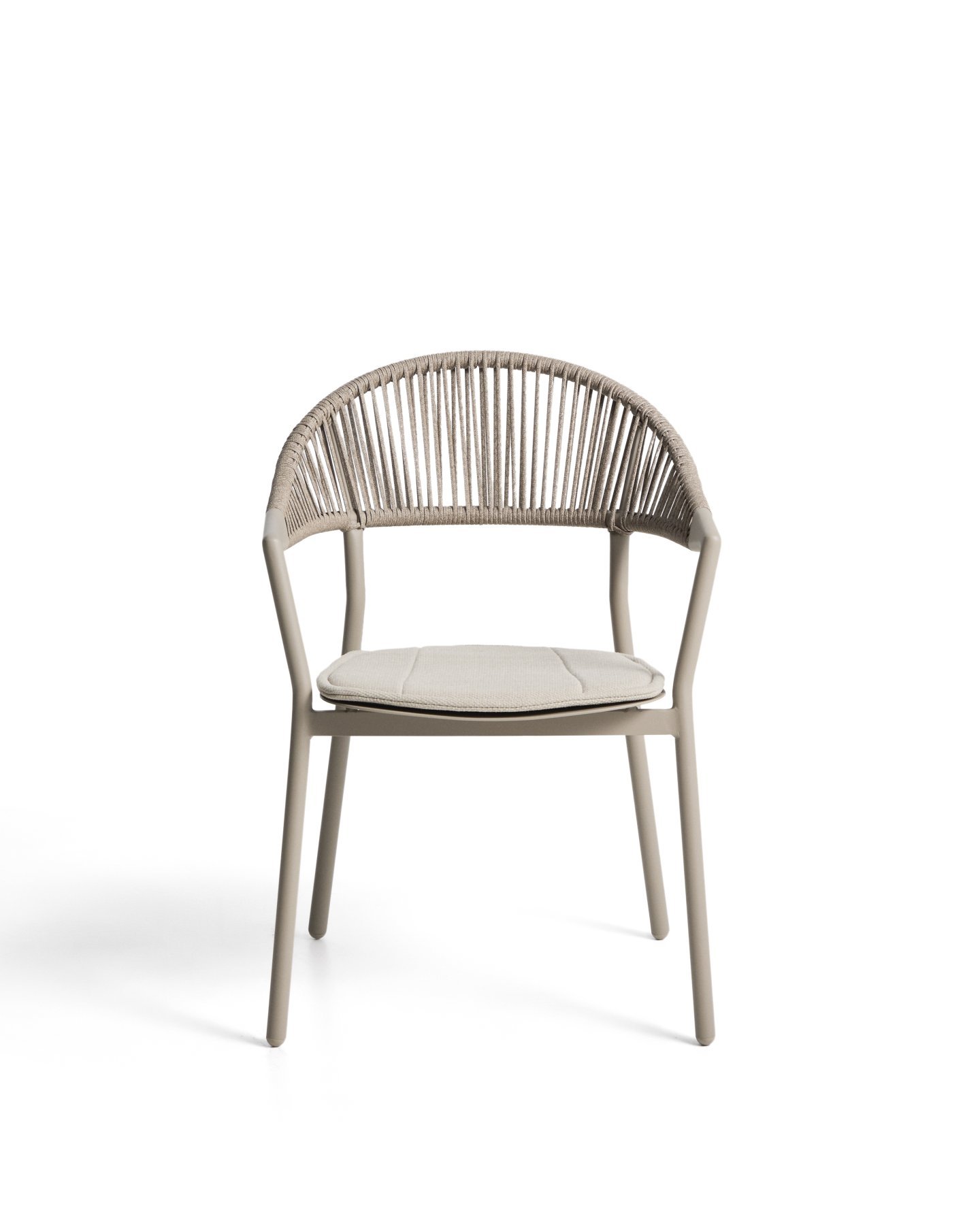 Стул Alimia сочетает в себе легкость и долговечность. Его алюминиевая структура устойчива к ржавчине, коррозии и воздействию солнца. Сплинка соткана вручную из синтетического шнура, добавляя текстуру и визуальный комфорт. Включает в себя подушку сиденья для дополнительного комфорта, которую мы рекомендуем хранить в дождливые дни. Его штабелируемая конструкция оптимизирует пространство, когда он не используется, а ножки оснащены пластиковыми ограждениями, которые помогают защитить пол и поддерживать поверхности в хорошем состоянии.