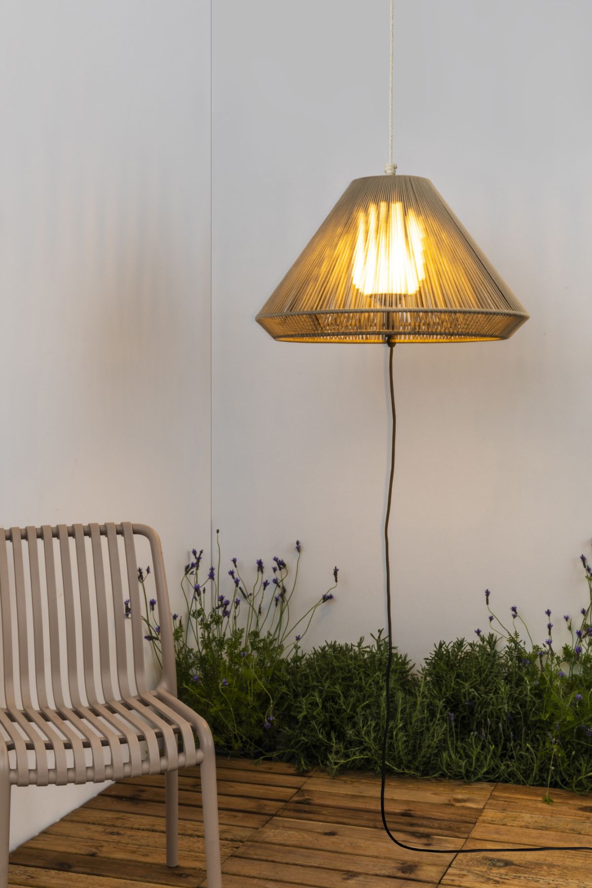 SAIGON — это набор дизайнерских светильников Nahtrang для наружного освещения. Он характеризуется простотой и чистыми формами. Это переносная и подвесная лампа с бежевым колпачком с отверстием. Абажур изготовлен из веревки, которая пропускает свет, создавая красивый световой эффект.