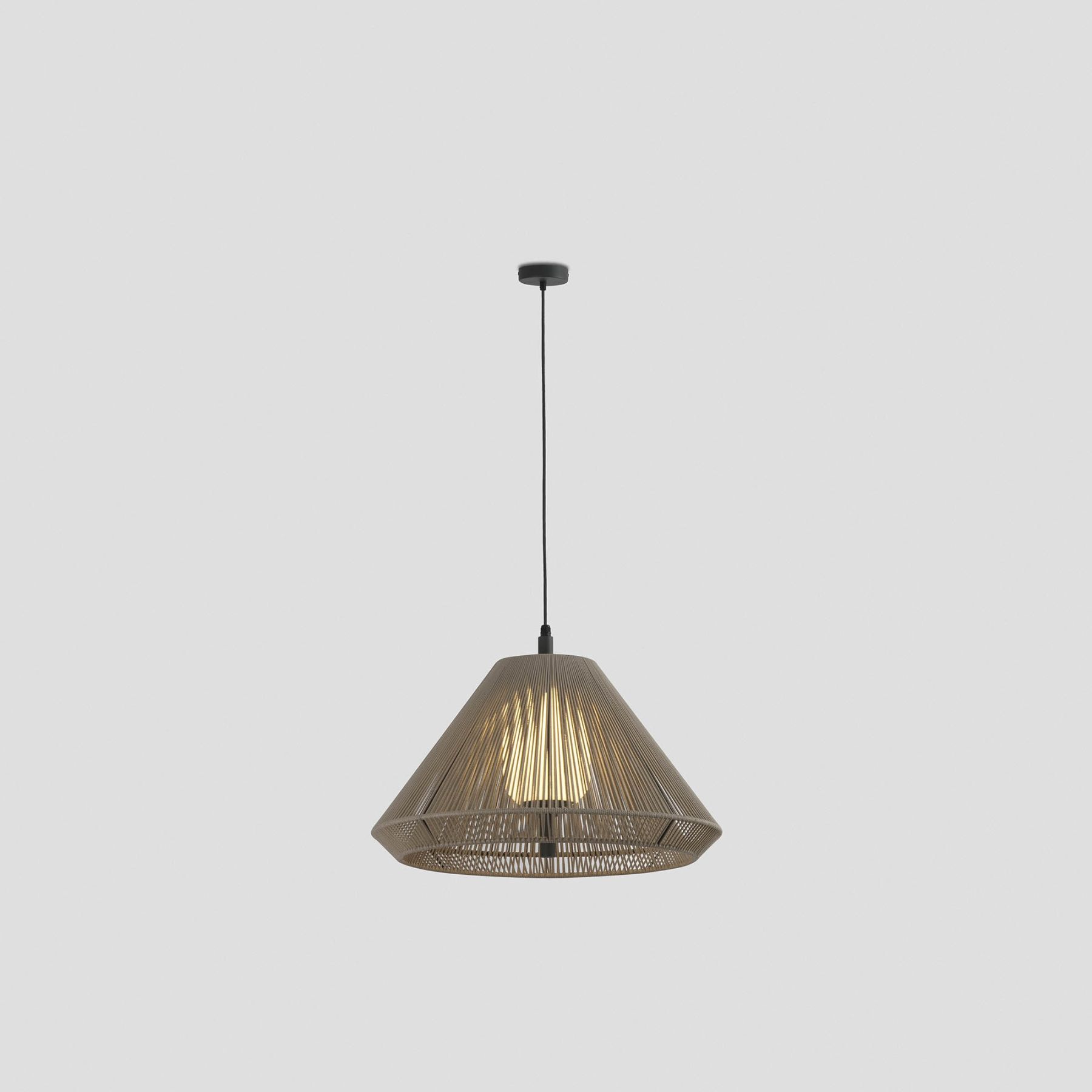 SAIGON — это набор дизайнерских светильников Nahtrang для наружного освещения. Он характеризуется простотой и чистыми формами. Это подвесной светильник с бежевым конусным абажуром. Абажур изготовлен из веревки, которая пропускает свет, создавая красивый световой эффект.