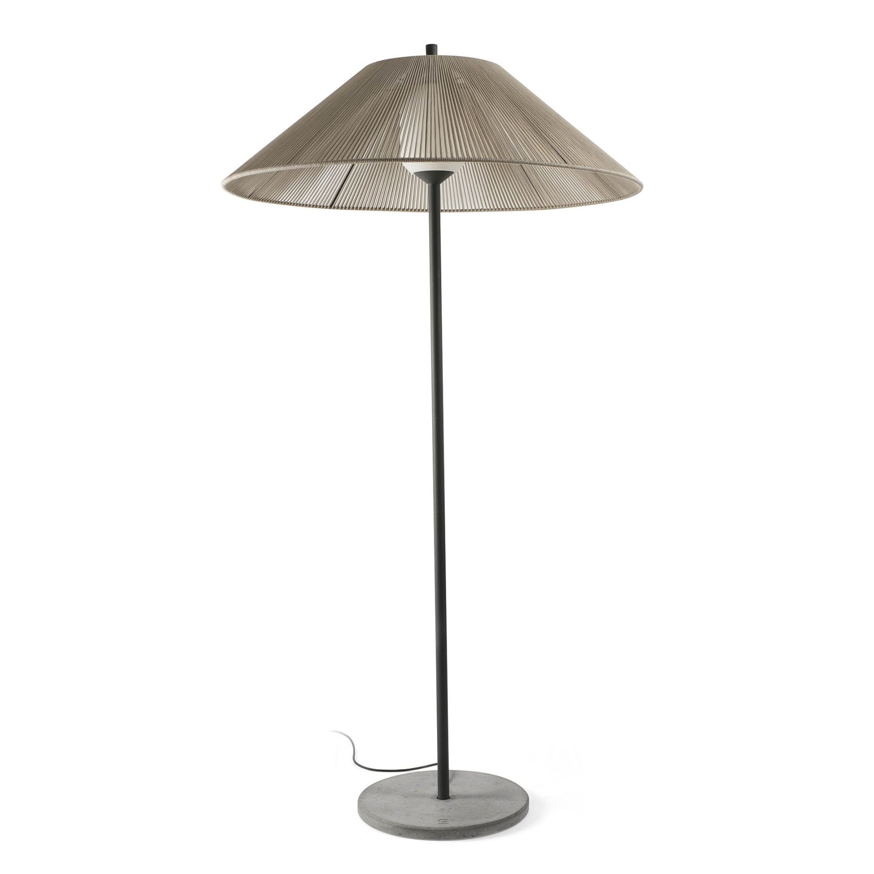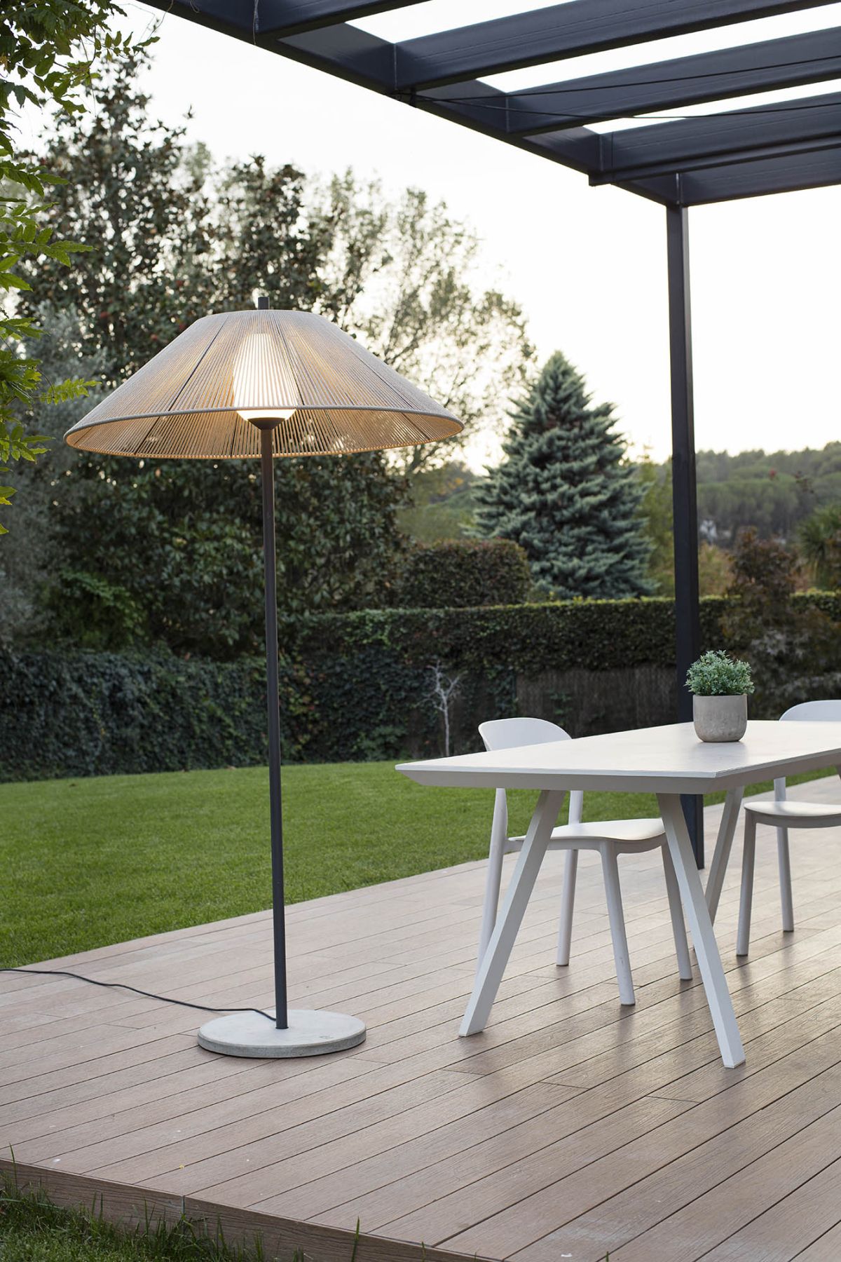 SAIGON — это набор дизайнерских светильников Nahtrang для наружного освещения. По характеристике образуются простаты и кисты. Это торшер гостиной с бежевым абажуром высотой 2 м. Абажур изготовлен из веревки, которая пропускает свет, несколько раз красивой световой эфект.