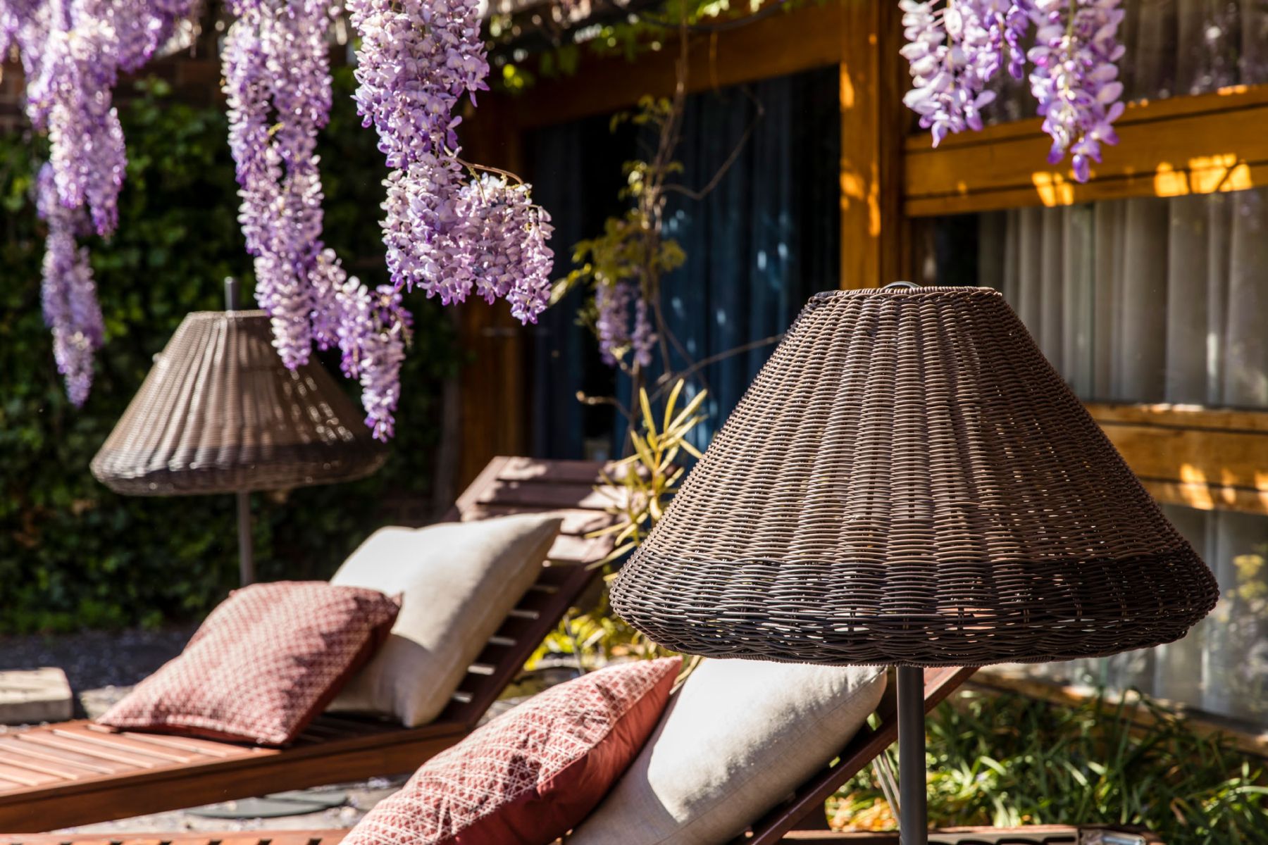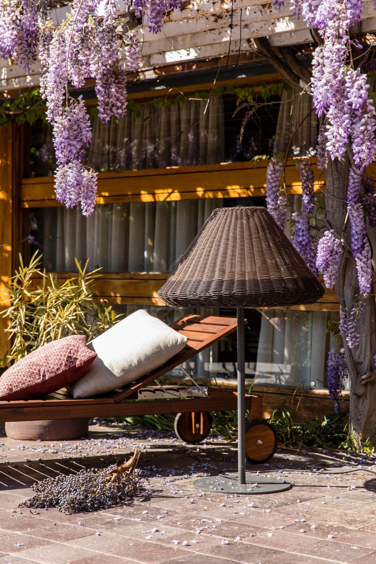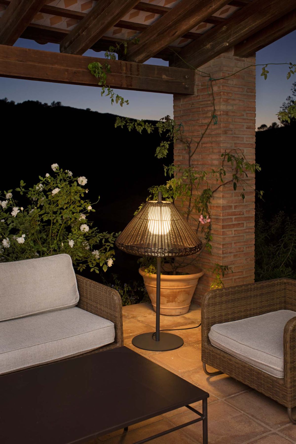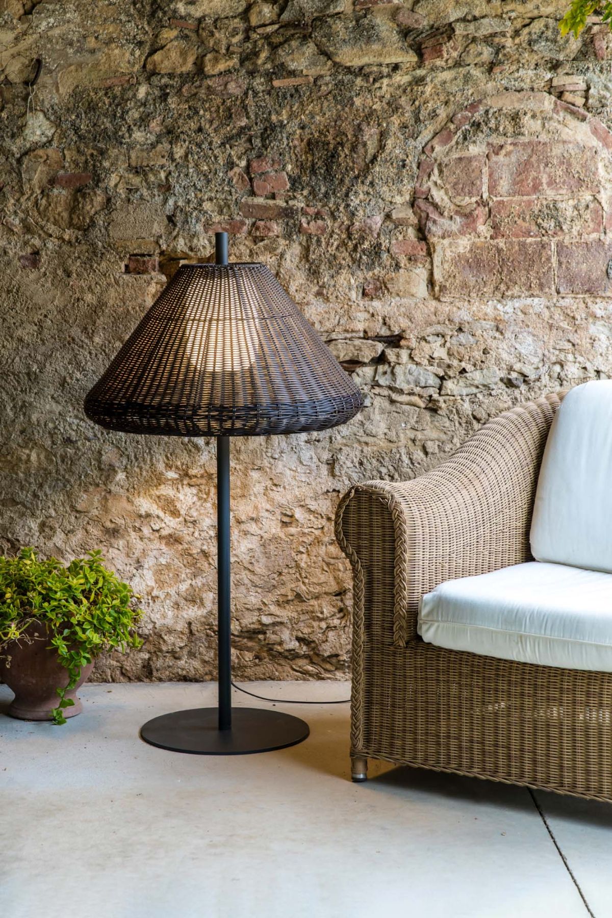 SAIGON - это набор дизайнерских ламп Nahtrang для наружного освещения. Для него характерны простота и чистые формы. Торшер для гостиной с коричневым абажуром W70 шириной 1 м. Абажур изготовлен из синтетического плетения.