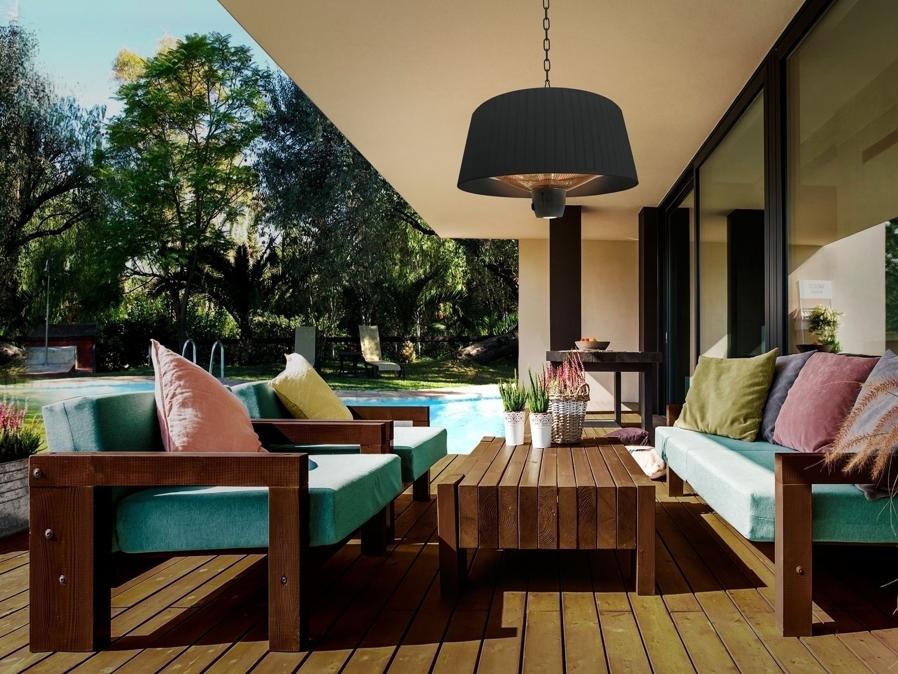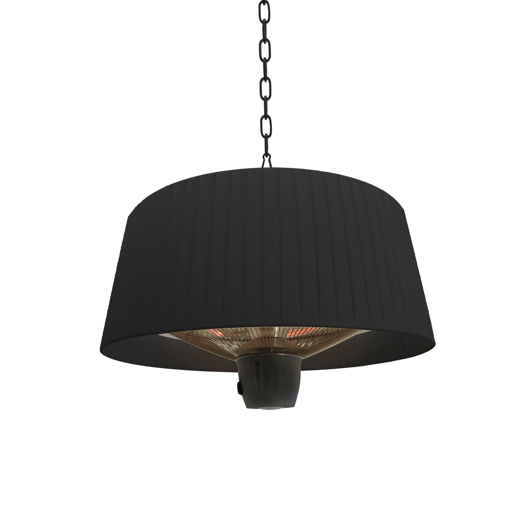 Электронагреватель для потолочной установки, подвесного типа. Изготовлен из металла и пластика, окрашен в черный цвет. Черный тканевый плафон со складками. Галогенное отопление мощностью 600/900/1500 Вт. Светодиодная лампа мощностью 1 Вт. Дистанционное управление. Кабель: 1,8 м. IP44.