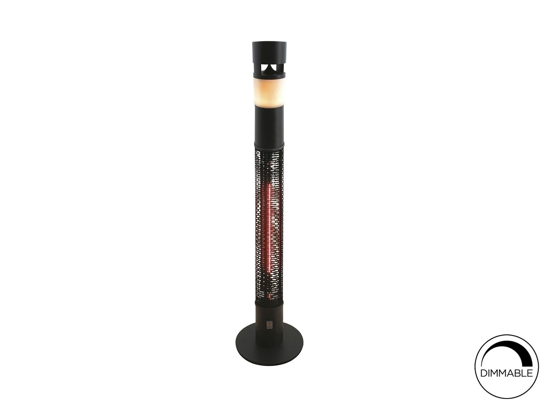 Уличный электрический обогреватель со светодиодной подсветкой RGB с дистанционным управлением и динамиком с подключением по bluetooth. Изготовлен из металла с черным покрытием. Со специальной защитной сеткой и металлическим основанием. Галогенное отопление 1500 Вт. 1,8 метра кабеля. IP 55.