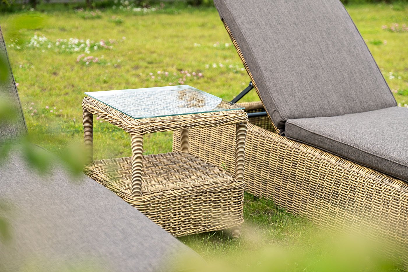 Размер модели – 450×450×520 мм. Ее основу составляет каркас из высококачественного алюминия. Ручное плетение выполнено из круглого искусственного ротанга. Столик имеет дополниельную полку.