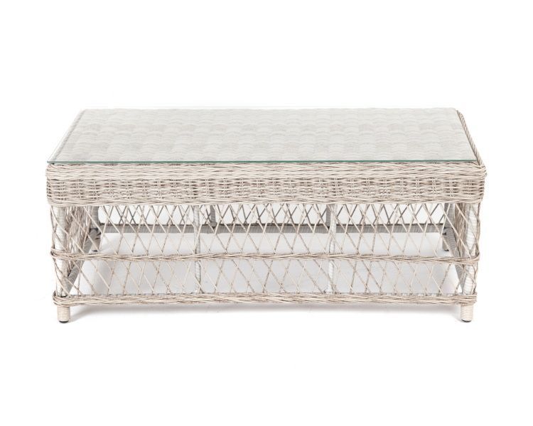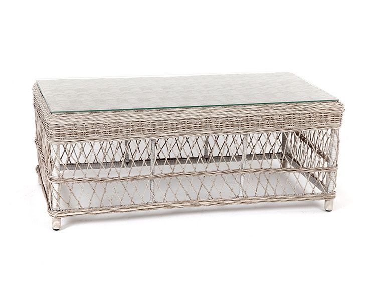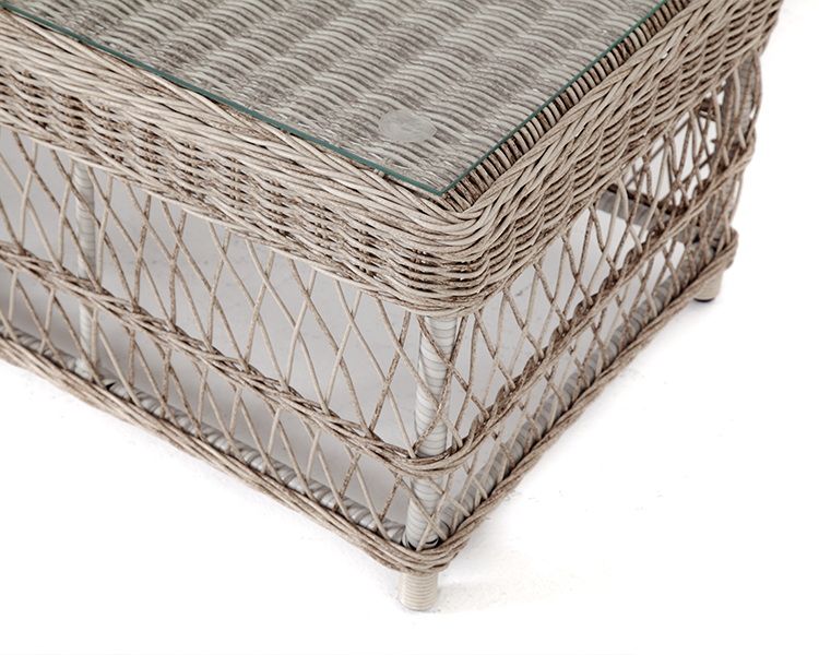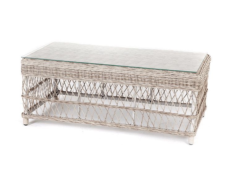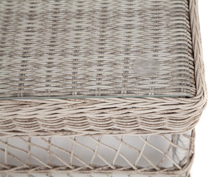 Каркас столика изготовлен из алюминия, вручную оплетенного круглым искусственным ротангом.