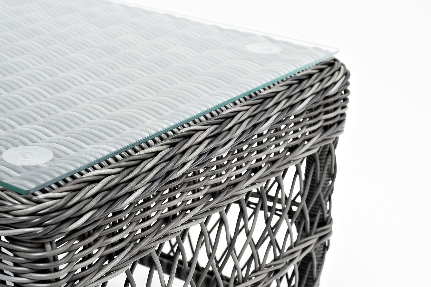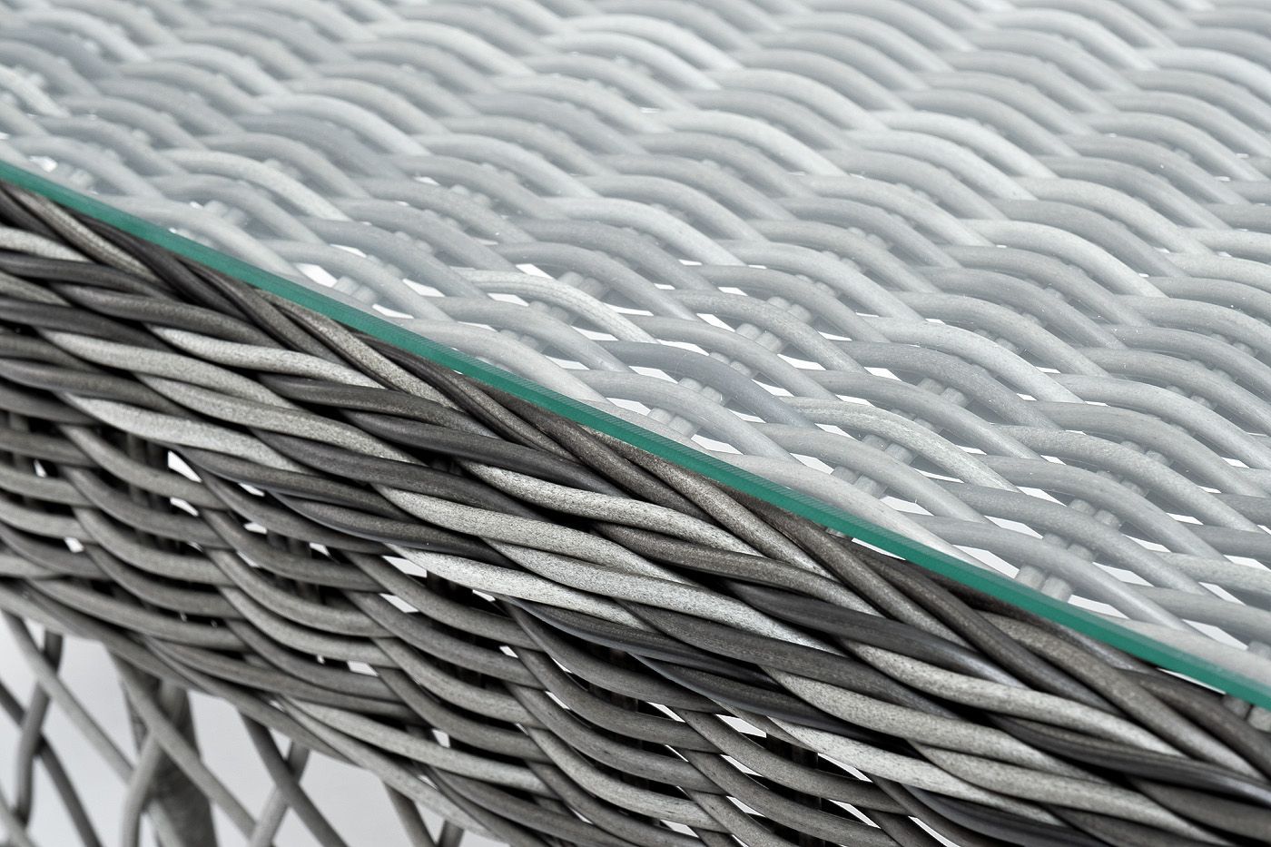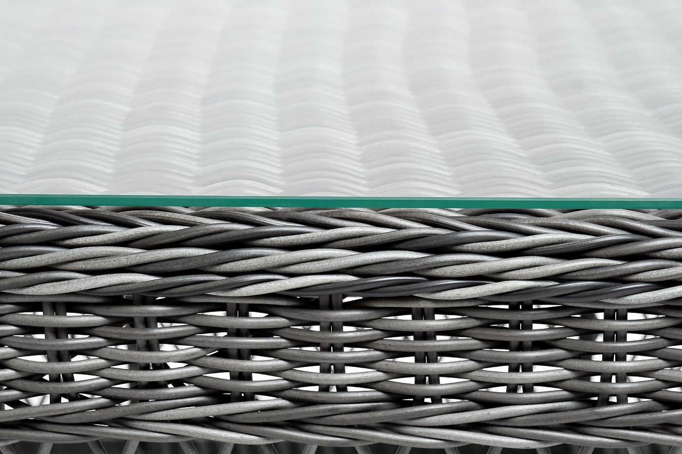 Каркас столика изготовлен из алюминия, вручную оплетенного круглым искусственным ротангом.