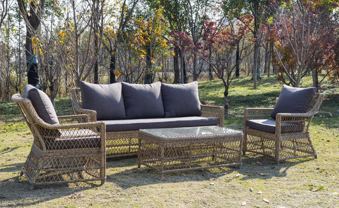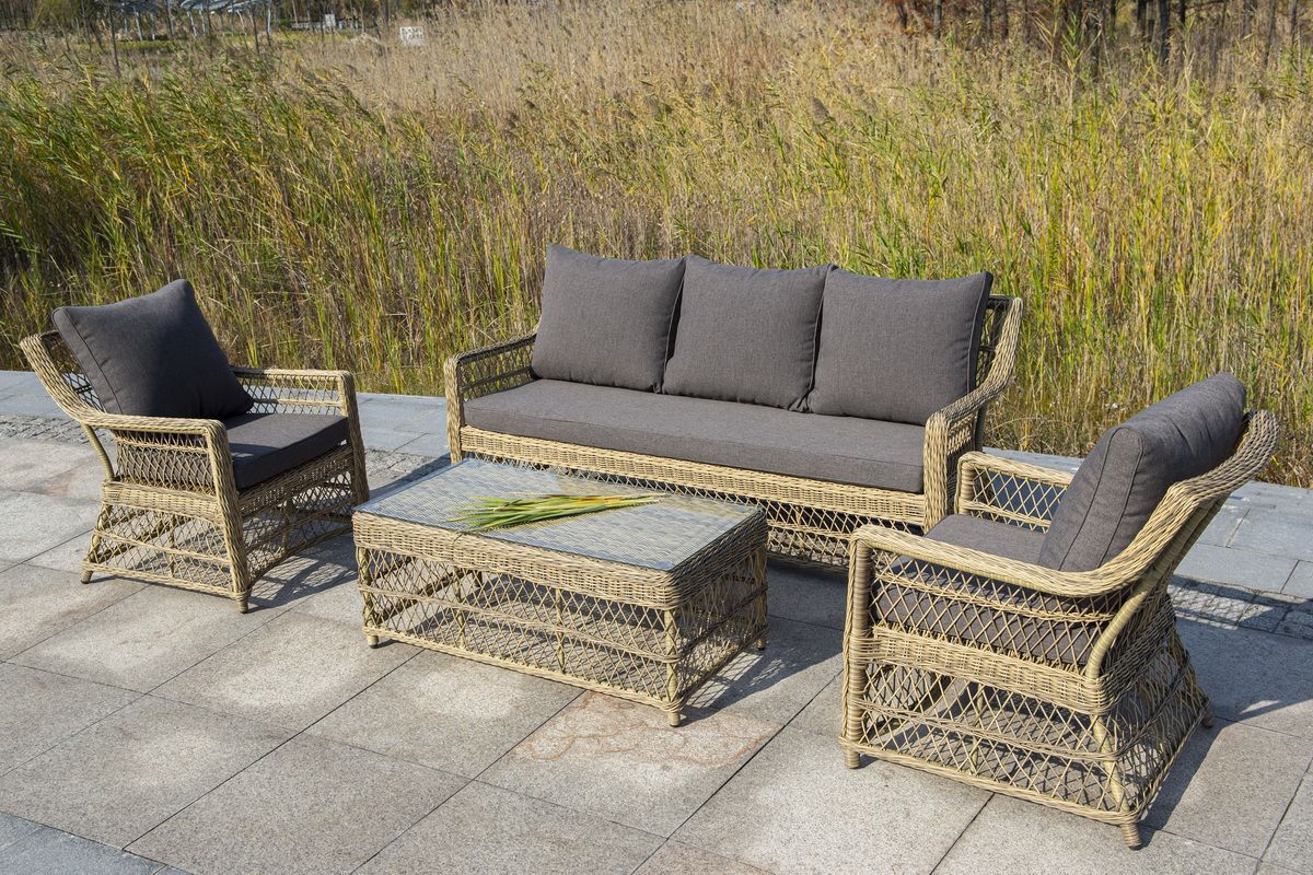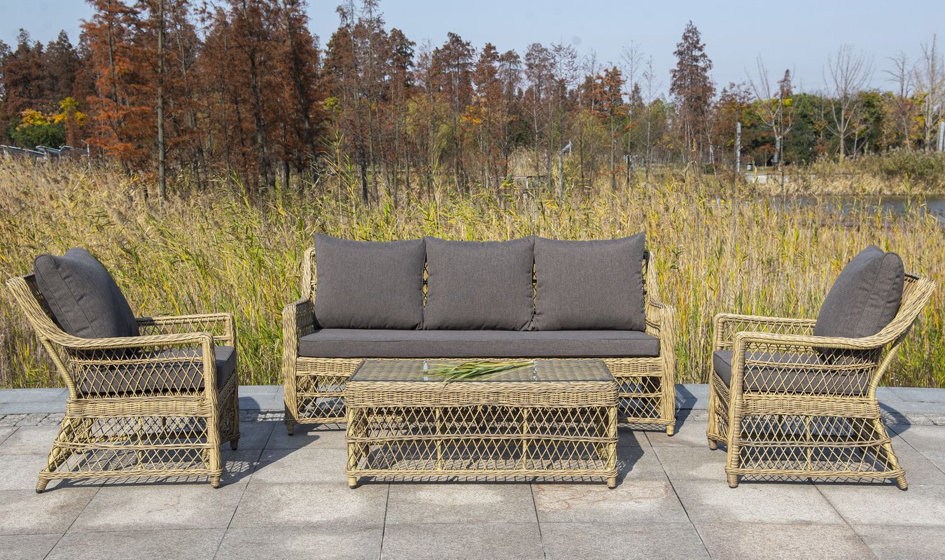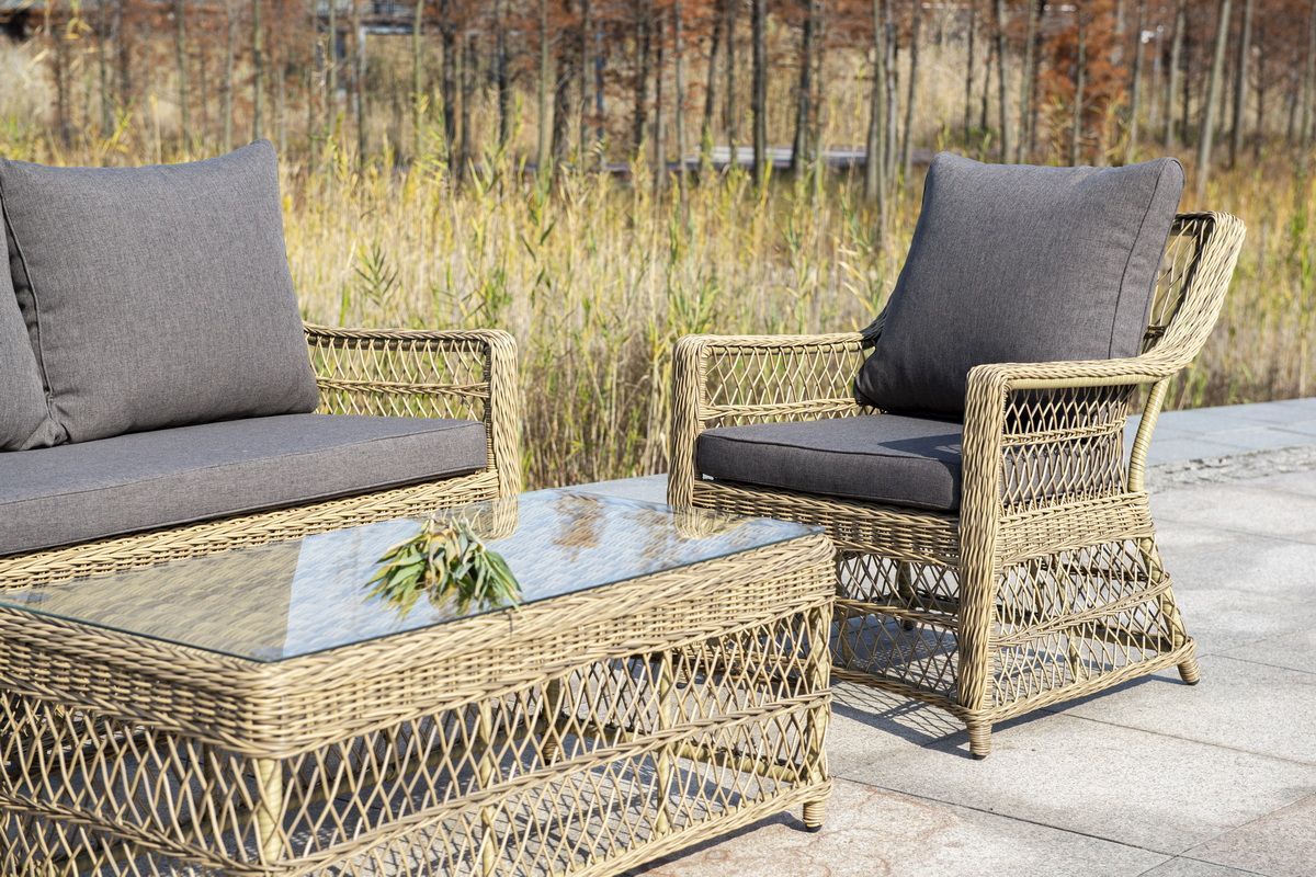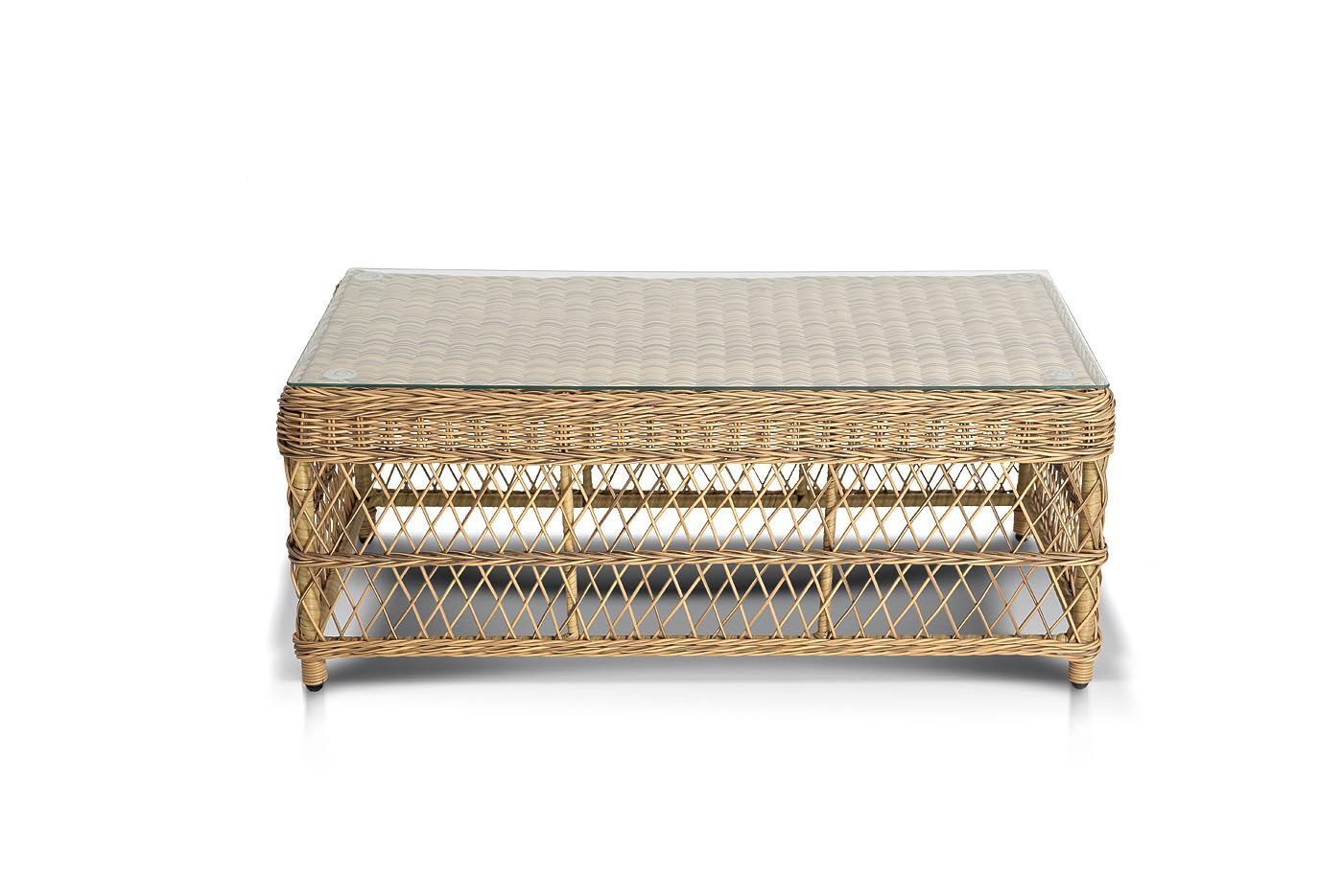Каркас изготолен из алюминия, который гарантирует устойчивость при размещении на любой поверхности. В качестве декоративного элемента выступает ручная оплетка на основе круглого искусственного ротанга, представленного в натуральном соломенном оттенке.