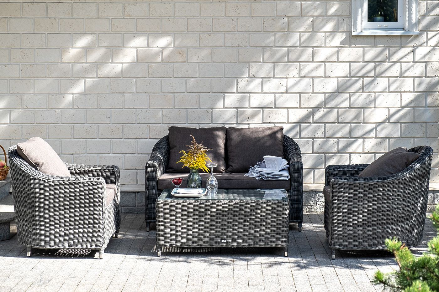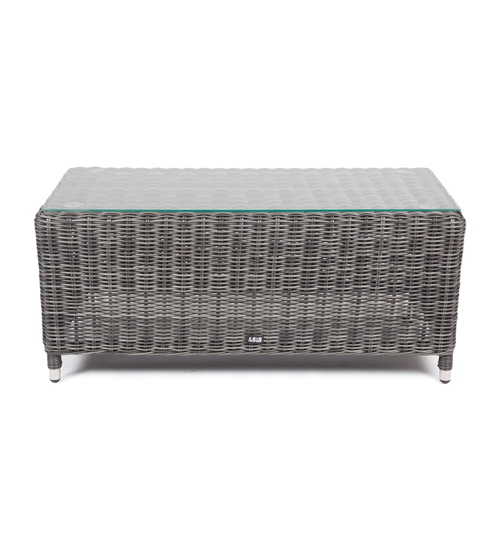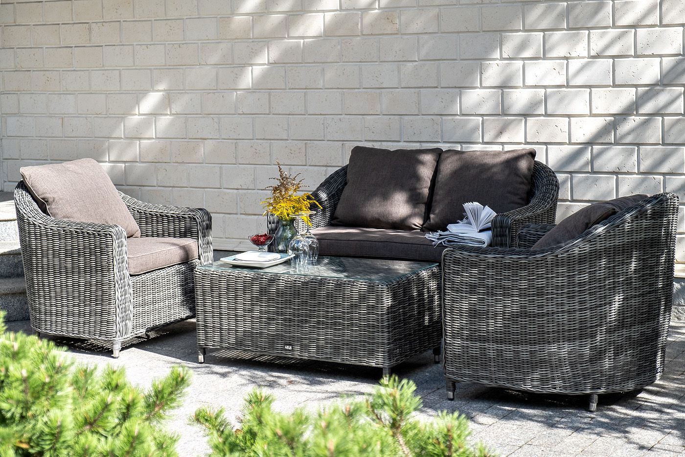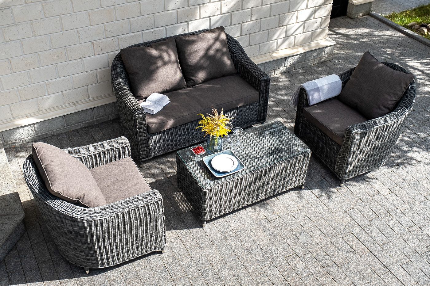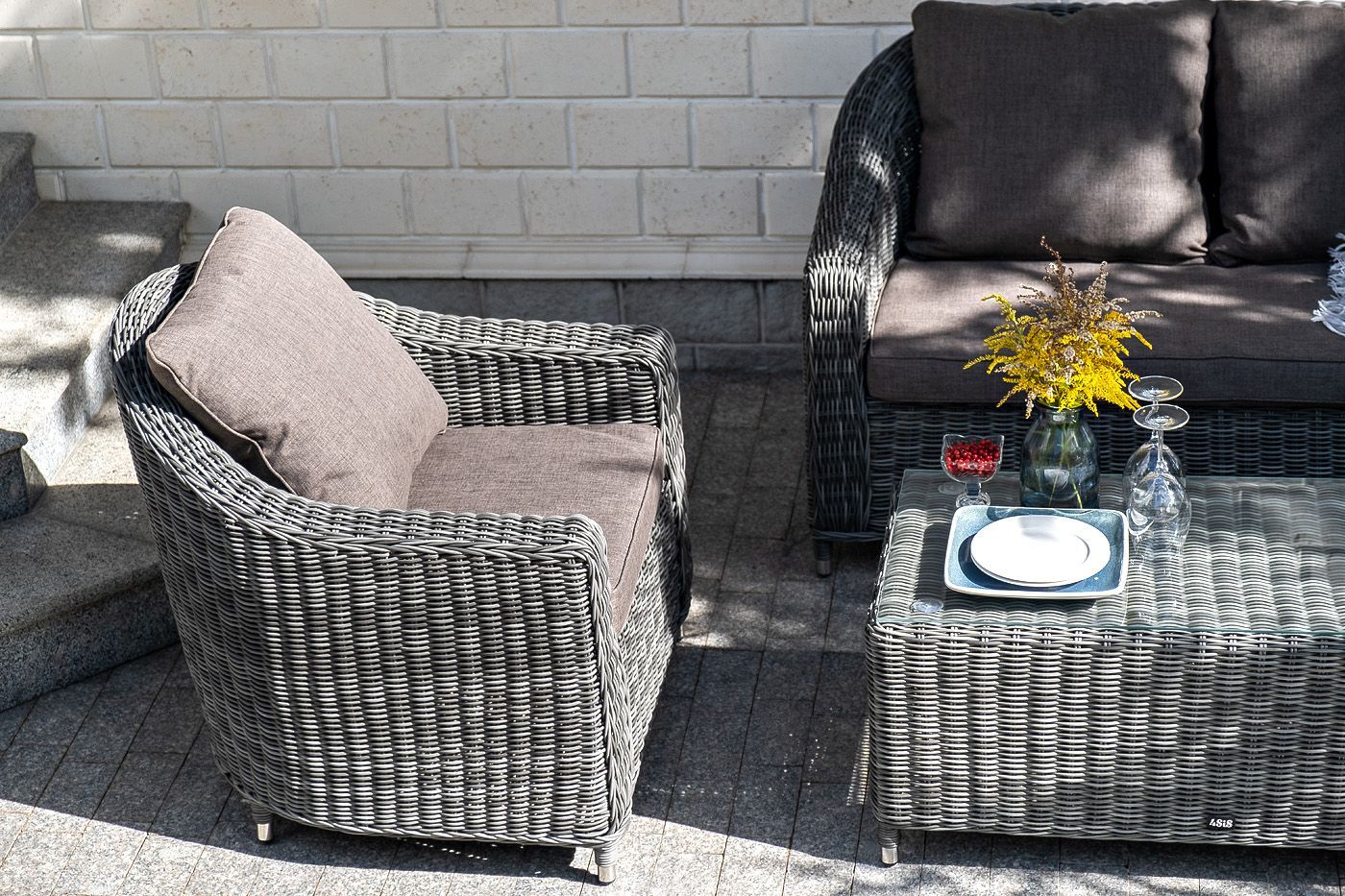 В основе мебели находится алюминиевый каркас высокой прочности. Декоративной составляющей является ручная круглая оплетка, которая выполнена из искусственного ротанга. Столик представлен в цвете "графит".