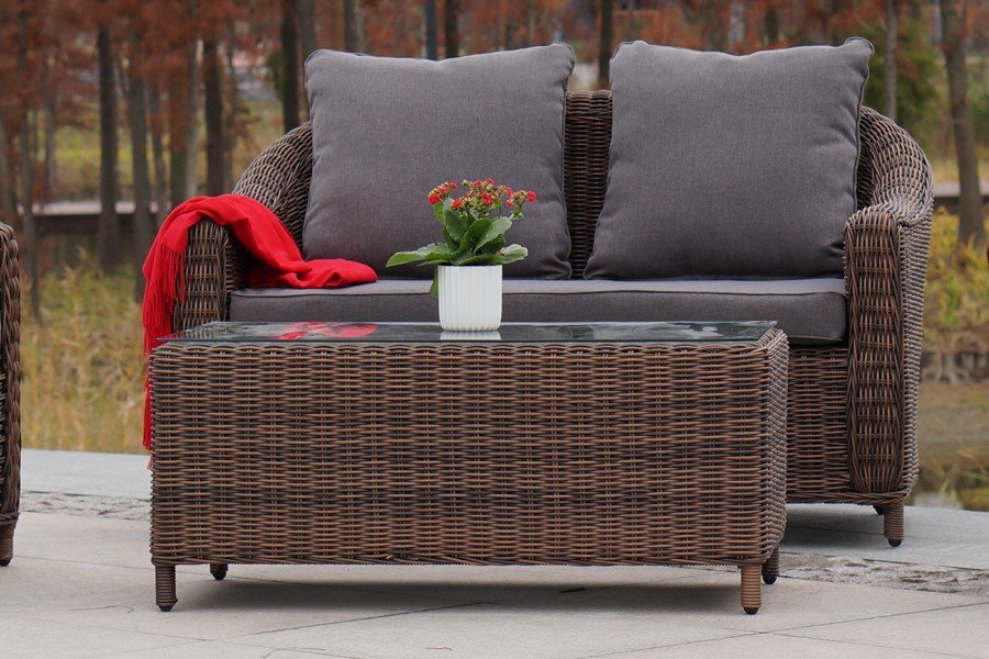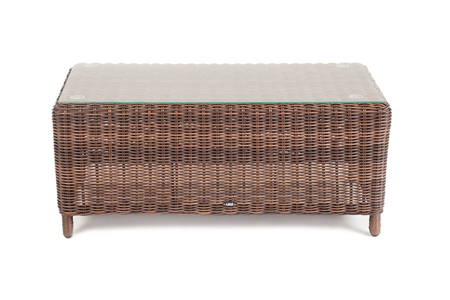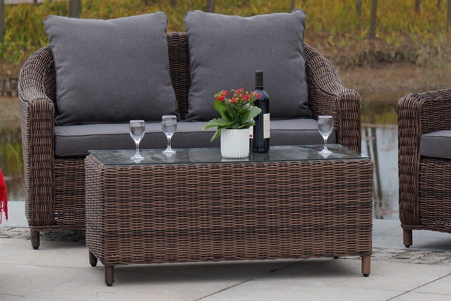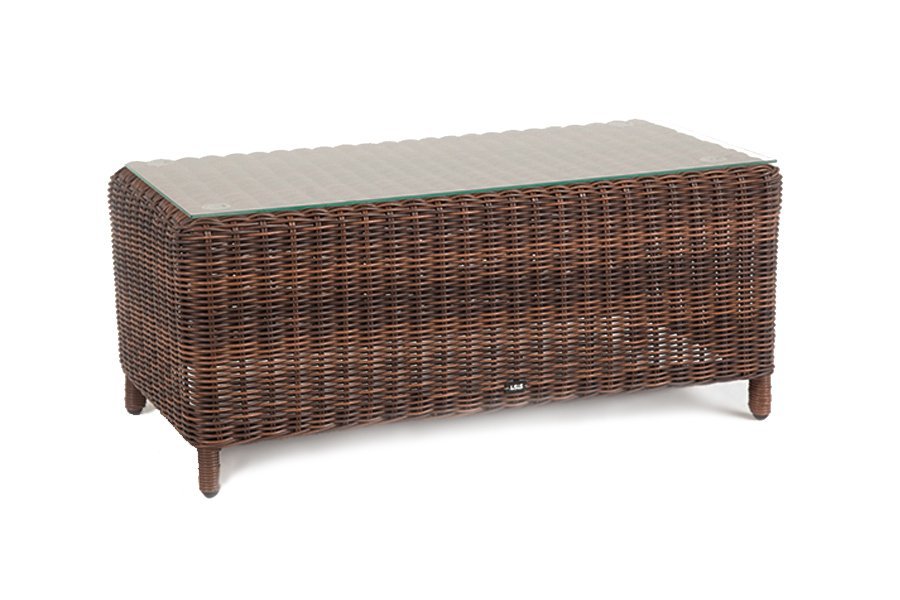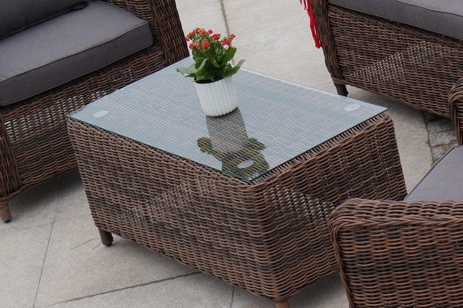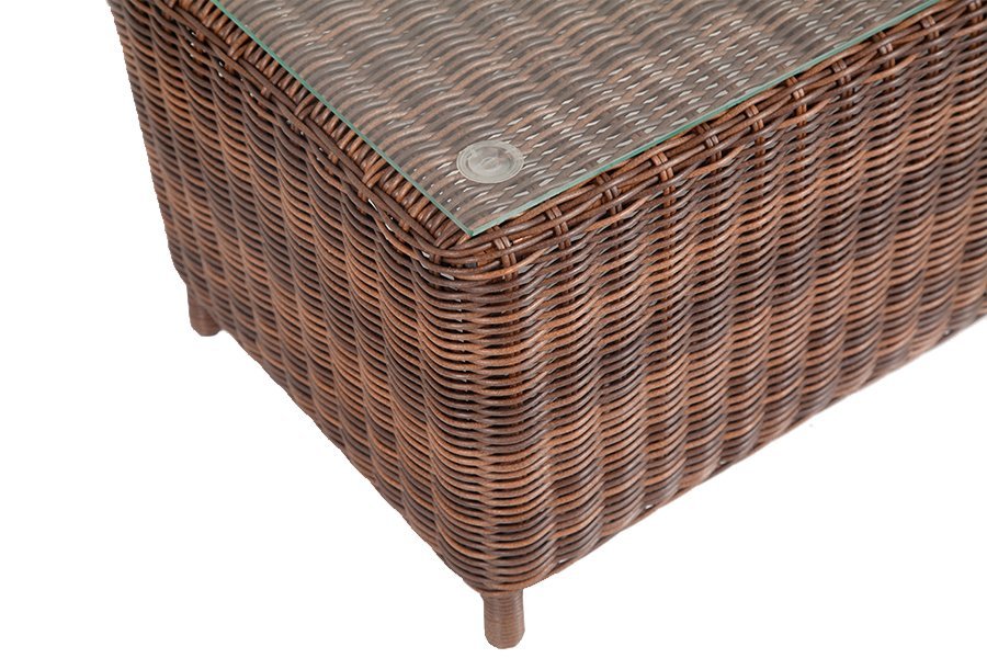 В основе мебели находится алюминиевый каркас высокой прочности. Декоративной составляющей является ручная круглая оплетка, которая выполнена из искусственного ротанга. Столик представлен в шоколадном цвете.