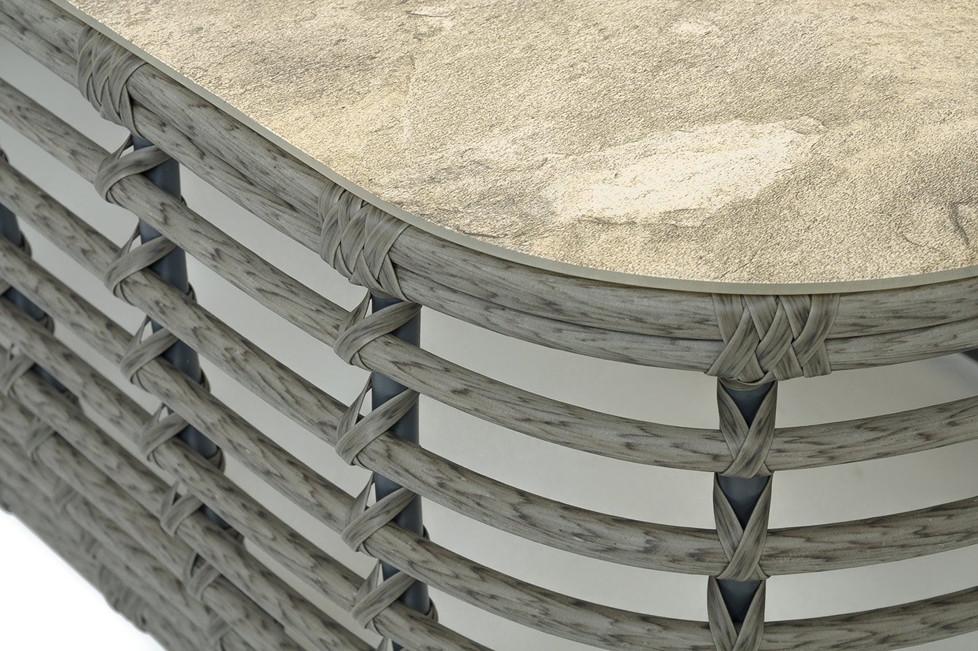 Каркас столика изготовлен из алюминия, вручную оплетенного круглым искусственным ротангом.
