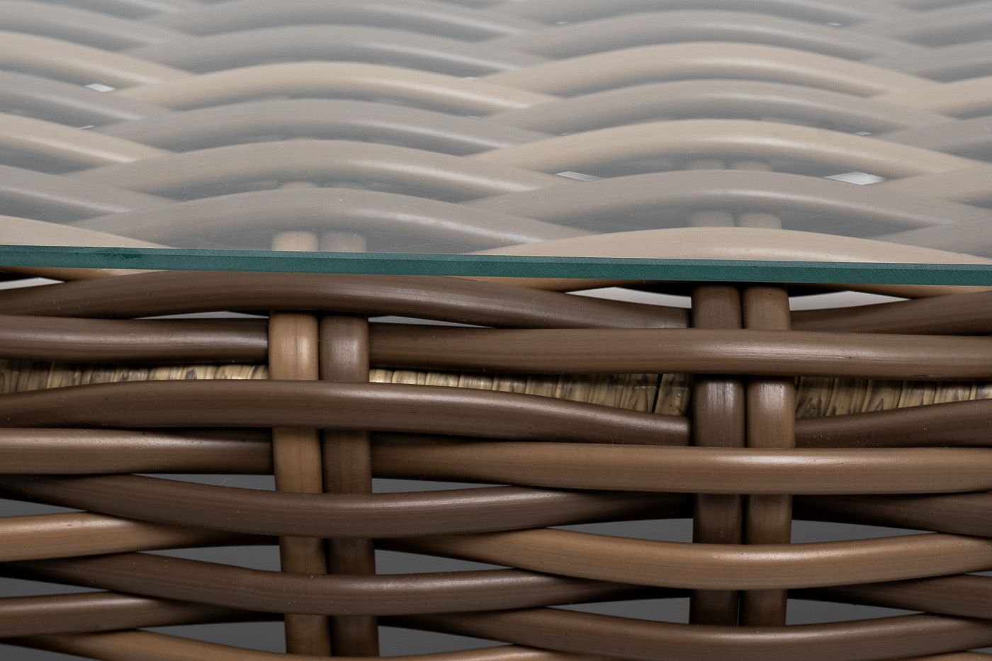 Каркас столика изготовлен из алюминия, вручную оплетенного круглым искусственным ротангом.