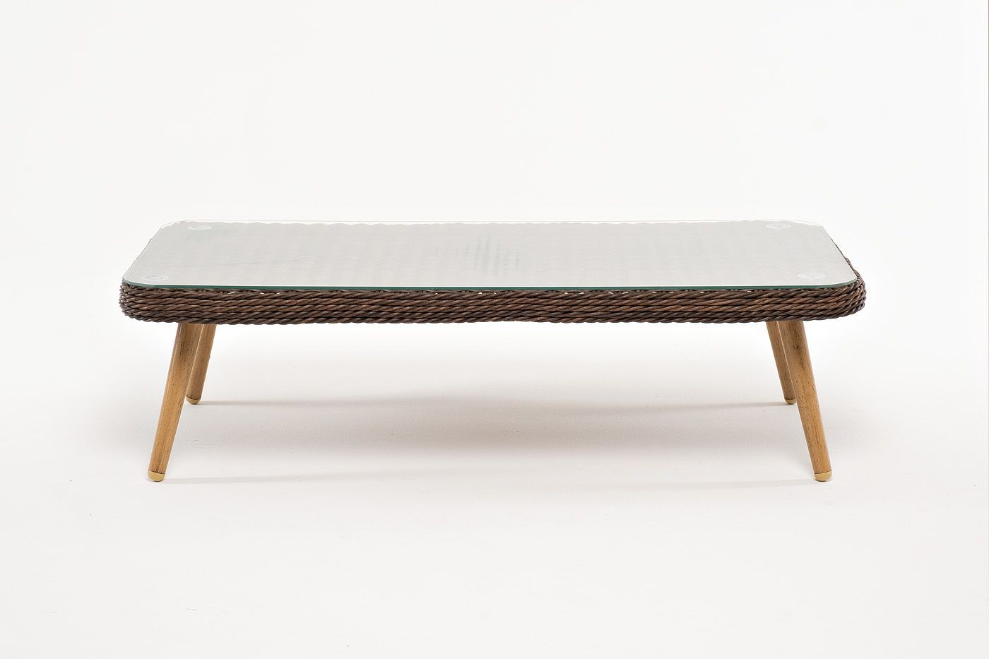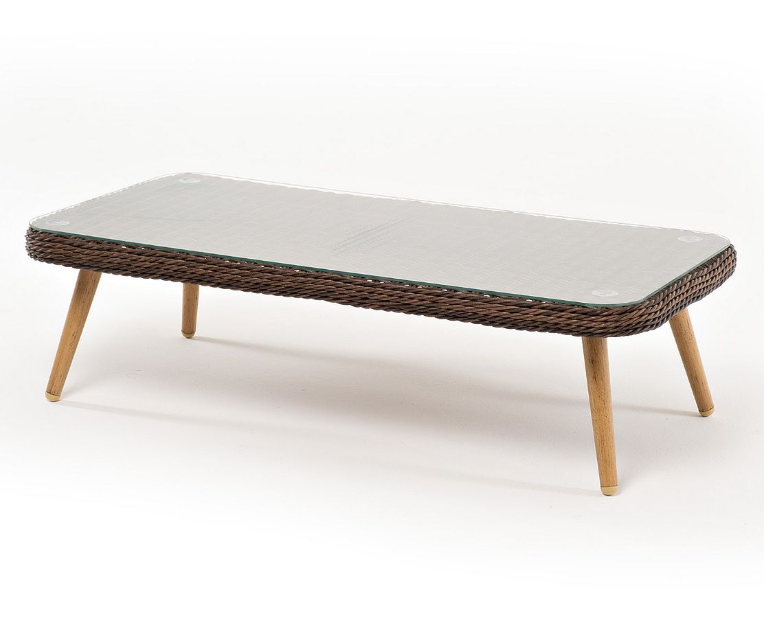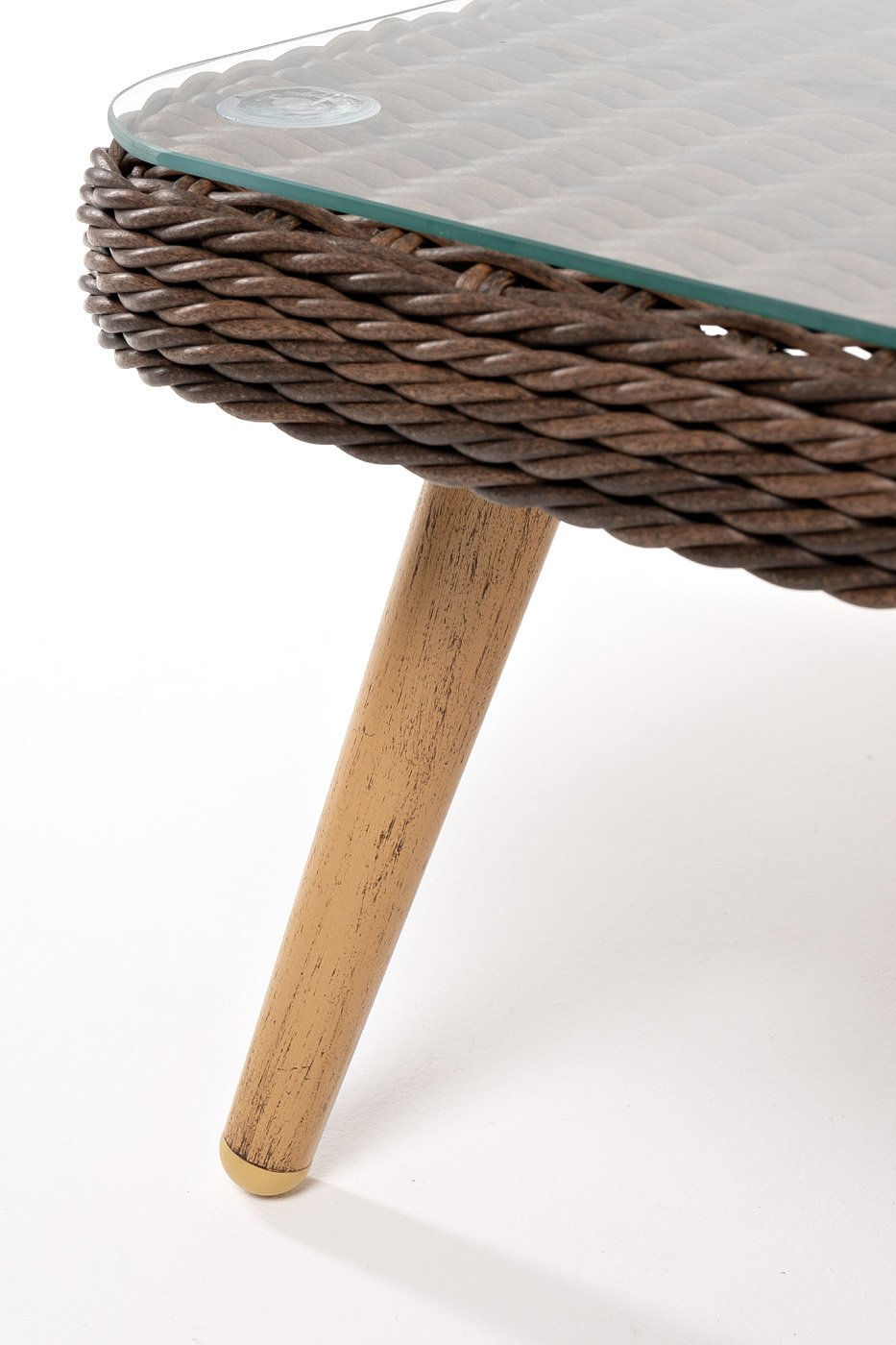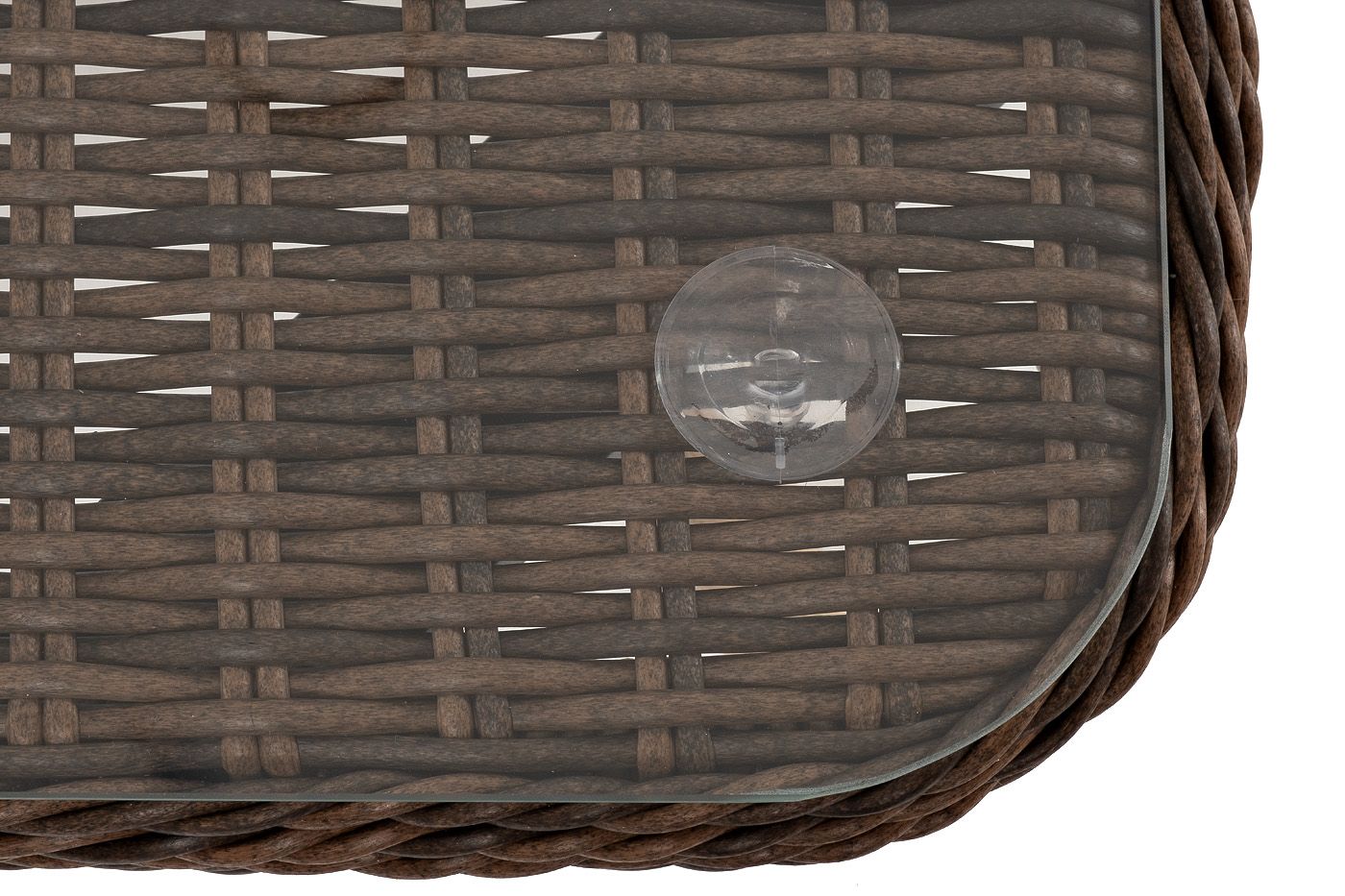 Столешницу из ротангового плетения дополняет прочное стекло, используемое для изготовления мебели. Стекло крепится с помощью держателей на силиконовых присосках и транспортируется в собранном виде.