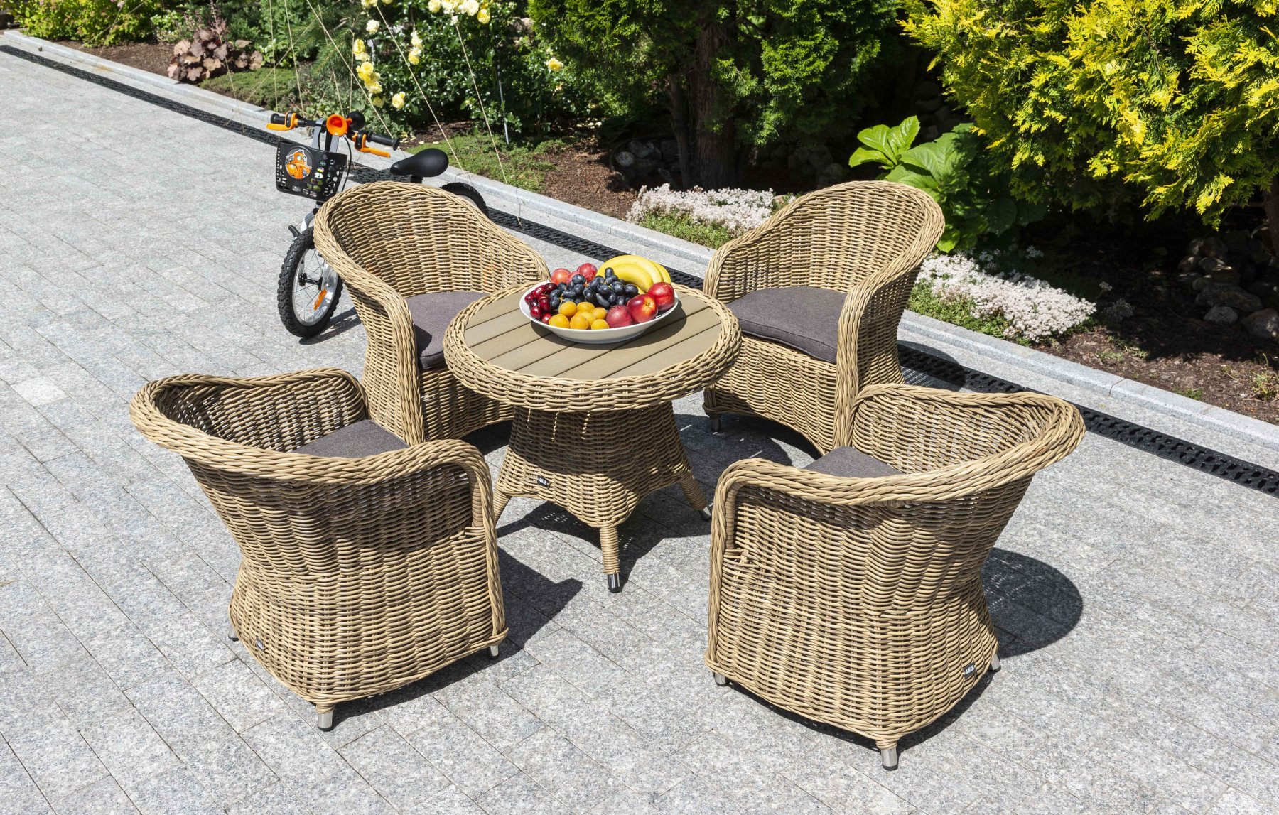 Размер модели – 600×600×480 мм. Столик располагает прочным каркасом, который изготовлен из качественного алюминия, отвечающий за надежное расположение конструкции. Весь каркас оплетен вручную круглым искусственным ротангом соломенного цвета.