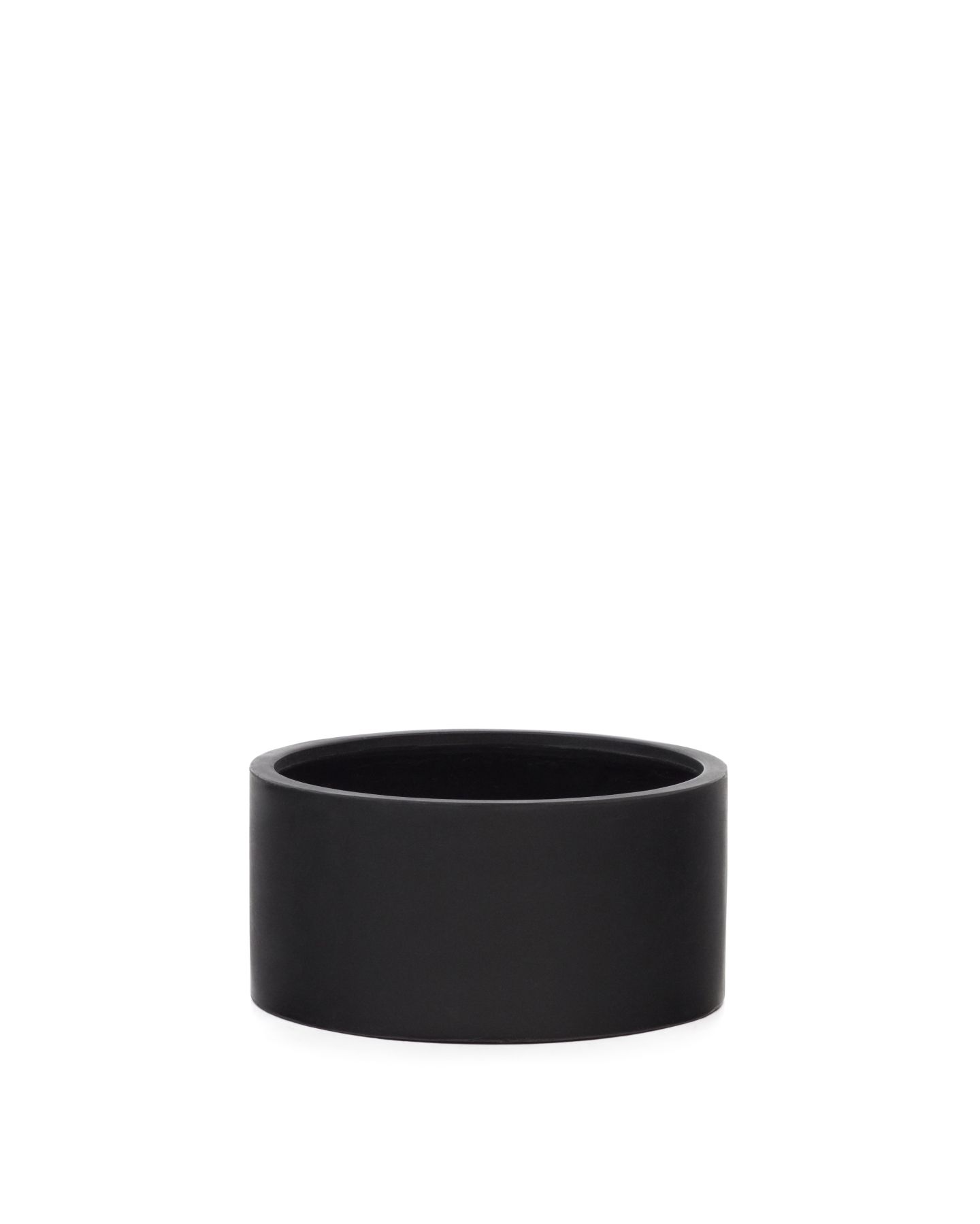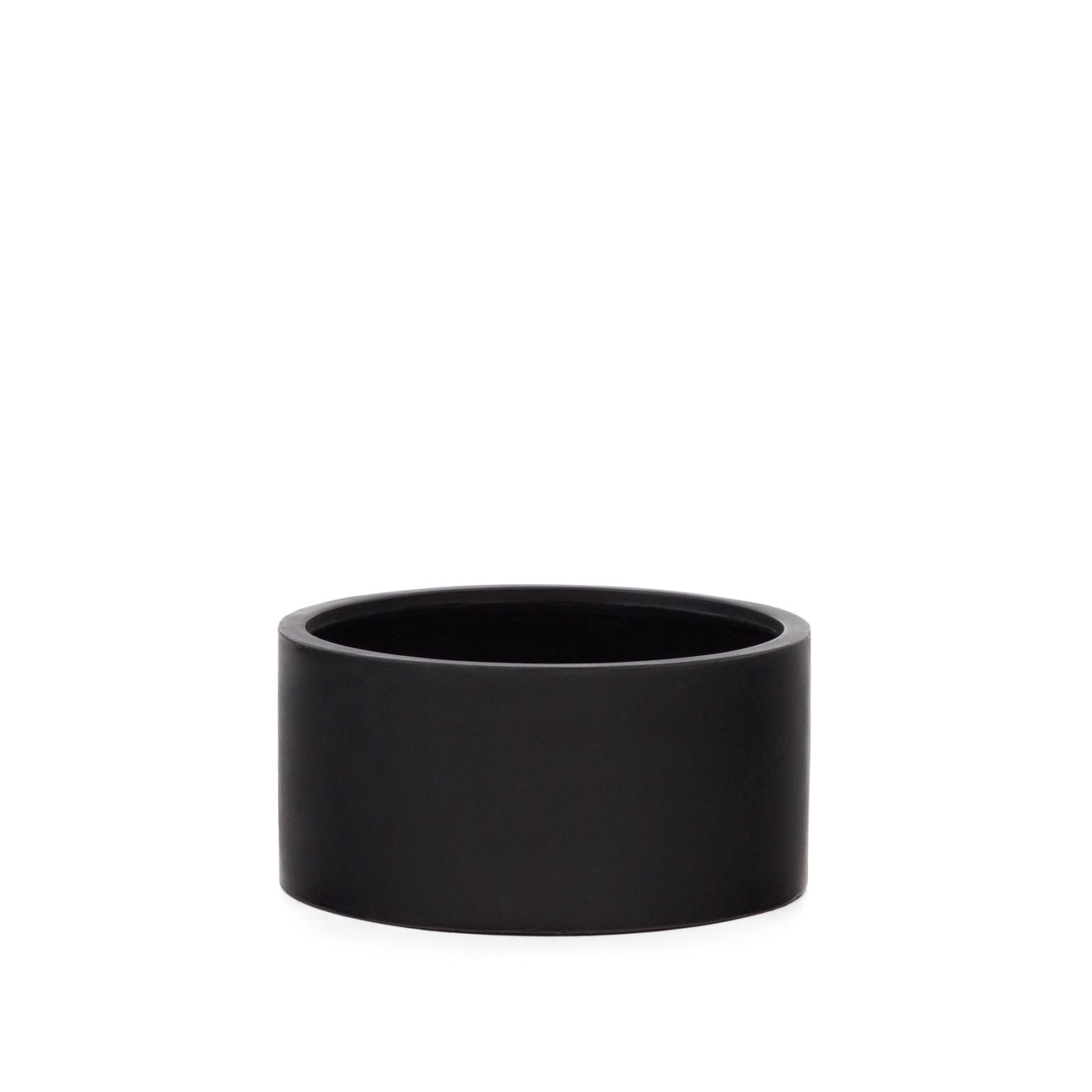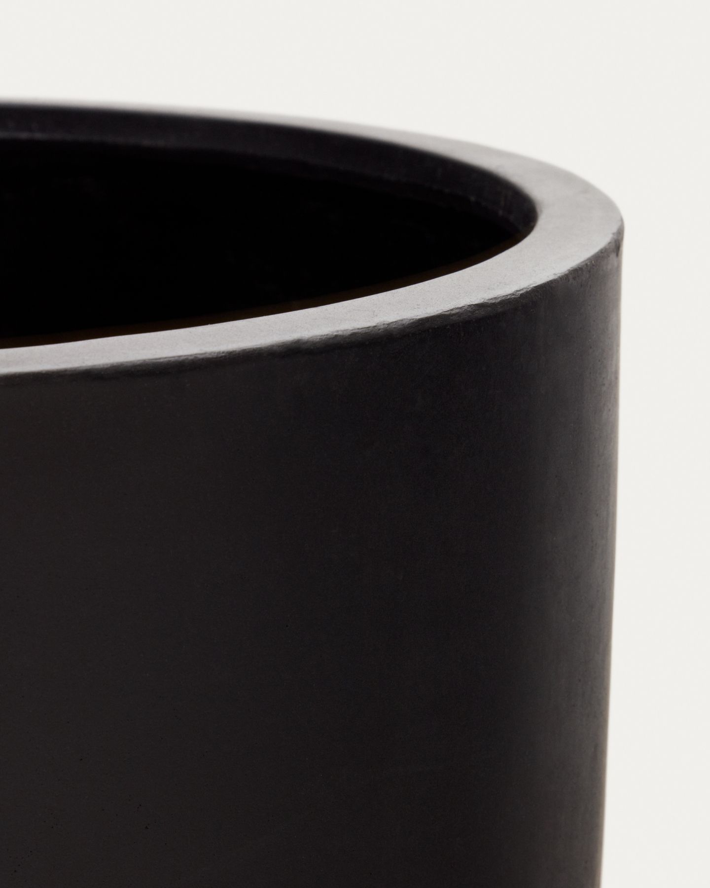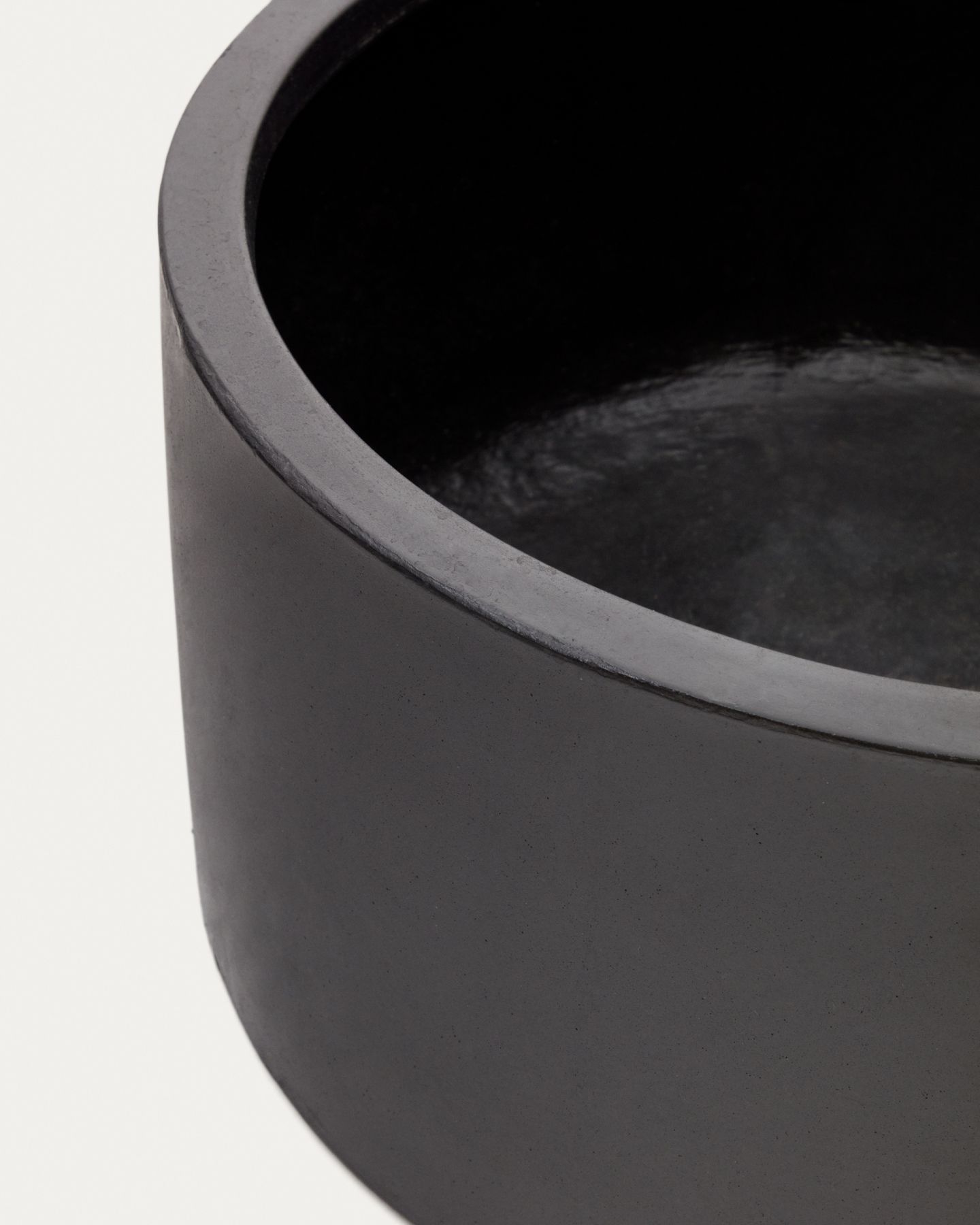 Кашпо имеет обтекаемую форму. Материал изготовления – цемент, с матовым покрытием черного цвета. Благодаря порошковой технологии нанесения краски, поверхность идеально ровная.