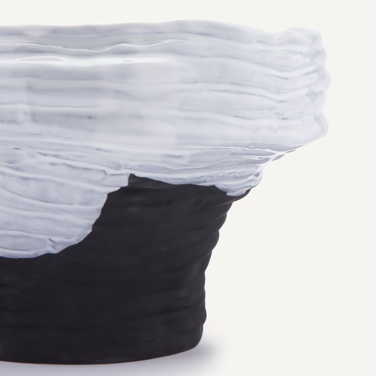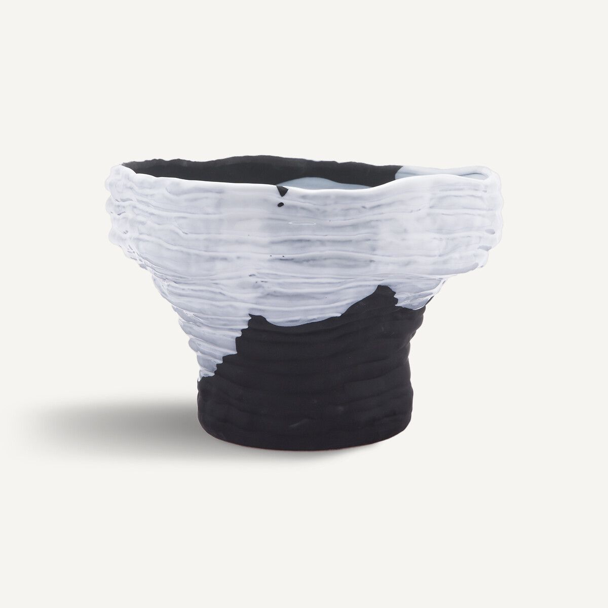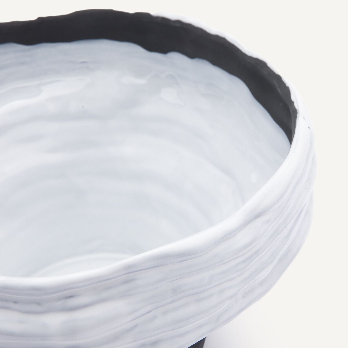 Белая блестящая эмаль наносится на поверхность чаши из черной матовой керамики.