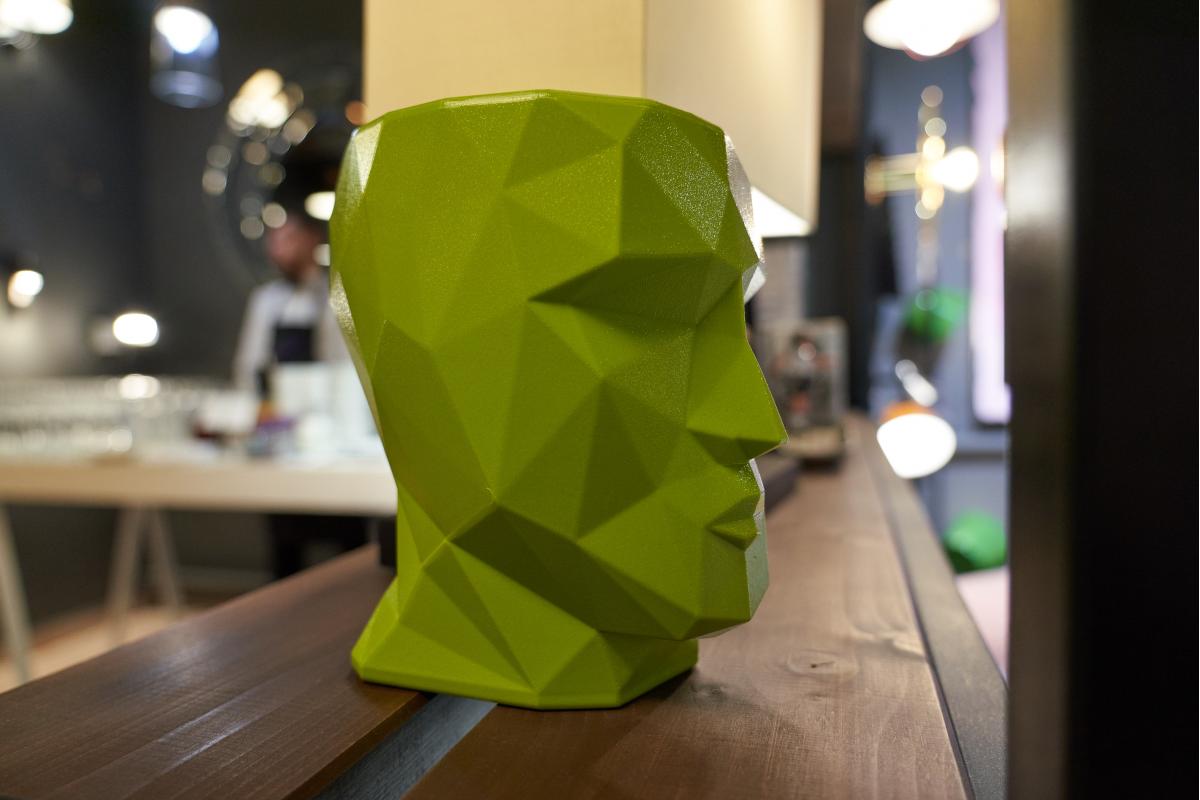 Кашпо выполнено в форме головы со скошенной «теменной» частью. Несмотря на то, что материал изготовления — пластик, создается ощущение, что изделие выполнено из гипса. Такого эффекта удалось добиться благодаря скульптурной технике изготовления с особой огранкой, схожей с обработкой драгоценных камней.