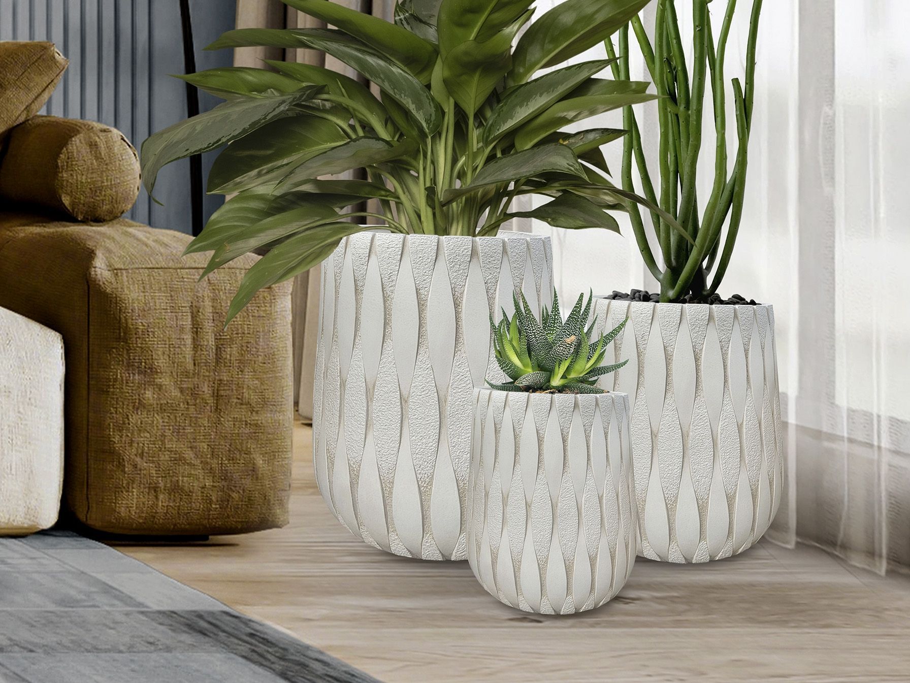 три кашпо из стекловолокна и смолы Fiberclay, отделка античный бежевый. Для использования в помещении и на улице. Большое. Ø51x60см. Среднее. Ø40x48см. Маленькое. Ø29x36см.
