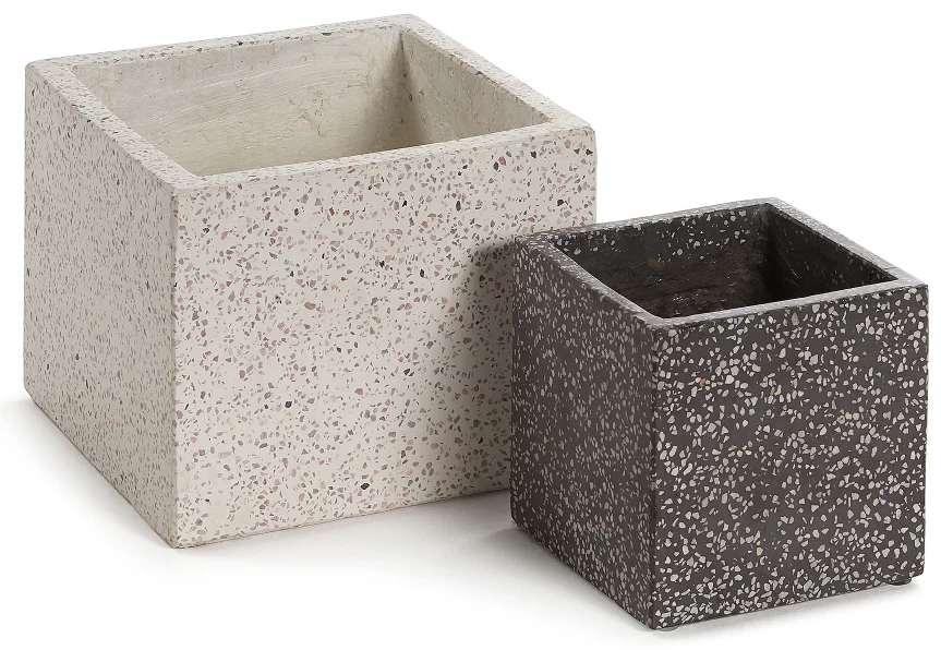 Терраццо, абсолютно модный материал, является звездой горшков Bransc. Этот набор состоит из двух квадратных горшков: большего 26х26х21 см с белым фоном и меньшего 17х17х17 см с серым фоном. Они идеально подходят для террасы, потому что могут противостоять изменяющейся погоде, но они также великолепны в гостиной, поскольку их дизайн соответствует экологическому тренду, привносящему природу в дом.