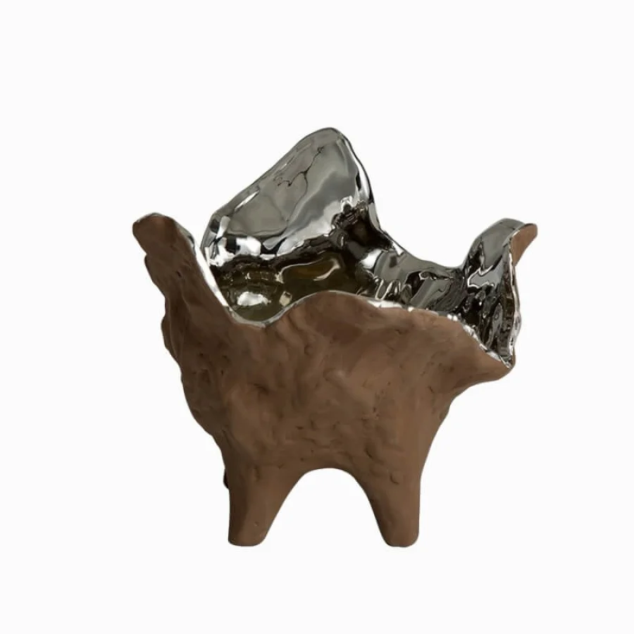 Выполненная из керамики в теплых коричневых тонах с серебряными акцентами, она словно обнимает плоды, создавая эффектный контраст и подчеркивая их естественную красоту.