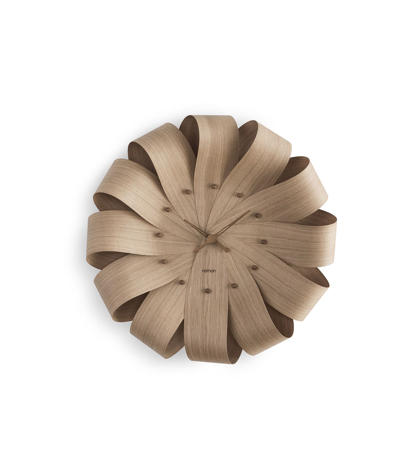 Оригинальные настенные часы от Nomon выполнены в форме цветка. Сам циферблат может быть полностью из шпона дуба или американского ореха или сразу из двух видов шпона. Стрелки могут быть из массива ореха или дуба, а также из полированной латуни.