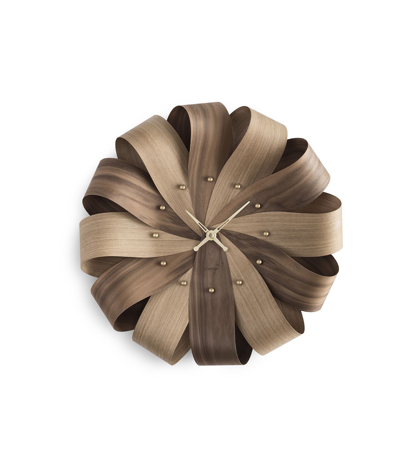 Оригинальные настенные часы от Nomon выполнены в форме цветка. Сам циферблат может быть полностью из шпона дуба или американского ореха или сразу из двух видов шпона. Стрелки могут быть из массива ореха или дуба, а также из полированной латуни.