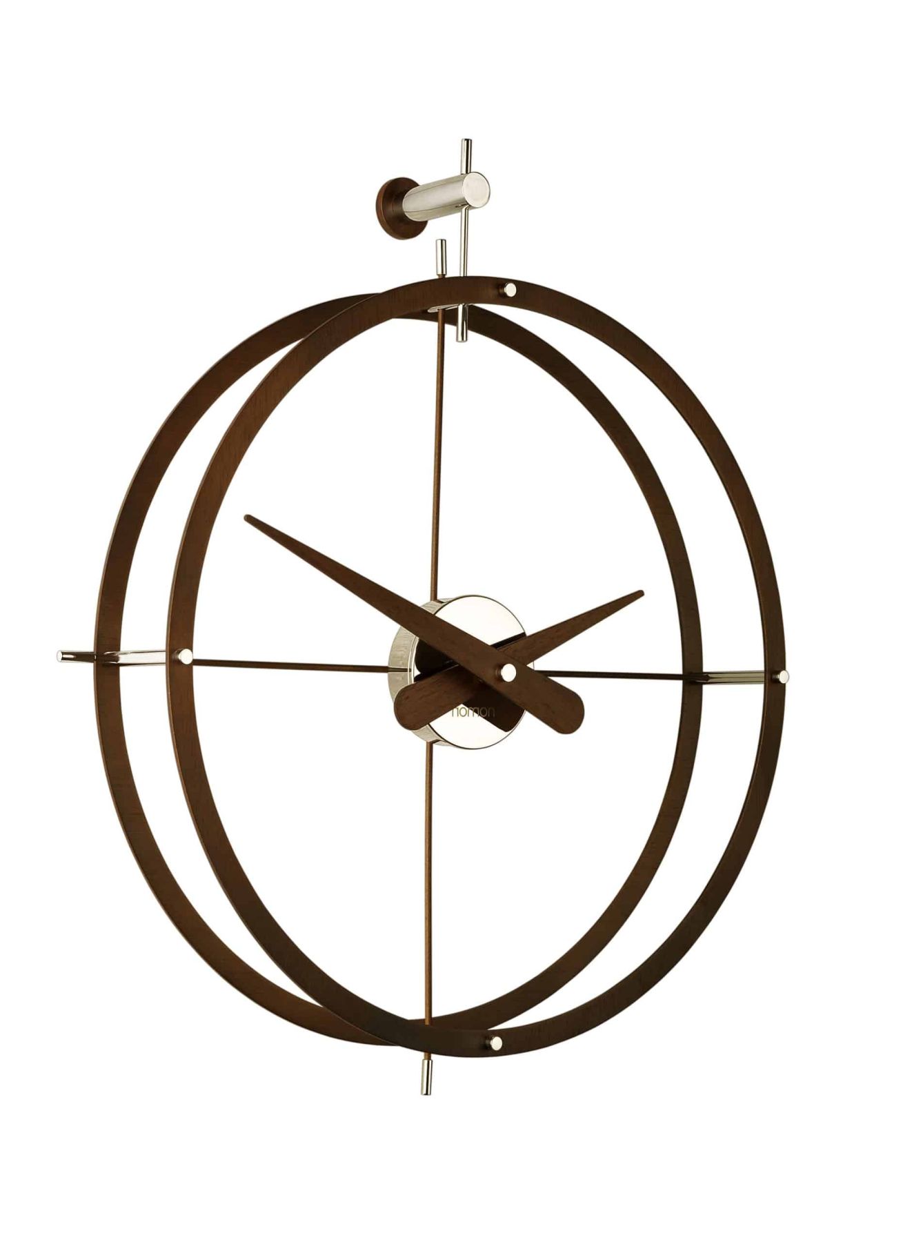 Часы с циферблатом в виде обруча — визитная карточка барселонского бренда Nomon: именно такая модель положена в основу его логотипа. Представляем вам часы на стену, которые являются одним из ярчайших представителей этого типа, — 2 Puntos.Миниатюрный круглый корпус выполнен из хромированной стали. Внутри него заключён совершенный часовой механизм UTS (Германия), который функционирует от батарейки AA 1,5 V.Вы можете купить настенные часы 2 Puntos с “циферблатом” и стрелками из стали или дерева. Во втором случае в качестве материала используется уникальная по своим свойствам древесина. Это дерево испанцы называют calabó, другим европейцам понятнее “африканский мускатный орех”. Он выглядит очень достойно даже на картинках в интернете, и мы искренне рекомендуем познакомиться с ним поближе в реальности.Общая длина конструкции с креплением — 53 см. Диаметр колец составляет 43 см.