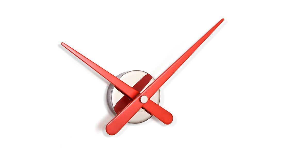 Настенные часы, выполненные их хромированной латуни и орехового дерева, окрашенного красным.