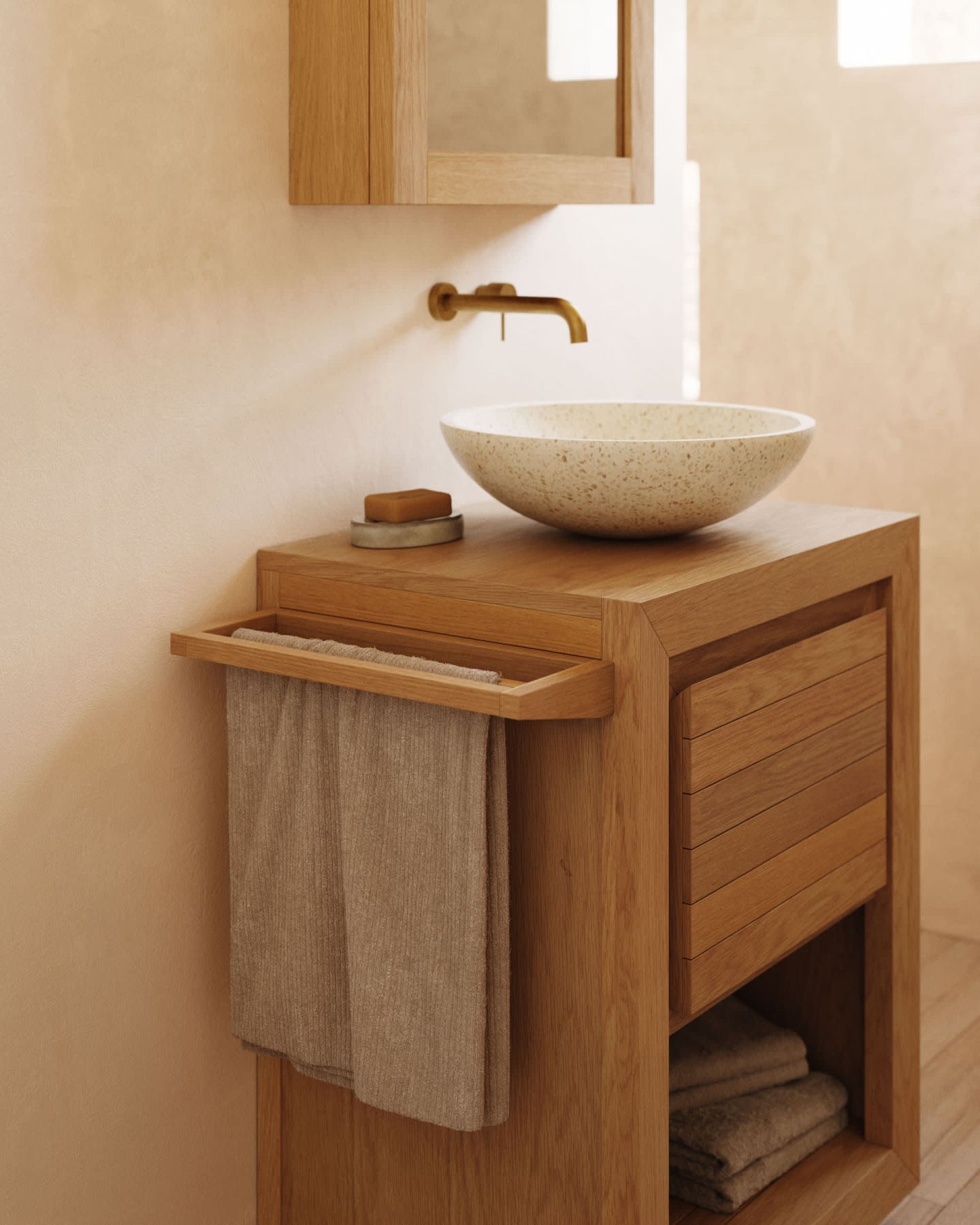 Коллекция Kenta изготовлена из массива тикового дерева, стойкого к влаге, так что вы можете расслабиться в собственном спа-центре с восточным дизайном, не выходя из дома. Это показывает, что ваша ванная комната тоже может быть стильной.