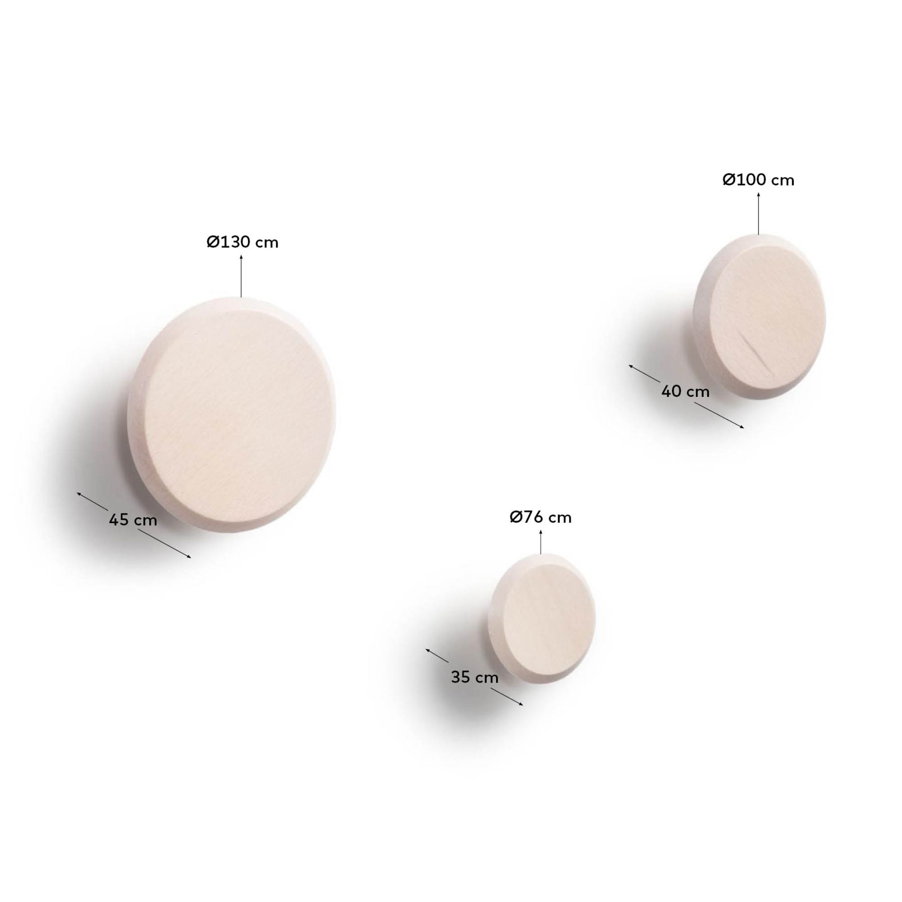 Набор Nadua разработан Ксавье Коркой из команды Kave Home. Набор из трех круглых вешалок разных размеров: Ø75 см, Ø100 см и Ø130 см. Они изготовлены из массива бука с натуральной отделкой, отличного цвета для любой стены. Они также экологичны, так как имеют сертификат PEFC, гарантирующий, что древесина поступает из устойчивых лесов. Дизайнерские детали, сделанные в доме, которые включают совместимые гвозди для кирпича и гипсокартона.