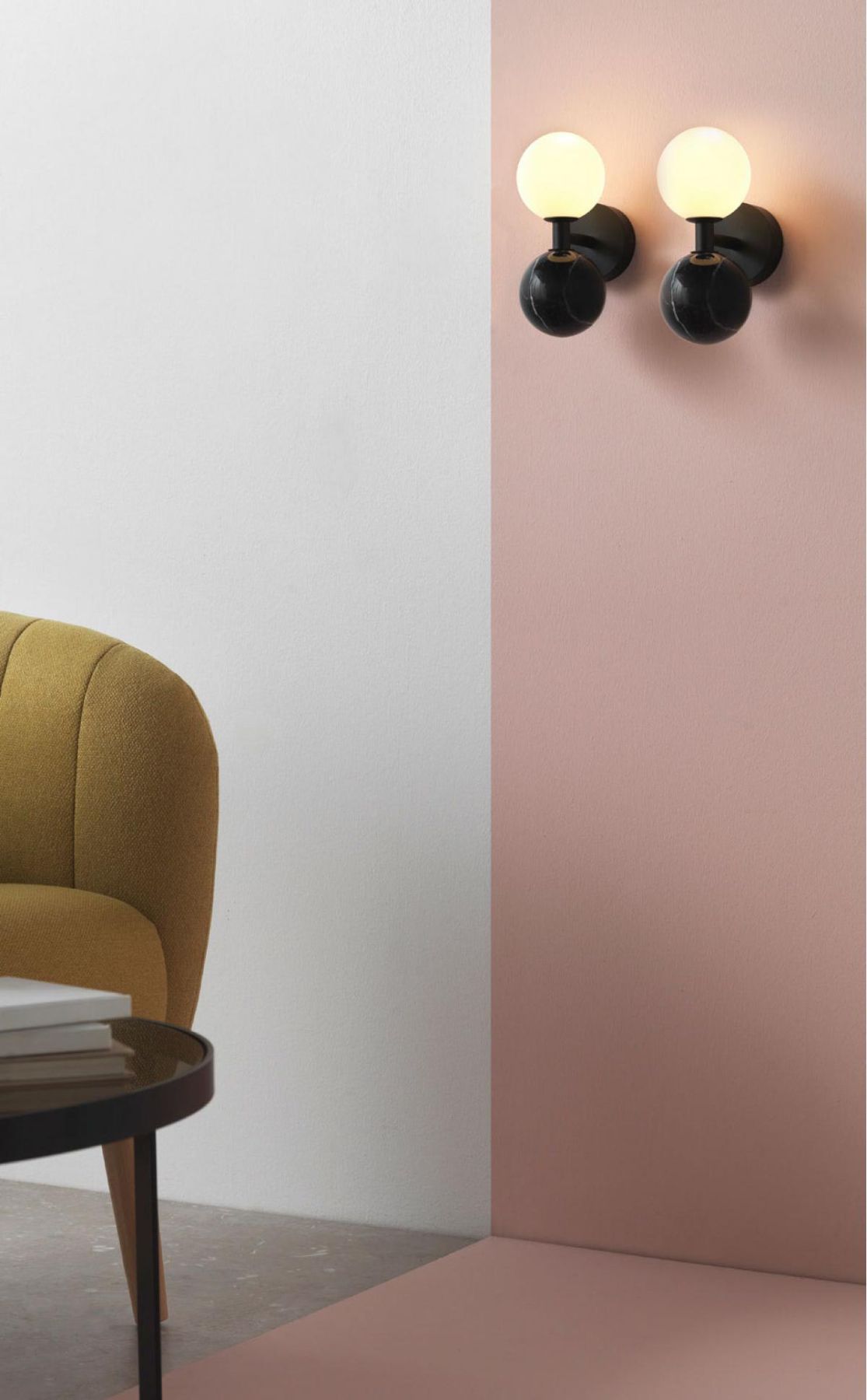 Настенный светильник состоит из плафона из стали черного или золотого цвета, опалового стекла и мраморной детали. Вы можете выбрать отделку мрамора между зеленым, белым и черным цветами.