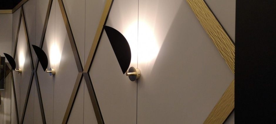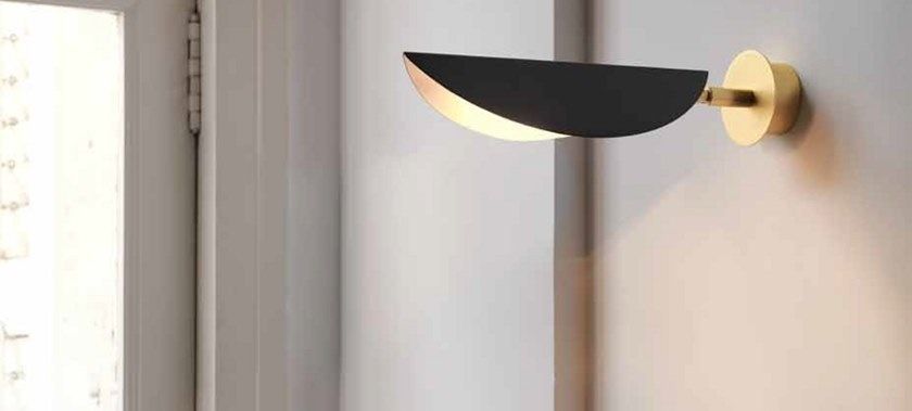 Настенный светильник, вдохновленный растительным дизайном, из стали с основанием и ножкой в матовом латунном цвете и гнутым стальным плафоном с матовым черным покрытием.