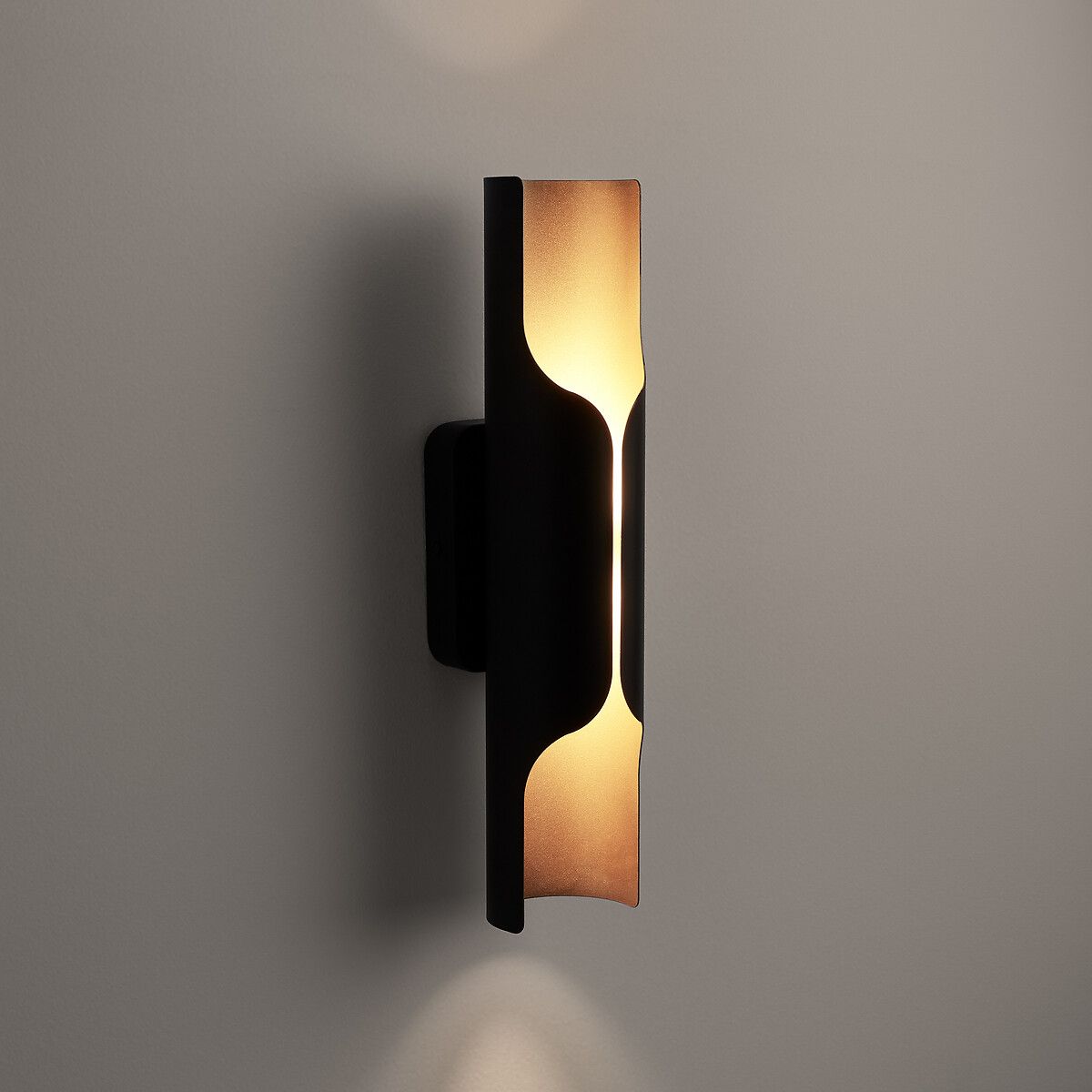 Верхняя часть рассеивает приглушенный свет, отражаемый снизу благодаря золотистому покрытию. Даже потушенный, встроенный светодиод создает красивое освещение. Бра маленького размера от AMPM.