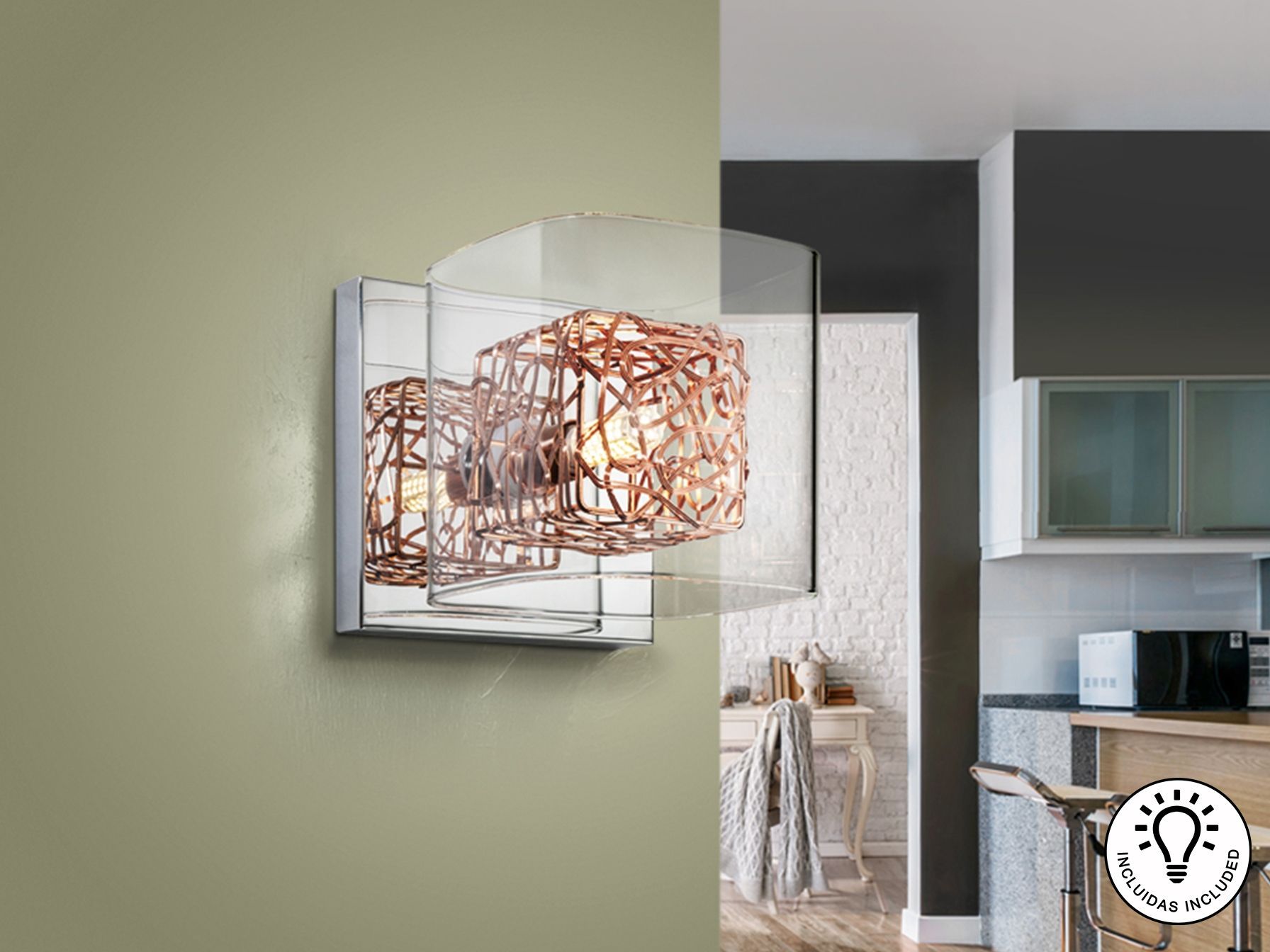 Настенный светильник с 1 лампой из металла с покрытием "хром", внешний плафон из формованного стекла, внутренний плафон в виде куба из медной проволоки.